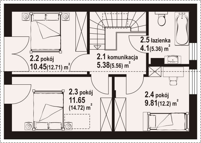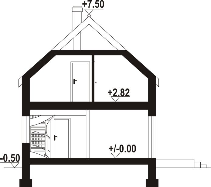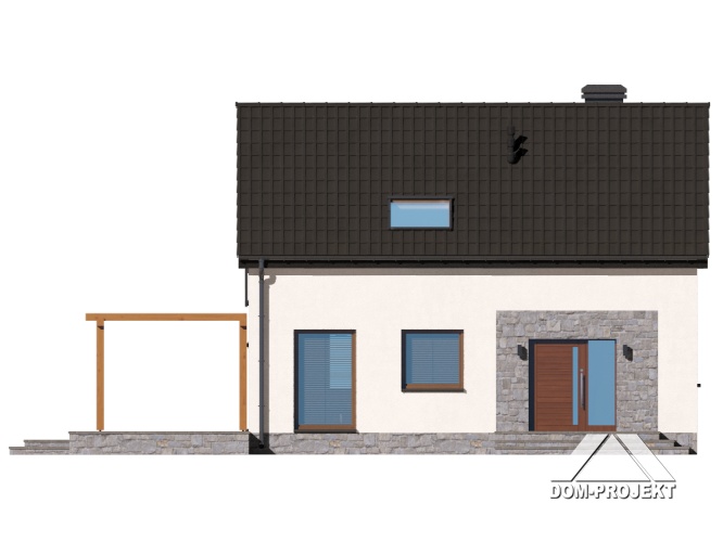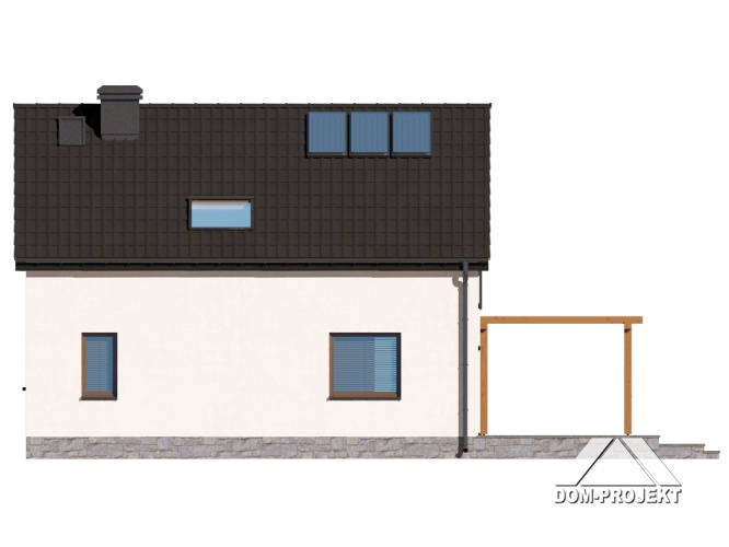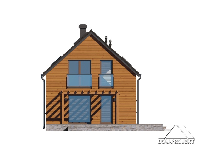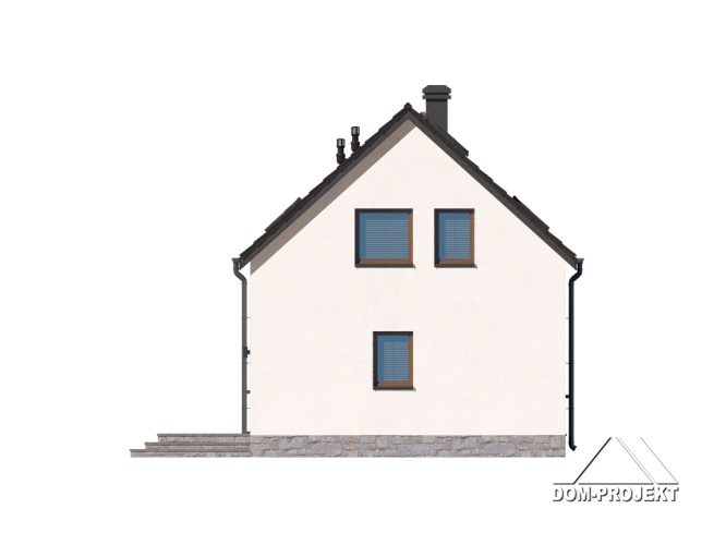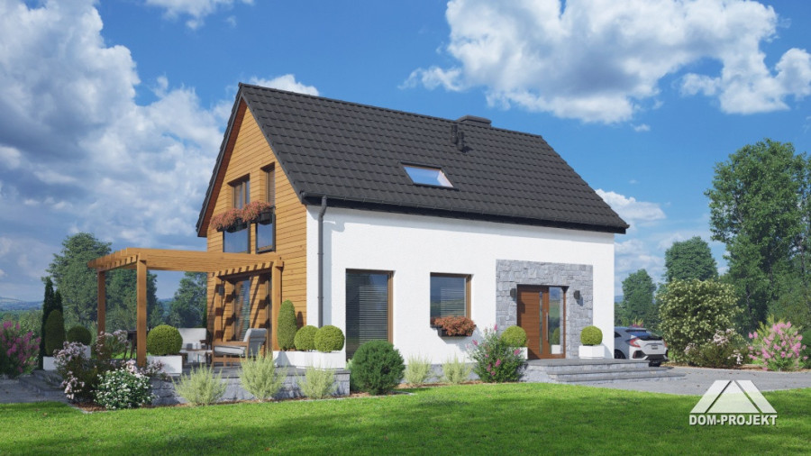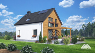 Dom z poddaszem użytkowym. Na parterze salon z aneksem kuchennym, kominkiem, wyjściem na taras i schodami na poddasze. Komunikacja, łazienka, pomieszczenie gospodarcze, wiatrołap. Na poddaszu trzy pokoje, łazienka, komunikacja. Zwarta bryła budynku oraz dach dwuspadowy sprzyjają szybkiej i taniej budowie oraz niskim kosztom eksploatacji.
