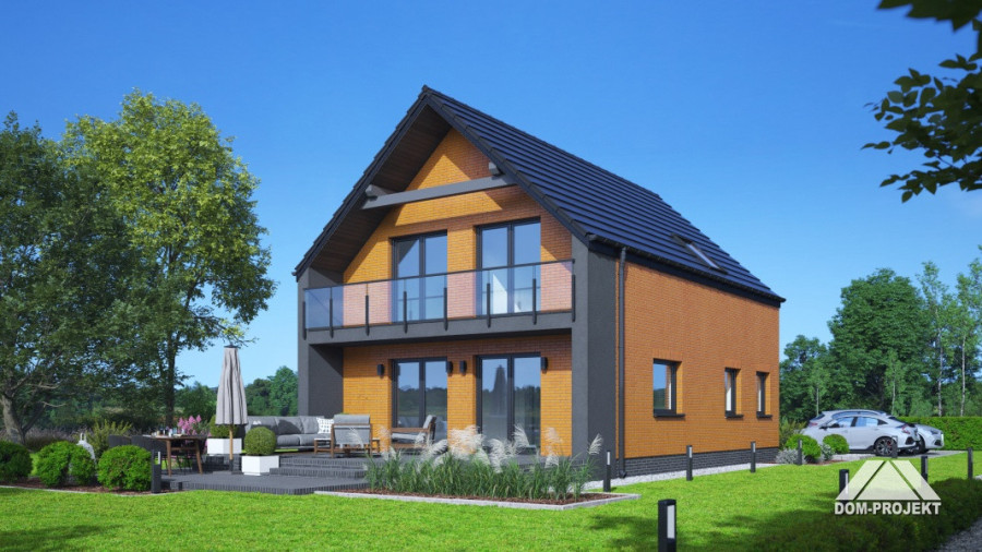 Dom z poddaszem użytkowym. Na parterze salon z aneksem kuchennym oraz wyjściem na taras. Pokój do pracy, kotłownia, wiatrołap, łazienka, spiżarka. Na poddaszu cztery pokoje, łazienka, wc, komunikacja. Balkon dostępny z dwóch pokoi. Zwarta bryła budynku oraz dach dwuspadowy sprzyjają szybkiej i taniej budowie oraz niskim kosztom eksploatacji.
