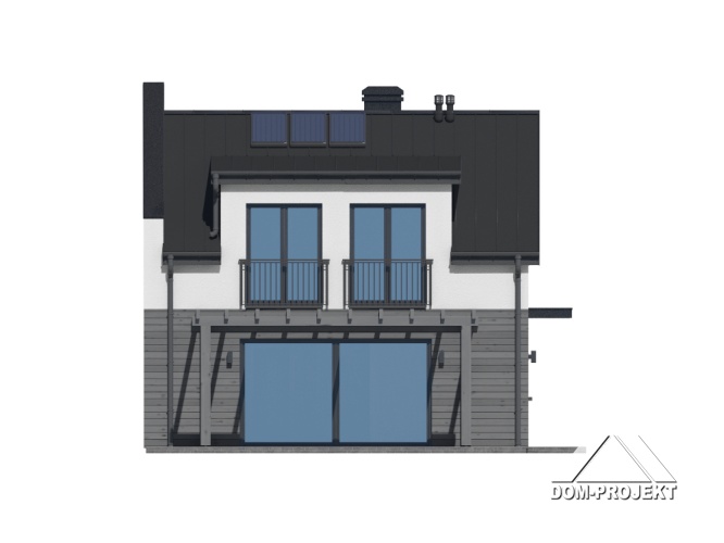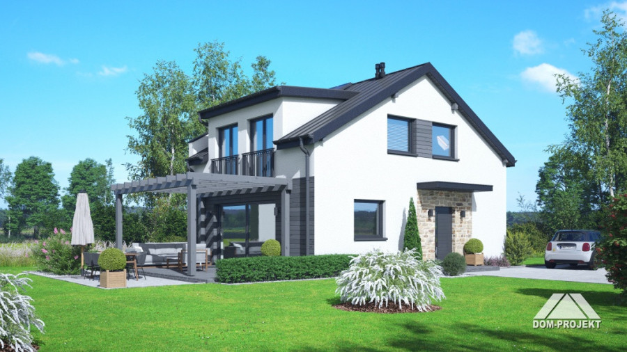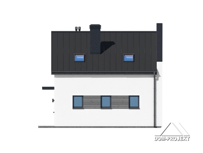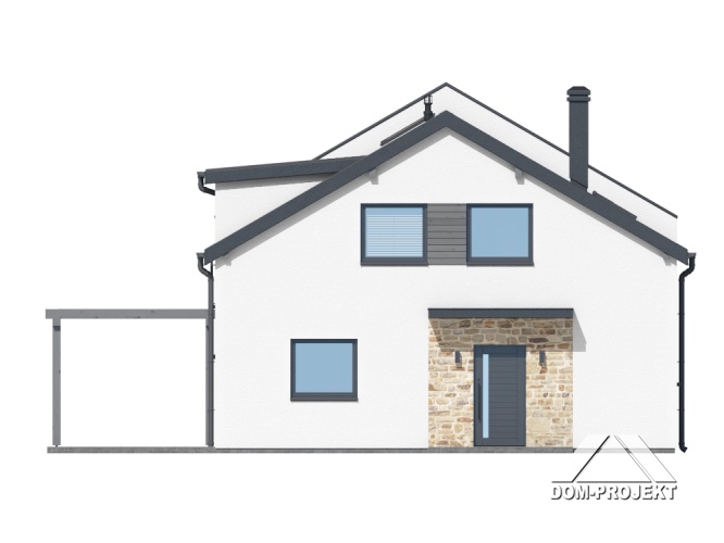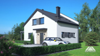 Dom z poddaszem użytkowym. Na parterze salon z aneksem kuchennym, wyjściem na taras i schodami na poddasze. Komunikacja, łazienka, pralnia, kotłownia, wiatrołap. Na poddaszu trzy pokoje, łazienka, komunikacja. Zwarta bryła budynku oraz dach dwuspadowy sprzyjają szybkiej i taniej budowie oraz niskim kosztom eksploatacji.