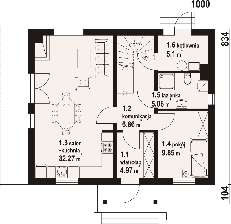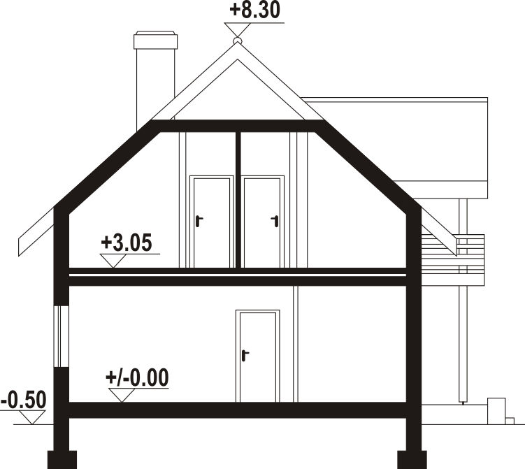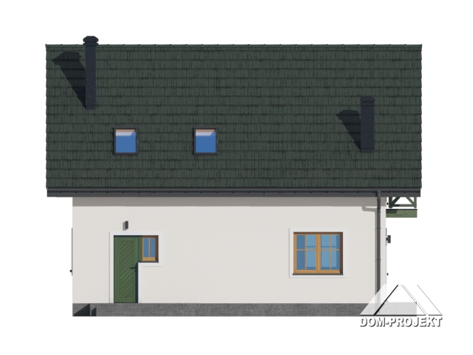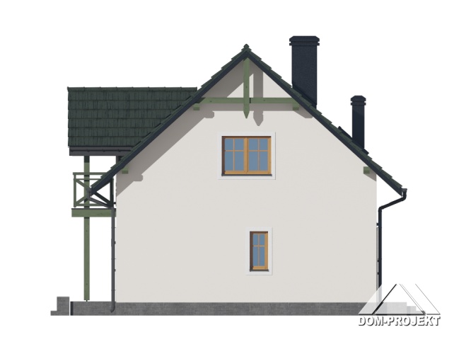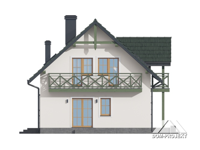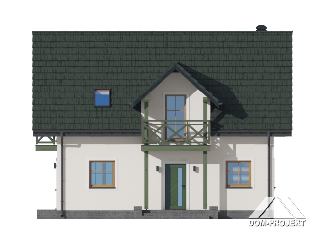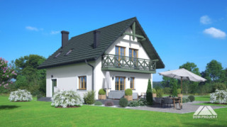 Dom w konstrukcji szkieletu drewnianego. Na parterze salon z kuchnią, kominkiem oraz wyjściem na taras. Pokój, wiatrołap, komunikacja, łazienka, kotłownia. Na poddaszu trzy pokoje, komunikacja, łazienka, dwa balkony. Zwarta bryła budynku oraz dach dwuspadowy sprzyjają szybkiej i taniej budowie oraz niskim kosztom eksploatacji.