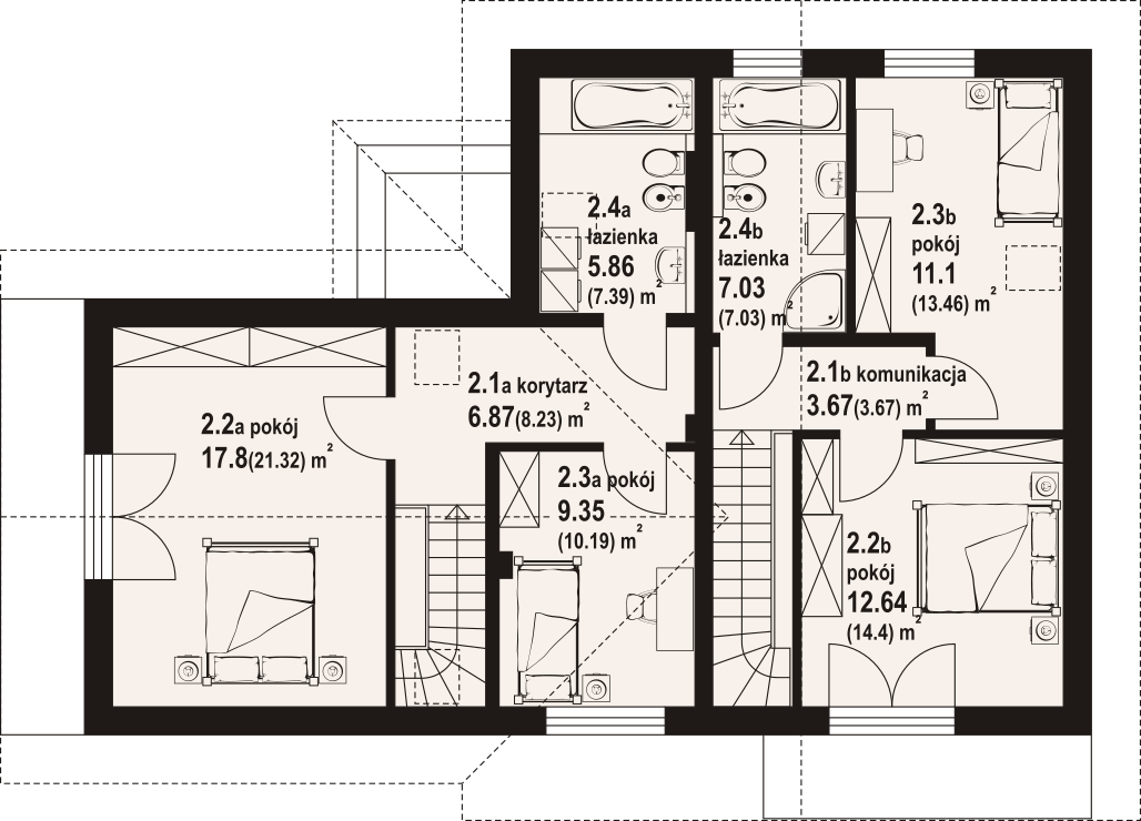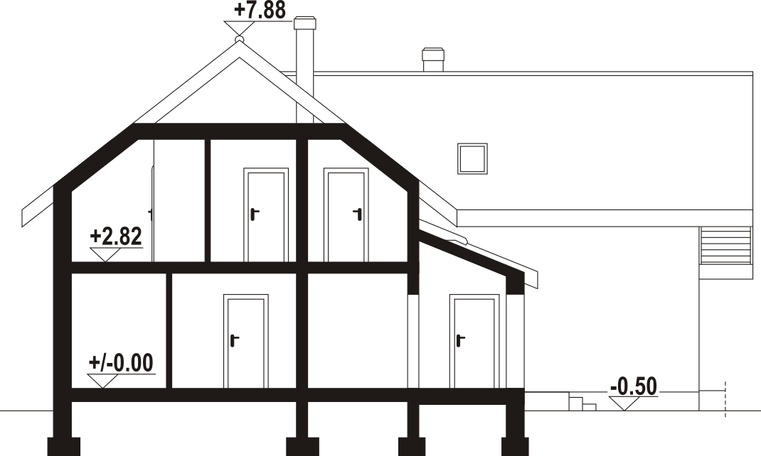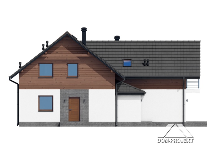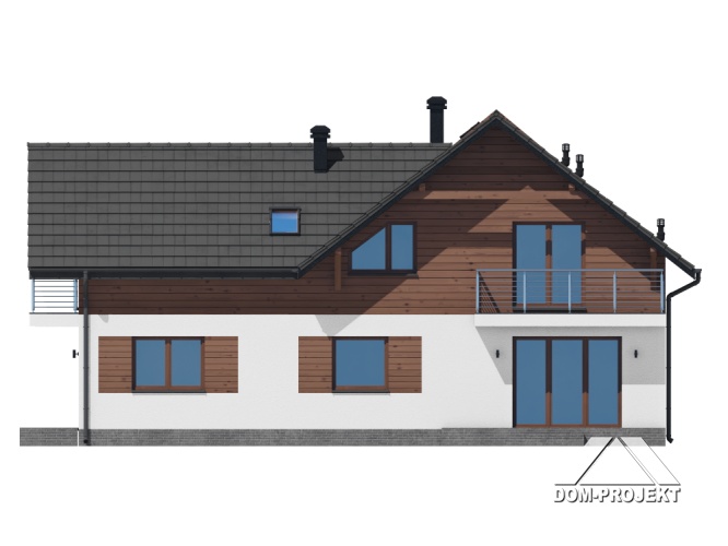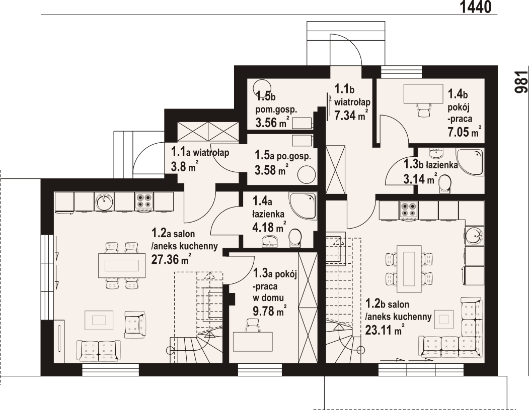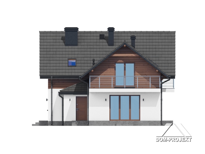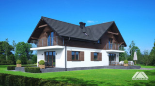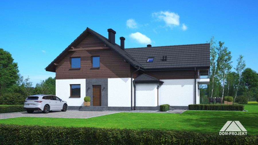 Dom z dwoma mieszkaniami. W każdym lokalu: Salon z aneksem kuchennym, kominkiem oraz wyjściem na taras. Pokój do pracy, łazienka, pomieszczenie gospodarcze, wiatrołap. Na poddaszu dwa pokoje, łazienka, korytarz oraz balkon.