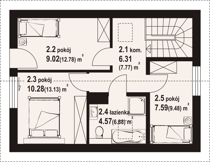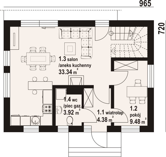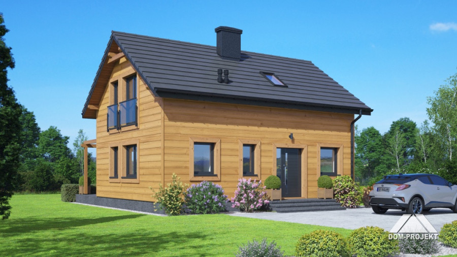 Dom w konstrukcji szkieletu drewnianego. Na parterze salon z aneksem kuchennym, kominkiem, oraz wyjściem na taras. Pokój, wiatrołap, wc z piecem gazowym. Na poddaszu trzy pokoje, łazienka, komunikacja. Zwarta bryła budynku oraz dach dwuspadowy sprzyjają szybkiej i taniej budowie oraz niskim kosztom eksploatacji.