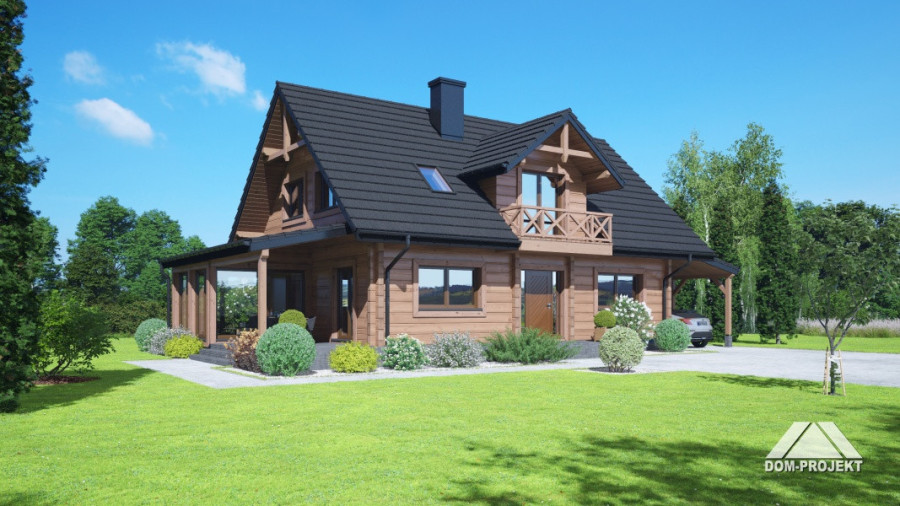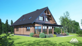 Dom z bali. Na parterze salon z kuchnią, kominkiem, wyjściem na taras oraz do ogrodu zimowego. Pokój/gabinet, łazienka, pomieszczenie gospodarcze, wiatrołap, komunikacja, schowek pod schodami. Na poddaszu trzy pokoje, komunikacja, pomieszczenie gospodarcze, łazienka, garderoba. Zwarta bryła budynku oraz dach dwuspadowy sprzyjają szybkiej i taniej budowie oraz niskim kosztom eksploatacji.