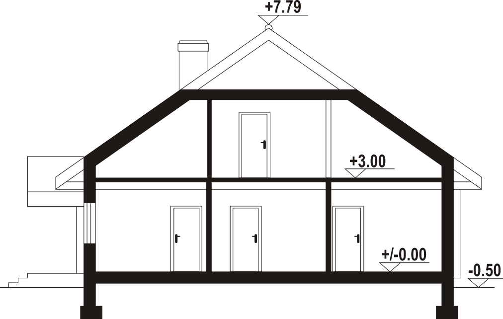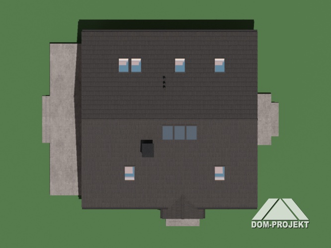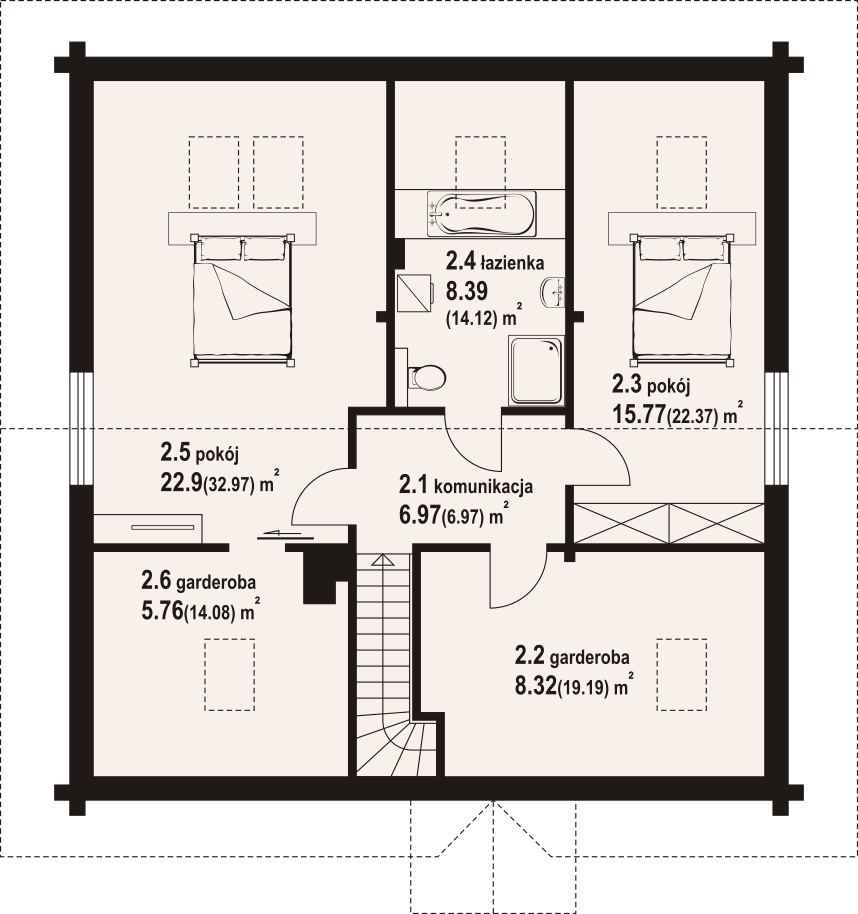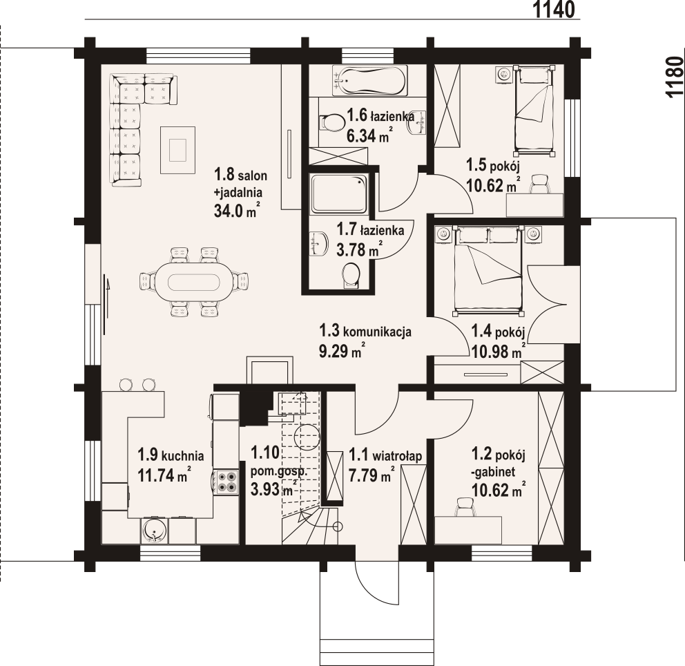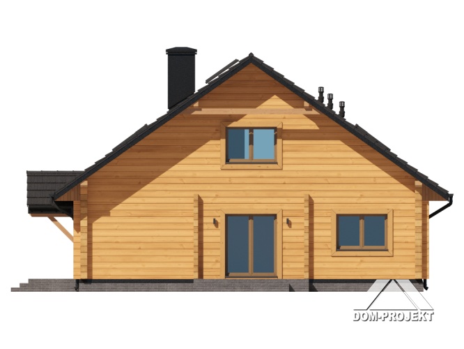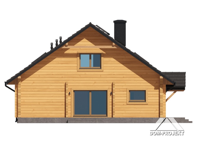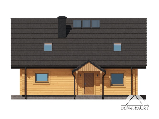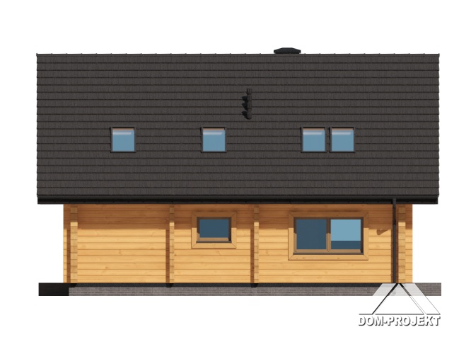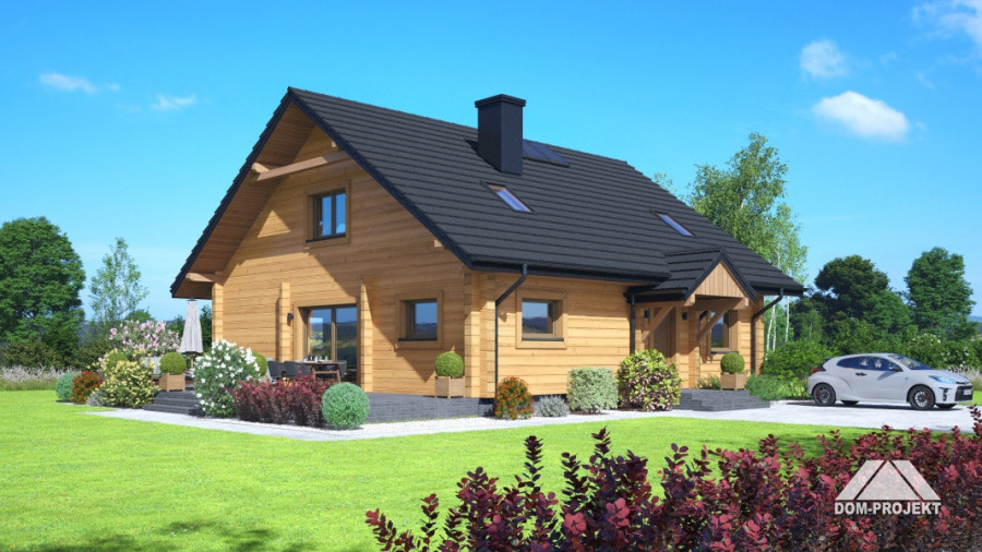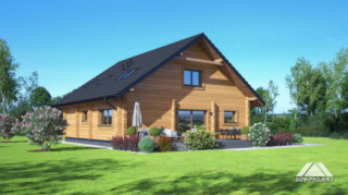 Dom z bali. Na parterze salon z jadalnią, kuchnią, kominkiem oraz wyjściem na taras. Trzy pokoje, dwie łazienki, komunikacja, wiatrołap, pomieszczenie gospodarcze. Na poddaszu dwa pokoje, dwie garderoby, łazienka, komunikacja. Zwarta bryła budynku oraz dach dwuspadowy sprzyjają szybkiej i taniej budowie oraz niskim kosztom eksploatacji.