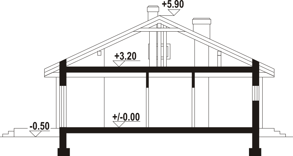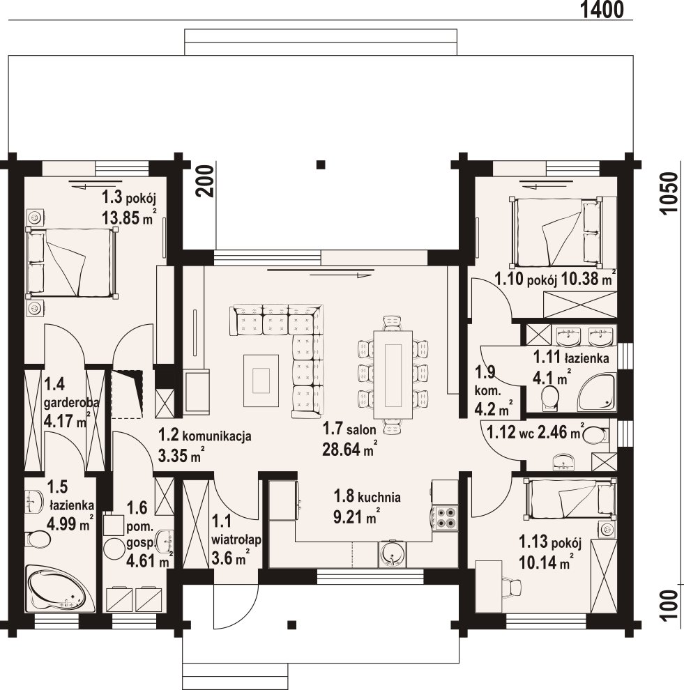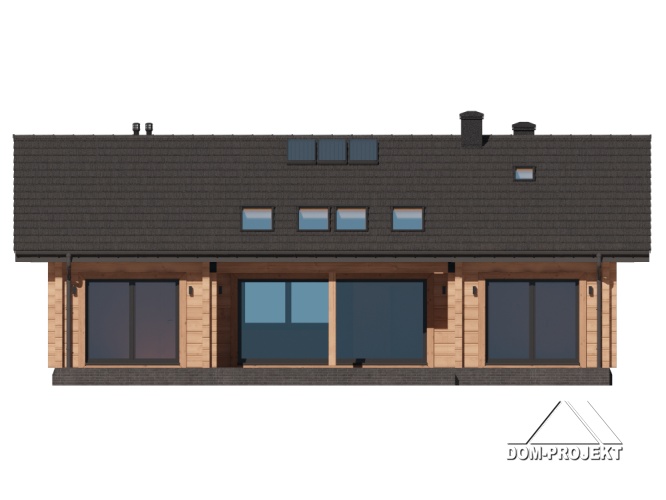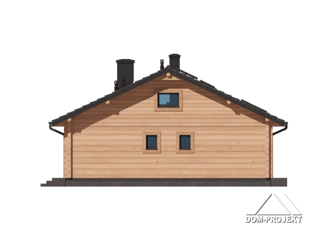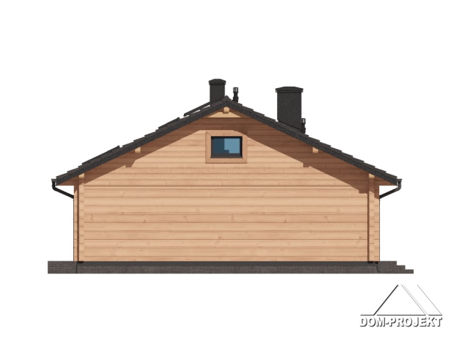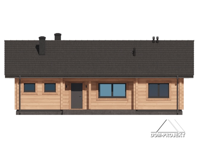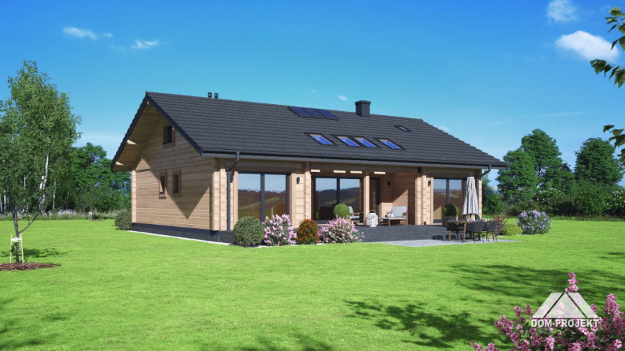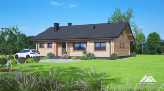 Parterowy dom z bali. Salon z aneksem kuchennym, kominkiem, wyjściem na częściowo zadaszony taras. Trzy pokoje, dwie łazienki, wc, garderoba, Pomieszczenie gospodarcze, komunikacja, wiatrołap. Zwarta bryła budynku oraz dach dwuspadowy sprzyjają szybkiej i taniej budowie oraz niskim kosztom eksploatacji.