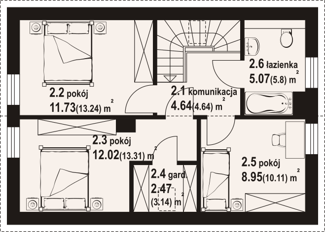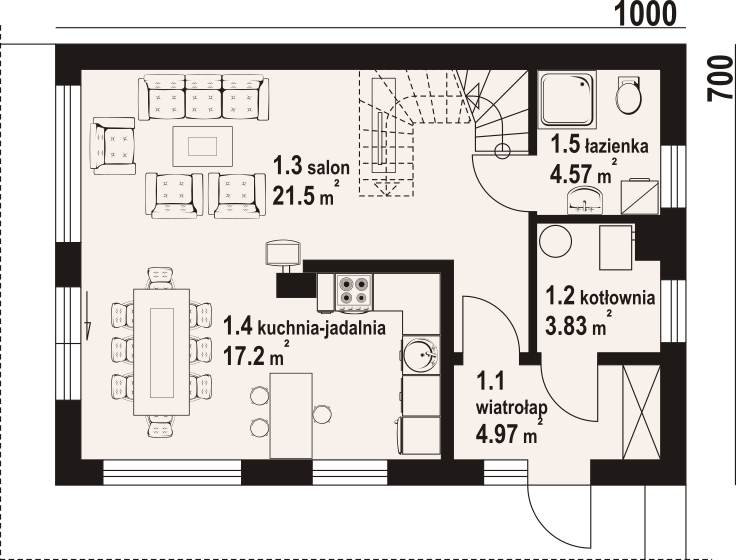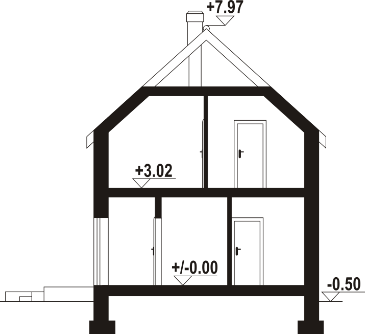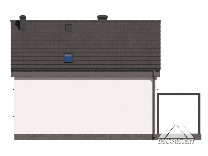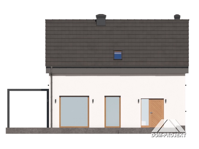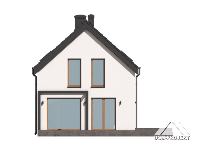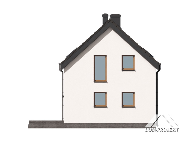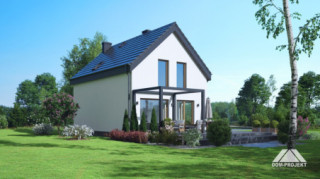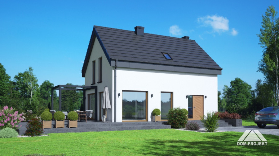Dom z poddaszem użytkowym. Na parterze salon z kuchnią, kominkiem, wyjściem na taras i schodami na poddasze. Łazienka, kotłownia, wiatrołap. Na poddaszu trzy pokoje, garderoba, łazienka, komunikacja. Zwarta bryła budynku oraz dach dwuspadowy sprzyjają szybkiej i taniej budowie oraz niskim kosztom eksploatacji.
