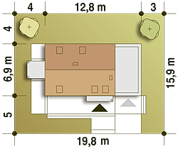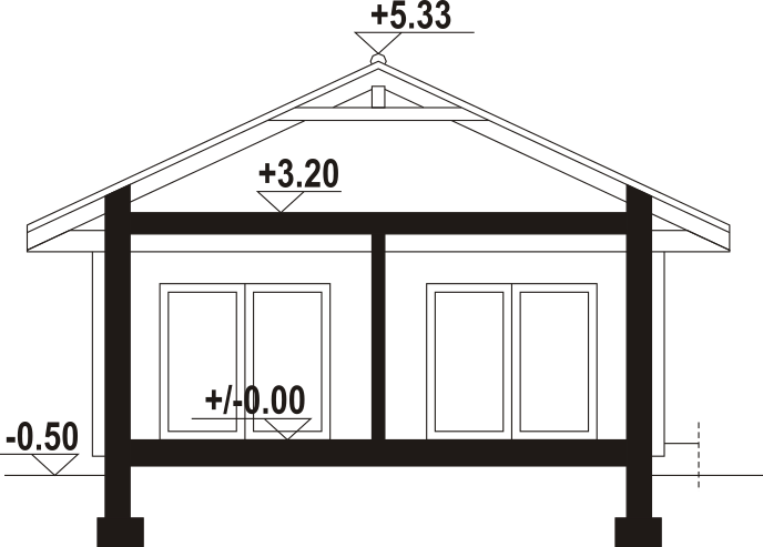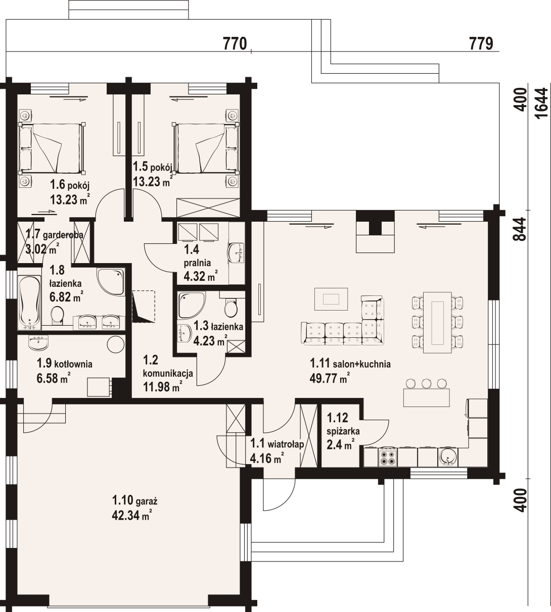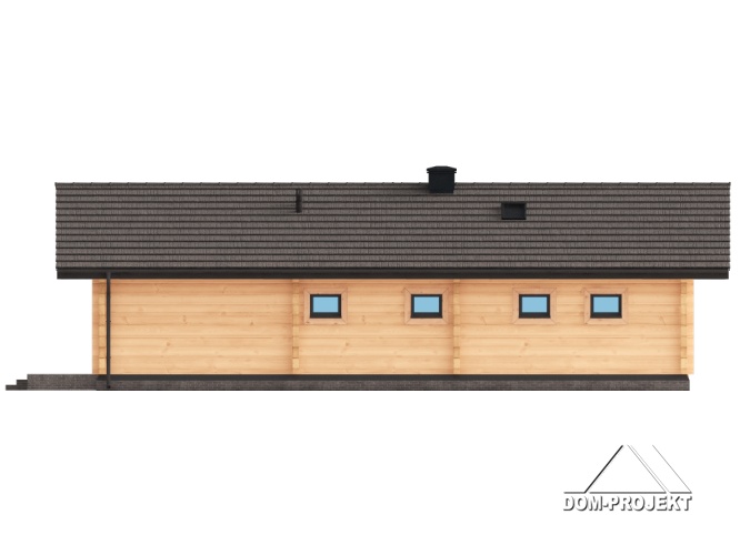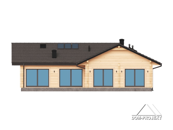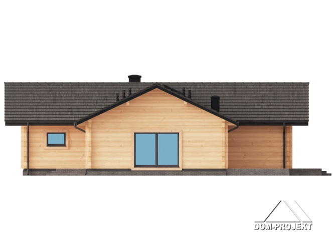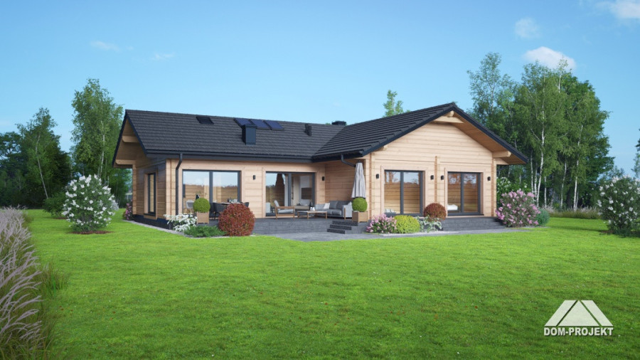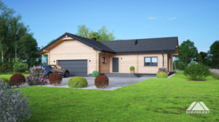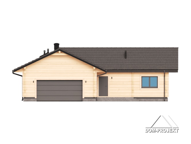 Dom z bali. Parterowy. Salon z kuchnią, kominkiem oraz wyjściem na taras. Dwie sypialnie. Jedna z własną garderobą i łazienką. Spiżarka, wiatrołap, komunikacja, pralnia, łazienka, kotłownia. Garaż na dwa samochody.