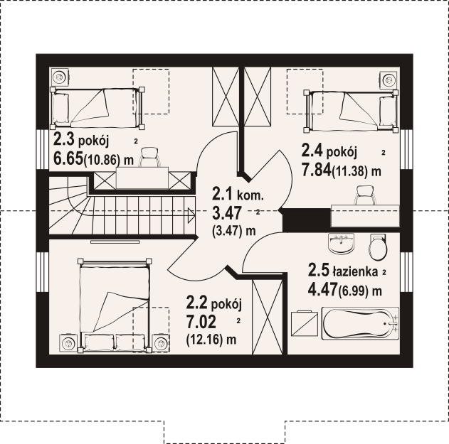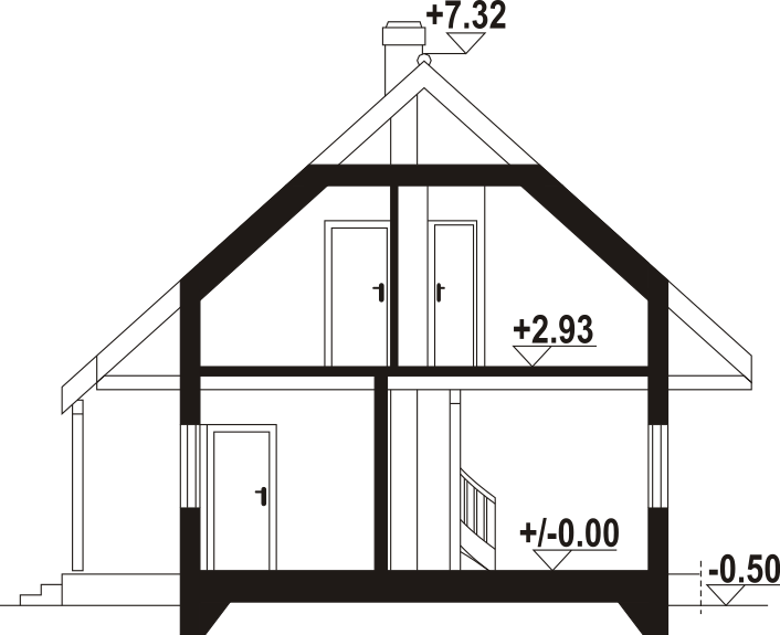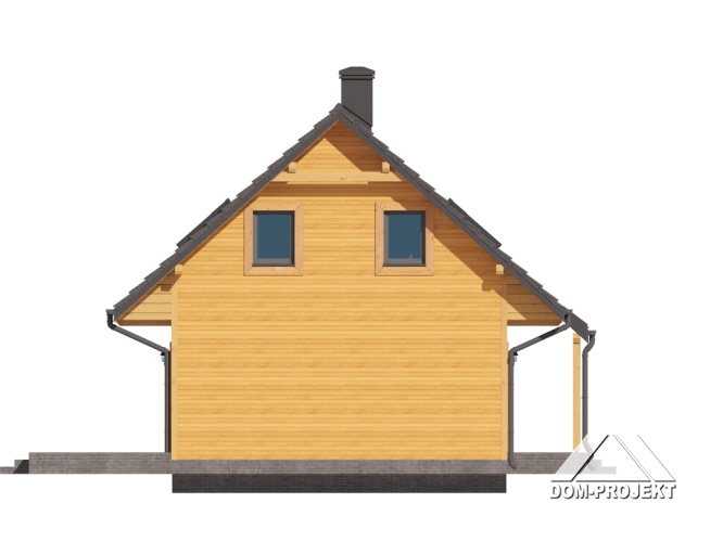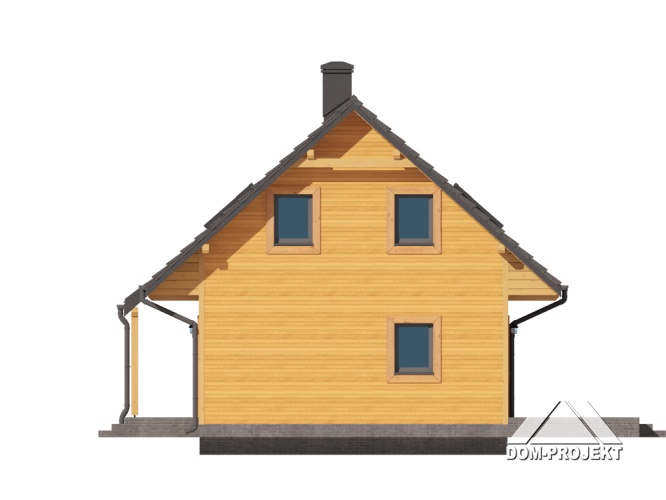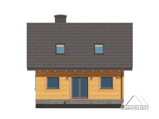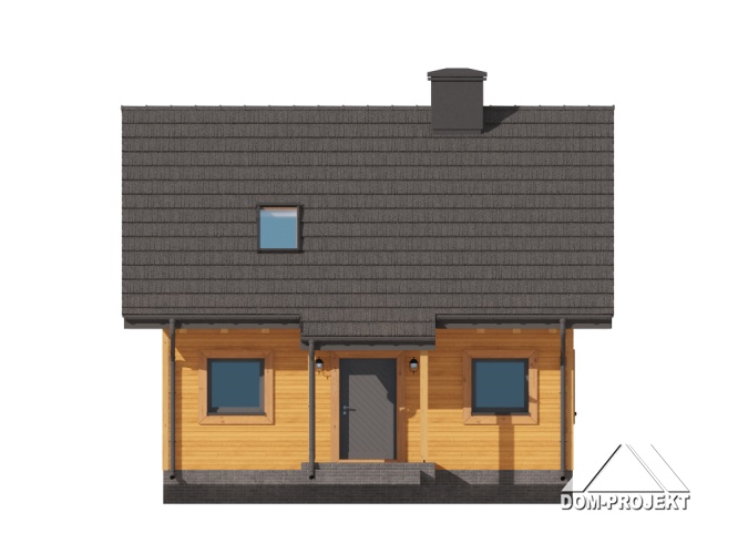 Dom w konstrukcji szkieletu drewnianego. Na parterze salon z aneksem kuchennym, kominkiem, wyjściem na taras i schodami na poddasze. Pokój, wiatrołap, łazienka. Na poddaszu trzy pokoje, komunikacja, łazienka. Zwarta bryła budynku oraz dach dwuspadowy sprzyjają szybkiej i taniej budowie oraz niskim kosztom eksploatacji.