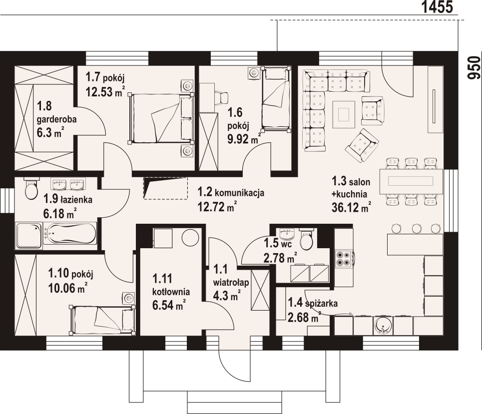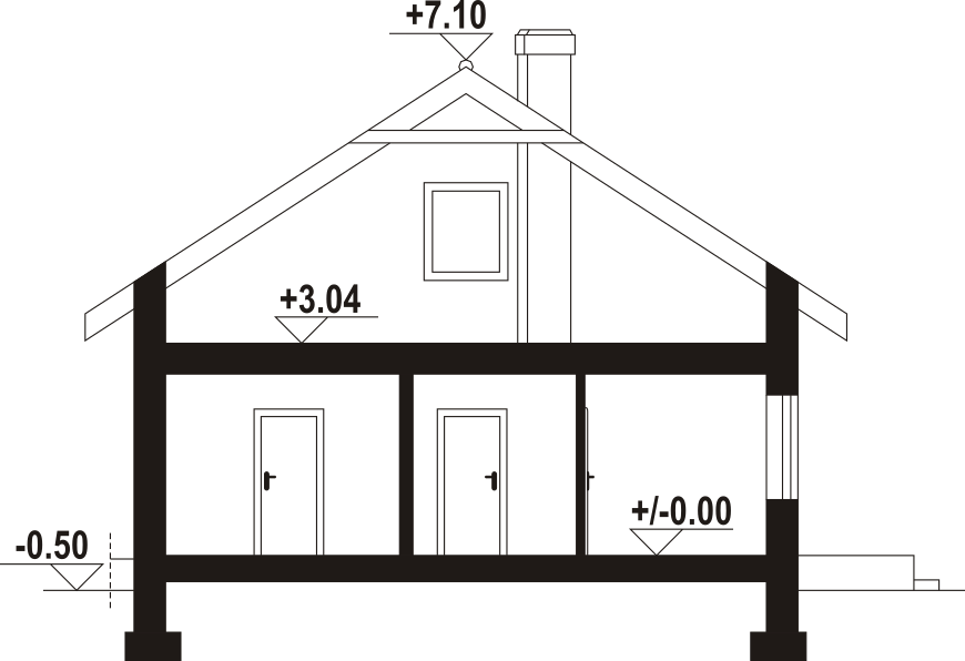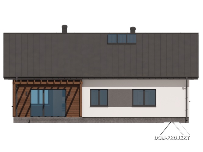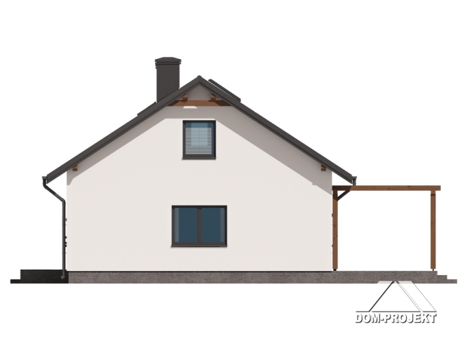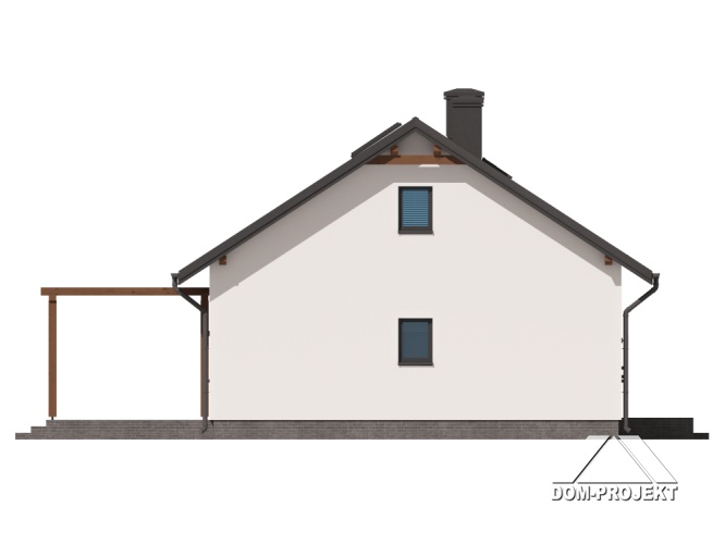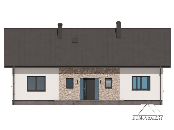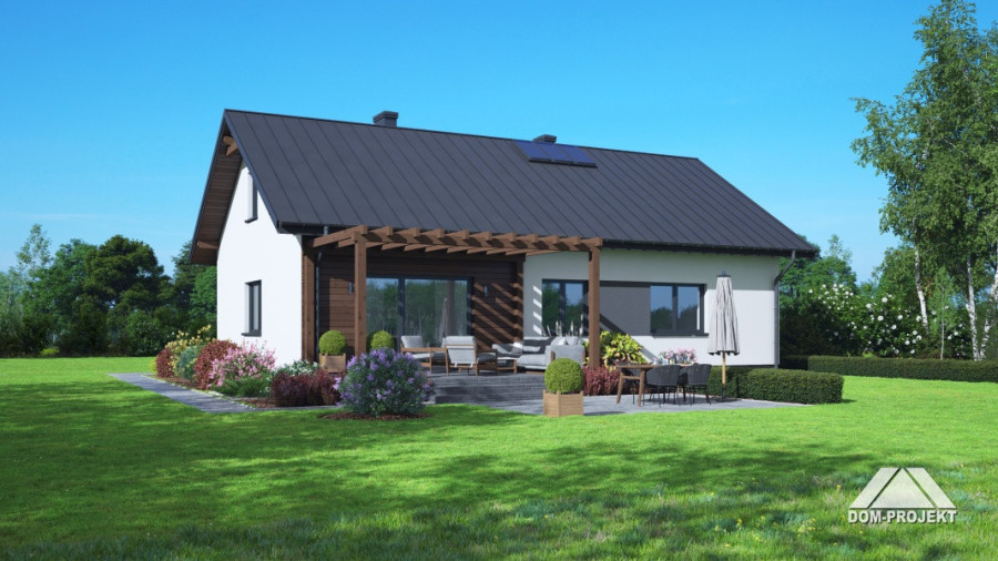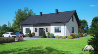 Wygodny dom parterowy, murowany. W części dziennej duży, dobrze doświetlony salon z kominkiem i wyjściem na taras, otwarta kuchnia ma dostęp do spiżarki. W części prywatnej trzy pokoje - główny z dostępem do własnej garderoby oraz wspólna łazienka z miejscem na wannę. Program użytkowy uzupełnia praktyczny wiatrołap, kotłownia oraz wc z miejscem na pralkę i suszarkę.