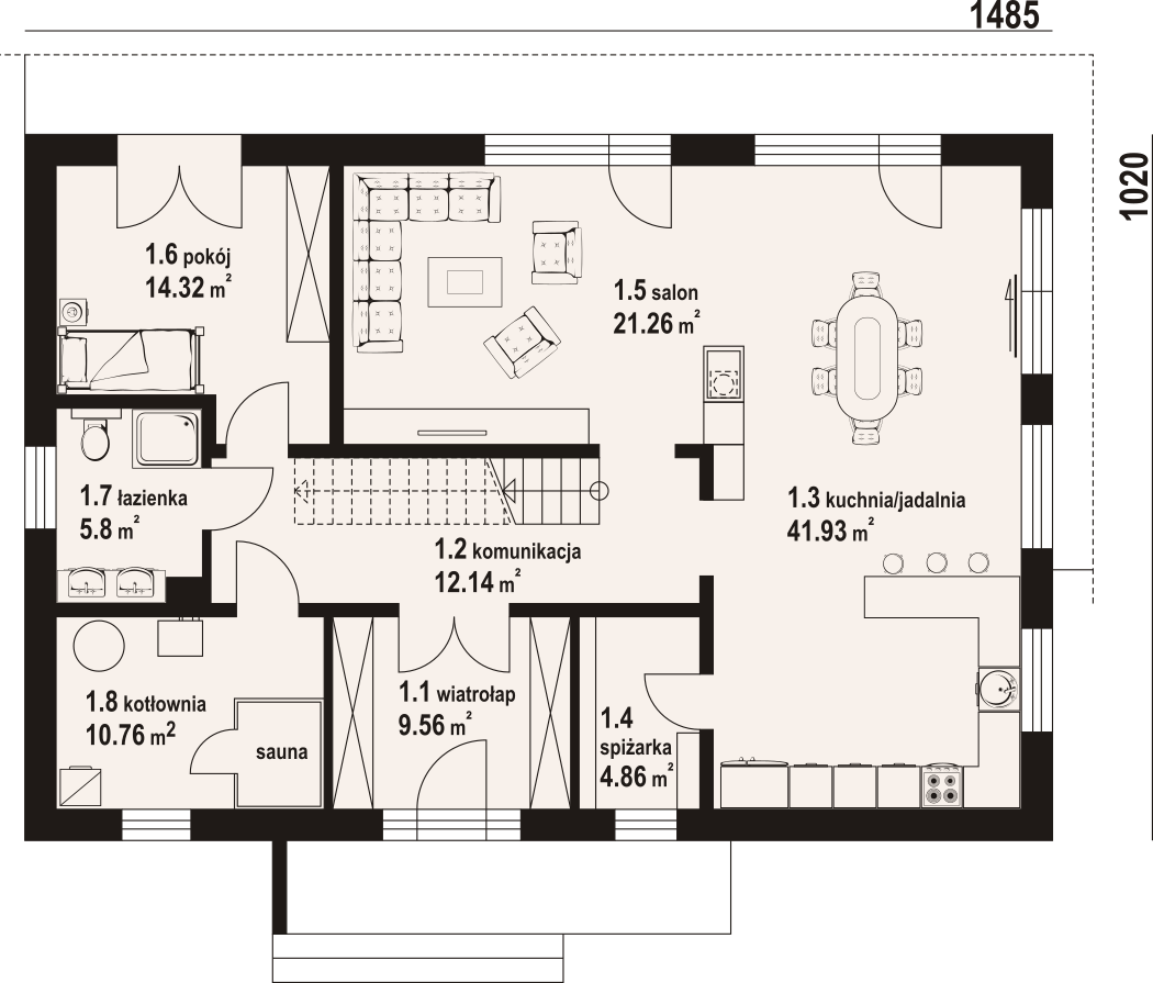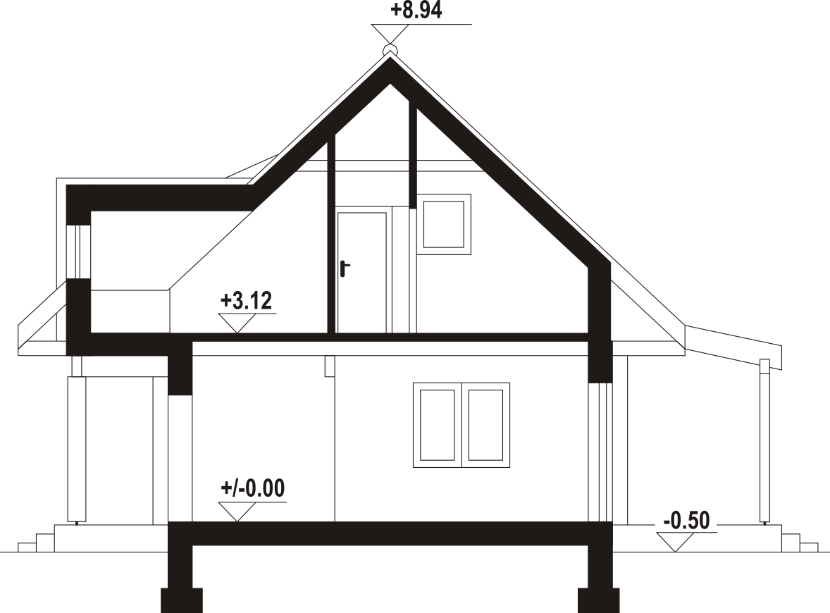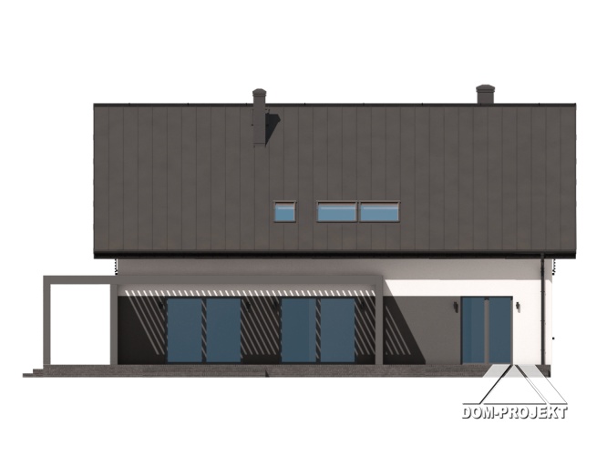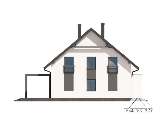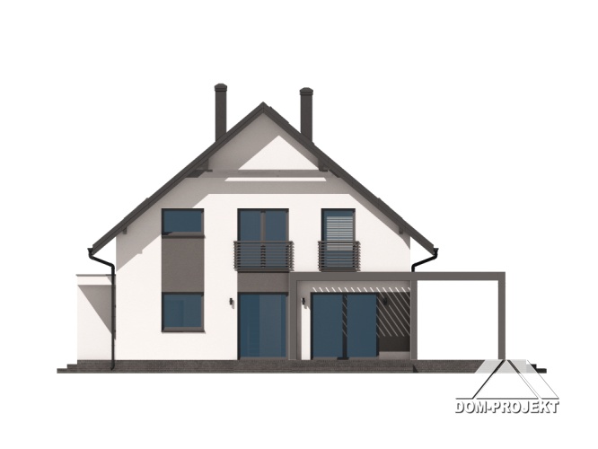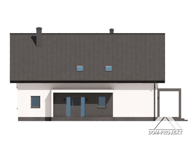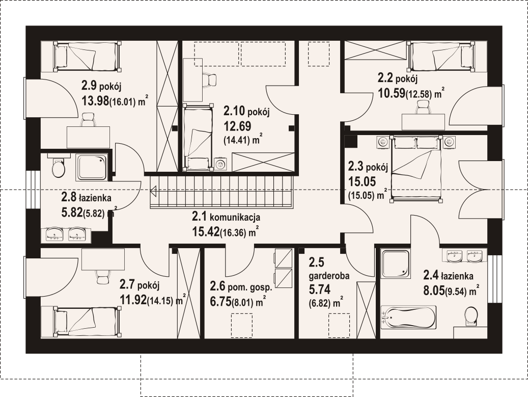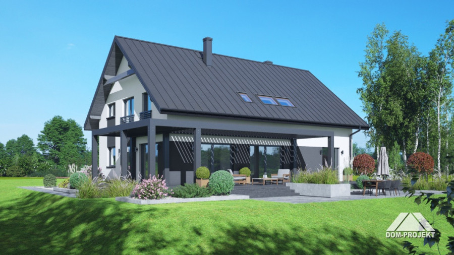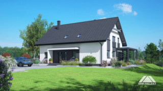 Projekt nowoczesnego domu z poddaszem użytkowym. Na parterze znajduje się duży, wygodny salon z kominkiem oraz wyjściem na taras. Otwarta kuchnia ma dostęp do pojemnej spiżarki. W kotłowni przewidzieliśmy miejsce na saunę. Program użytkowy parteru uzupełnia wiatrołap, łazienka oraz dodatkowy pokój. Na poddaszu aż pięć sypialni, w tym jedna z własną garderobą i łazienką oraz pomieszczenie gospodarcze i wspólna łazienka.