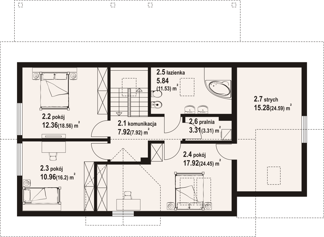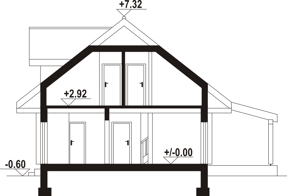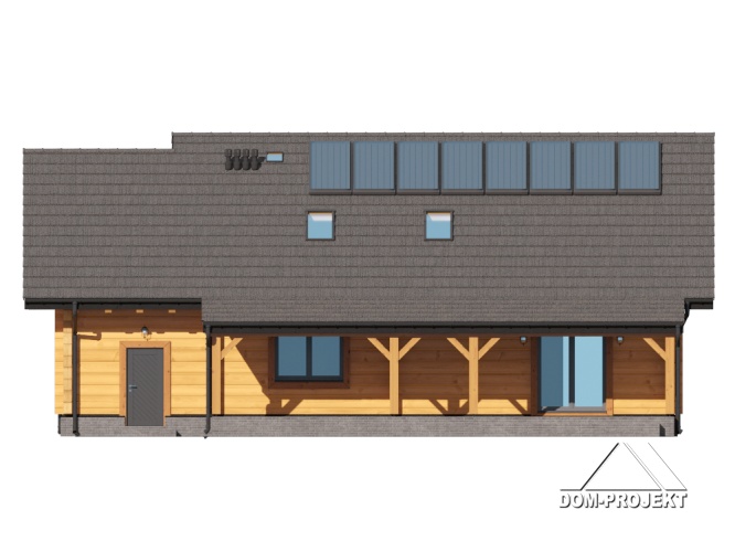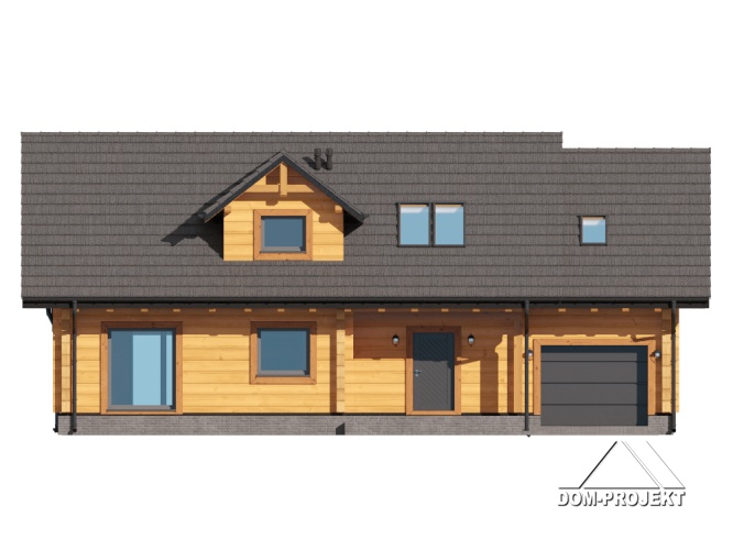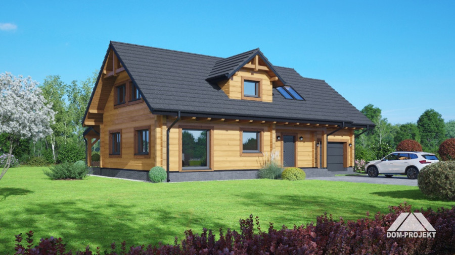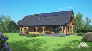 Dom z bali. Na parterze salon z aneksem kuchennym oraz wyjściem na duży, zadaszony taras. Pokój, łazienka, wiatrołap, spiżarka, pomieszczenie gospodarcze. Na poddaszu trzy pokoje, łazienka, komunikacja, pralnia oraz strych. Zwarta bryła budynku oraz dach dwuspadowy sprzyjają szybkiej i taniej budowie oraz niskim kosztom eksploatacji.
