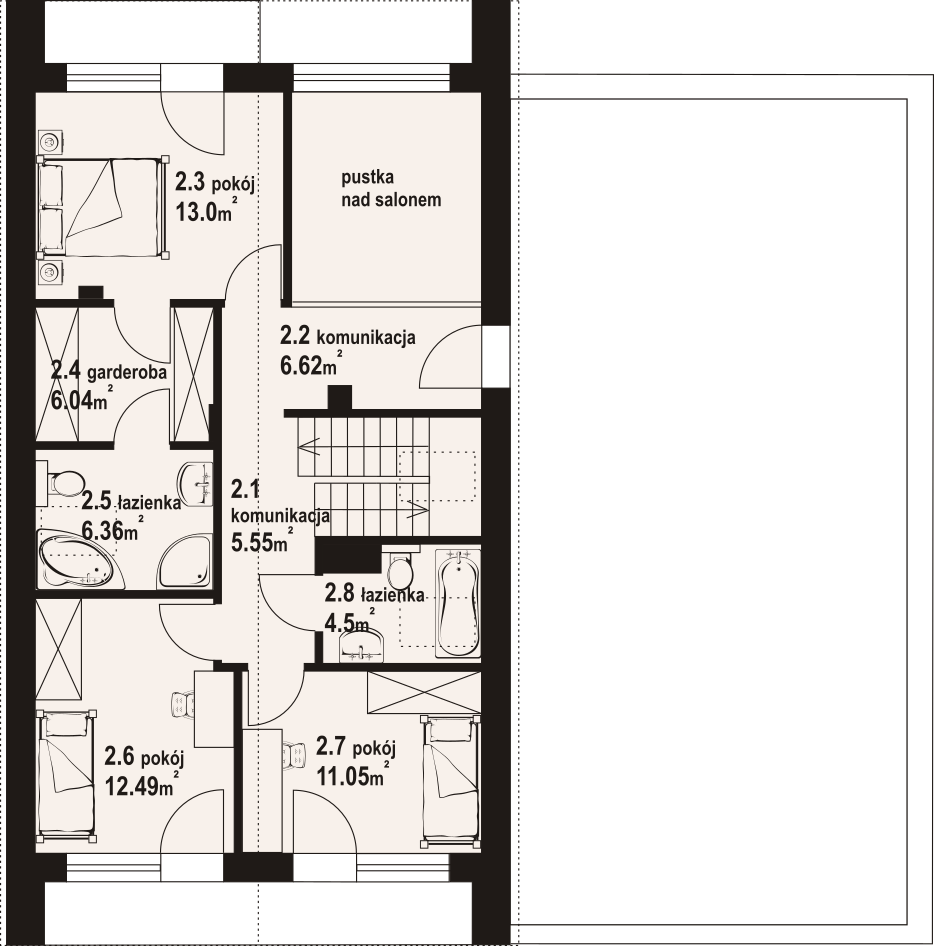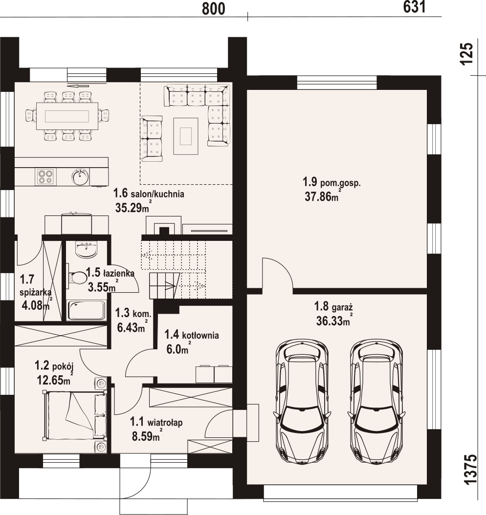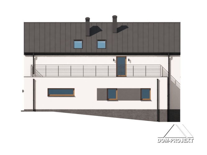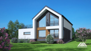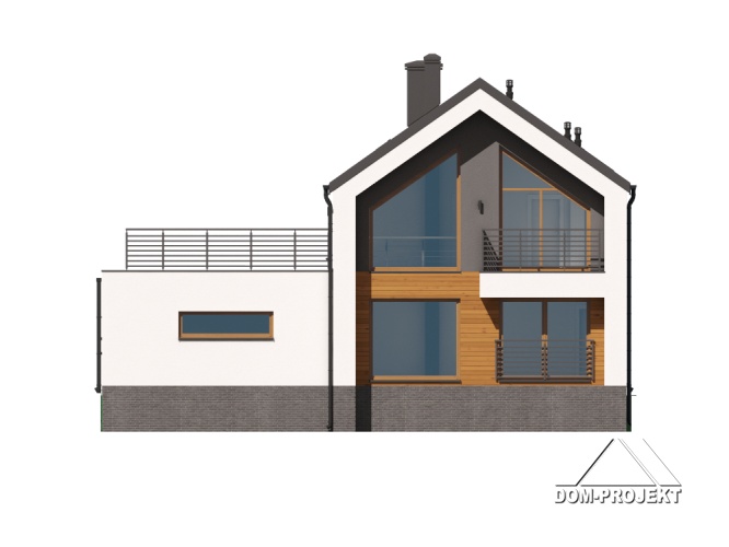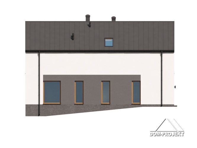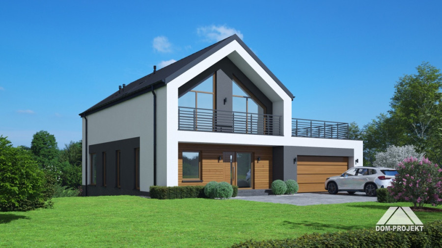 Projekt domu w stylu nowoczesnej stodoły. Na parterze wygodny salon z kominkiem i przeszkleniami. Otwarta kuchnia ma dostęp do praktycznej spiżarni. Dodatkowy pokój może pełnić rolę biura w domu lub sypialni. Przy garażu pomieszczenie gospodarcze - idealne miejsce na domową pracownię. Program użytkowy parteru uzupełnia łazienka i kotłownia. Na poddaszu trzy sypialnie - główna z własną garderobą i łazienką oraz wspólna łazienka. Prosta bryła budynku oraz dach dwuspadowy sprzyjają szybkiej i taniej budowie, obniżają koszty eksploatacji oraz nadają ponadczasowego charakteru.