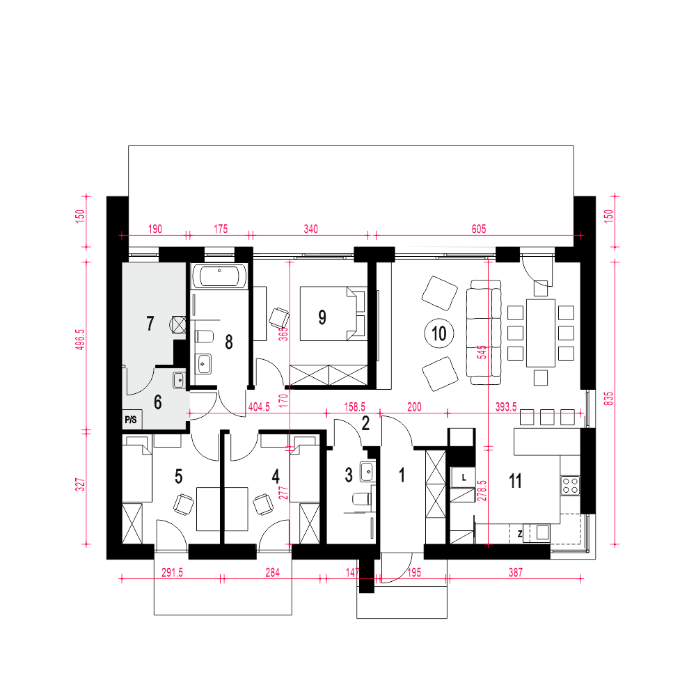 Hyzop IV to nowoczesny dom parterowy w stylu stodoły, zaprojektowany z myślą o rodzinach liczących od 4 do 5 osób. Konstrukcja budynku oparta jest na technologii murowanej, a dach dwuspadowy wykonano z prefabrykowanych elementów. Ten funkcjonalny projekt łączy w sobie przestrzenie ogólnodostępne oraz prywatne na jednym poziomie, zapewniając wygodę i ergonomię. Wejście do domu prowadzi przez przestronny wiatrołap z wnękową szafą, który otwiera drogę do głównego korytarza. W strefie dziennej znajduje się jasny i przestronny salon połączony z jadalnią oraz kuchnią. Duże drzwi tarasowe zlokalizowane od strony ogrodu nie tylko wpuszczają mnóstwo naturalnego światła, ale także prowadzą na zadaszony taras, ciągnący się wzdłuż całej długości budynku. Część prywatna oferuje trzy wygodne sypialnie oraz łazienkę wyposażoną zarówno w wannę, jak i prysznic. Hyzop IV to energooszczędny projekt domu parterowego, łączący nowoczesny design z ekonomią użytkowania. Dom należy do serii "eco", co czyni go idealną propozycją dla rodzin planujących budowę swojego pierwszego, funkcjonalnego i oszczędnego domu.fundamenty: BETONOWE ściany zewnętrzne: POROTHERM+STYROPIAN TERMO ORGANIKA rodzaj stropu i konstrukcja dachu: wiązary prefabrykowane MITEK elewacje: OKŁADZINA KLINKIEROWA, TYNK STRUKTURALNY pokrycie dachu: BLACHA