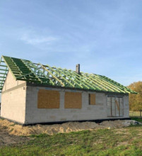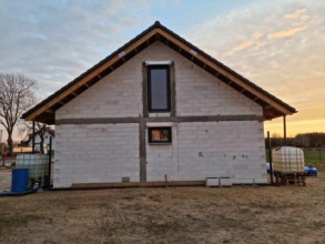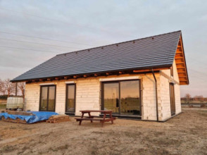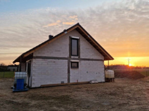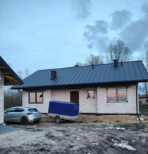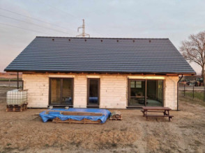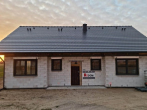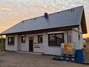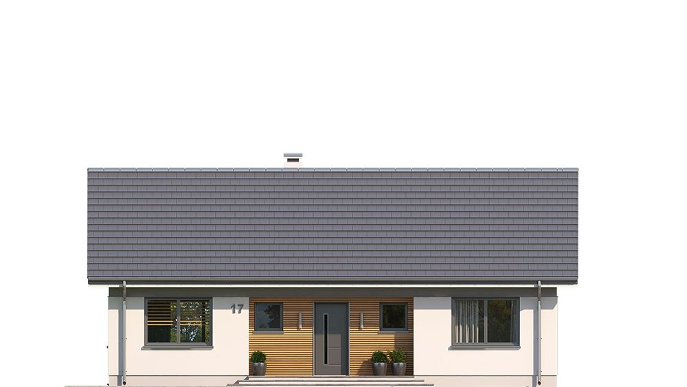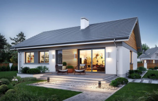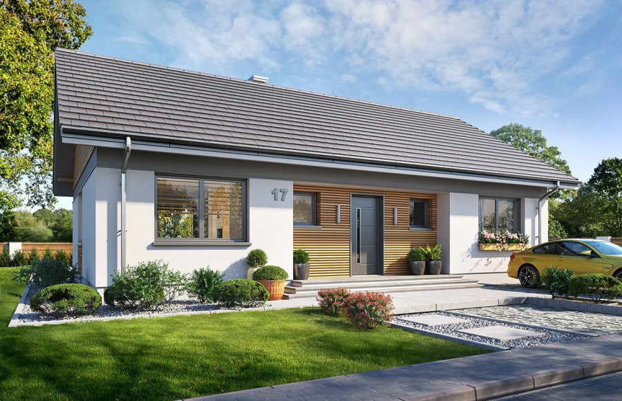 Projekt domu Ekonomiczny jest to projekt niedużego parterowego domu jednorodzinnego dla 3-4 osób. Jest to jeden z projektów z serii domków o tej samej nazwie. Ekonomiczny jest propozycją niewielkiego parterowego budynku, zaprojektowanego na prostokątnym planie, przykrytego dwuspadowym dachem, kryjącym strych do dowolnego wykorzystania. Budynek przy niewielkich wymiarach zewnętrznych rzutu zawiera w sobie bardzo wygodne do mieszkania wnętrze, ze wszystkimi potrzebnymi pomieszczeniami. Mamy tutaj cześć dzienną połączonego salonu i kuchni z półwyspem ( i własną spiżarnią ), oraz po drugiej stronie domu trzy sypialnie, w tym sypialnię master z osobną garderobą, oraz wygodną łazienkę. Dwie części domu rozdzielone są centralnie usytuowanym pomieszczeniem gospodarczym kotłowni z wyjściem na zewnątrz, ze wspólnym zespołem kominowym z kominkiem salonu. Wejście do domu zaakcentowano zadaszonym podcieniem, z reprezentacyjnym szerokim podestem. Elewacja frontowa łączy w sobie tradycyjną formę parterówki z dwuspadowym dachem i symetrycznym podziałem okien, z nowoczesnymi materiałami, z dużymi przeszkleniami, oraz z ciekawą kolorystyką i detalami wykończeniowymi. Patrząc na dom, widzimy porządek, harmonię i wrażenie solidności - i taka była idea projektantów : dom miał być architektonicznie prosty, ale miał mieć w sobie „coś” przyciągające uwagę. Od strony ogrodowej najważniejszymi elementami są : duże okno przesuwne z salonu, otwierające wnętrze na ogród, oraz taras będący przedłużeniem pokoju dziennego. Projektując „Ekonomicznego” przyświecała nam idea jak najbardziej praktycznego podejścia do formy budynku, jego układu funkcjonalnego, oraz rozwiązań materiałowych i technicznych. Staraliśmy się zaprojektować dom maksymalnie logicznie. Konstrukcja budynku jest prosta i niedroga w budowie. Wszystkie prace murarskie i betonowe kończą się na wysokości wieńców nad ścianami parteru. Wyżej mamy układ drewnianych wiązarów dachowych, które są jednocześnie konstrukcją stropu nad parterem jak i więźby dachowej. Taki sposób budowania znacznie upraszcza inwestycję, przyspiesza ją i - co najważniejsze - obniża koszty. W projekcie zastosowano bardzo dobre izolacje i nowoczesne instalacje, dzięki czemu budynek jest energooszczędny i będzie tani w późniejszej eksploatacji. Ekonomiczny to propozycja projektu dla osób podchodzących do budowy zadaniowo, planujących szybką i bezbolesną budowę, która nie zabierze Inwestorowi połowy życia. Z „Ekonomicznym” z pewnością się to uda. Zapraszamy !