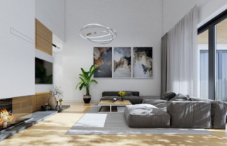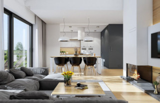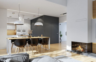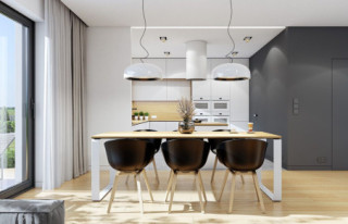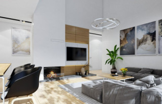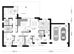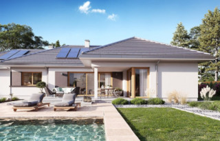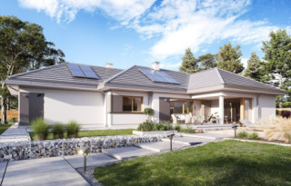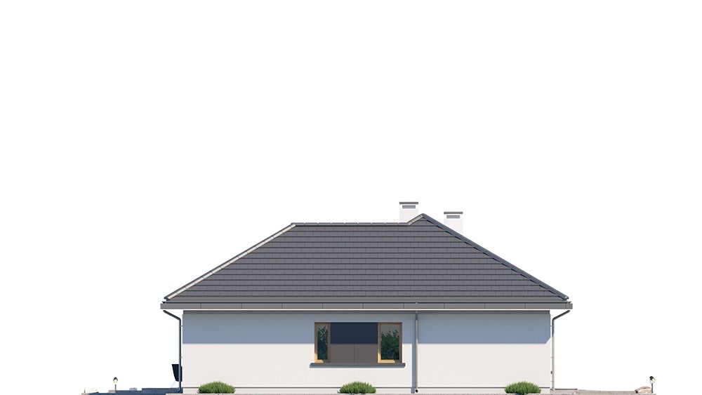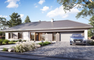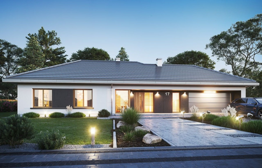 Projekt domu Dom na Szerokiej 3 jest to projektu domu jednorodzinnego z serii „Dom na Szerokiej”. Budynek zaprojektowano jako urozmaiconą wersję wariantową projektów z tej serii, z tylną fasadą ogrodową w układzie litery L dającej poczucie przytulności i intymności na tarasie. Dom ma prostokątną podłużną bryłę, przykrytą czterospadowym dachem z dobudówkami. Bryła domu zbudowana jest na planie L, z szerszym ramieniem w elewacji frontowej. Budynek przeznaczony jest na płytką działkę, z niewielką głębokością między drogą a tyłem parceli, lub na działkę z ogrodem z boku domu ( wówczas sytuowany jest bokiem do drogi dojazdowej). To typowy parterowy dom w stylu bungalow. Architektura budynku jest ciekawa, ale też stonowana - łączy w sobie nowoczesne detale i materiały, z tradycyjną sylwetką parterówki przykrytej wielospadowym dachem pokrytym dachówką. Szerokie reprezentacyjne wejście do domu z pięknymi drzwiami wejściowymi z naświetlem, Piękne narożne szklane okno pokoju- gabinetu, oraz duży podcień nad wejściem i wjazdem do garażu współtworzą atrakcyjny front domu. Od strony elewacji ogrodowej zaprojektowano duże przeszklenia z salonu i sypialni rodziców na taras i wygodny podcień. Detale wykończeniowe, materiały i kolory dobrano tak, aby stanowiły harmonijną całość. Wnętrze zaprojektowano dzieląc je na trzy części: część dzienną – z salonem, nocną z sypialniami i gospodarczą – z garażem i kotłownią. Do domu wchodzimy szerokimi drzwiami do obszernego przedsionka z szafami, albo z garażu - do przedsionka lub - przez spiżarnię – bezpośrednio do kuchni. Pokój dzienny połączony z jadalnią, kuchnią i holem stanowią komfortową przestrzeń dla domowników. Otwarcie przestrzenne nad częścią salonu podnoszące wysokość salonu aż do dachu powiększa dodatkowo wnętrze. Kuchnia z wyspą, jadalnia i salon zorganizowane są wokół centralnej ściany kominkowo – telewizyjnej oddzielającej salon od korytarza prowadzącego do sypialni. W części nocnej mamy cztery pokoje – trzy sypialnie oraz dodatkowy pokój ( gabinet lub zapasową sypialnię). Do dyspozycji domowników są dwie łazienki. Sypialnia rodziców ma dwie duże ściany w zabudowie szafowej, oraz garderobę. Z sypialni master zaprojektowano wyjście na taras narożnym oknem balkonowym. Całość domu zamykają wygodny dwustanowiskowy garaż, oraz strych nad parterem, do wykorzystania na domowy magazyn - graciarnię, dostępny z parteru za pomocą schodków drabinkowych. Konstrukcja domu jest bardzo prosta: ściany parteru do wysokości wieńca + konstrukcja stropu nad parterem i więźby dachowej w postaci układu prefabrykowanych wiązarów drewnianych. Takie rozwiązanie znacznie przyspiesza budowę, upraszcza ją i obniża koszt realizacji domu. W projekcie zastosowano bardzo dobre izolacje, nowoczesne materiały i instalacje, dzięki czemu budynek będzie tani w późniejszej eksploatacji. Dom na Szerokiej 3 to świetna propozycja dla Inwestorów pragnących nowoczesnego, komfortowego parterowego domu o ciekawej urozmaiconej architekturze. Zapraszamy !