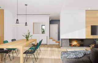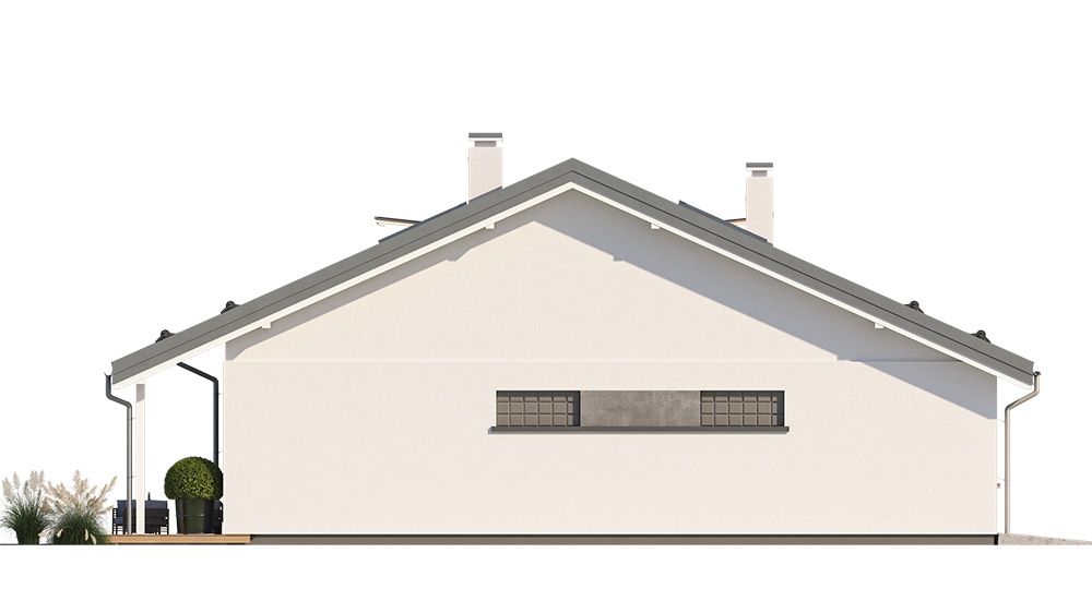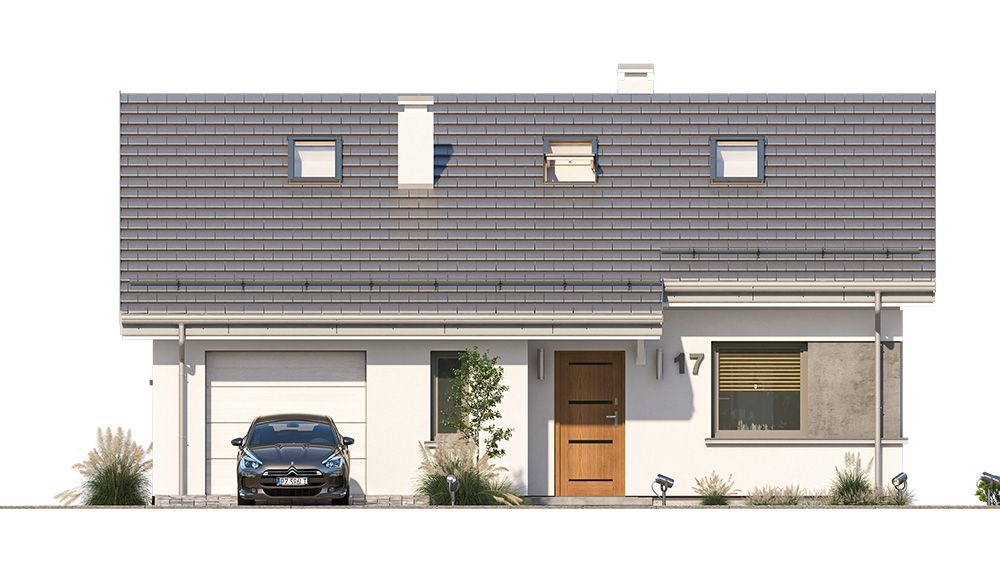 Projekt domu Ambitny 2 jest to projekt domu jednorodzinnego z serii ”Ambitny” - wariant projektu z niższym dachem o mniejszym kącie nachylenia, oraz z mniejszym poddaszem nad parterem. Ambitny 2 to dom dla 3- 5-osobowej rodziny, parterowy z poddaszem użytkowym, o prostej bryle - nieskomplikowany w budowie. Bryła budynku zbudowana jest na planie prostokąta, dom przykryty jest dwuspadowym dachem o kalenicy równoległej do elewacji frontowej. Konstrukcję budynku zaprojektowano z wykorzystaniem wiązarów prefabrykowanych, dzięki czemu budowa domu jest znacznie szybsza, łatwiejsza - i co najważniejsze - tańsza. Murowana część domu kończy się na wieńcach nad ścianami parteru, oraz na dwóch ścianach szczytowych poddasza. Pozostałą część konstrukcji stropu, ścianek kolankowych, oraz więźby dachowej stanowi układ drewnianych wiązarów ramowo -kratowych. Taka mieszana konstrukcja domu jest coraz częściej stosowana na budowach - jako nowoczesne i bardzo wydajne rozwiązanie. Architektura domu jest nowoczesna, wykorzystuje modne detale, materiały i kolorystykę, a jednocześnie dom ma spokojny i powściągliwy wygląd - bez zbędnej ekstrawagancji. W wyglądzie zewnętrznym budynku króluje poczucie solidności i prostoty. Wejście zaakcentowano narożnym podcieniem i podestem. Od strony elewacji ogrodowej dom zdobią duże przeszklenia otwierające pokój dzienny na taras, okładzina drewniana (lub drewnopodobna) ścian salonu, oraz duże zadaszenie tarasu. Wnętrze budynku zaprojektowano tak, aby rodzina miała możliwość zamieszkać w nim najpierw na parterze, a potem w drugim etapie zagospodarować poddasze. Możliwość wykończenia wnętrza domu etapami jest bardzo dużym atutem projektu. Na parterze mam do dyspozycji dużą połączoną przestrzeń dzienną, składającą się z salonu, holu i kuchni. W oddzielonym narożniku domu mamy do dyspozycji dwa pokoje i łazienkę, oraz pralnię. Natomiast obok przedsionka wejściowego zlokalizowana jest kotłownia i garaż. Na poddaszu mamy do dyspozycji dwa pokoje i łazienkę - które mogą być wykończone w późniejszym etapie. Budynek ma bardzo prostą konstrukcję. Będzie szybki w budowie i niedrogi. Dom jest energooszczędny - doskonałe izolacje, zastosowane nowoczesne materiały i instalacje pozwolą uzyskać niskie koszty utrzymania budynku. Dom jest świetną propozycją dla rodzin budujących swój pierwszy dom, które są na początku drogi, z dziećmi które dopiero rosną. Dodatkowe rezerwowe poddasze daje zapas przestrzeni do wykorzystania na później. Dom doskonale sprawdzi się też dla osób starszych, do których przyjeżdżają dzieci i wnuki w gościnę. Zapraszamy https://www.mgprojekt.com.pl/