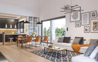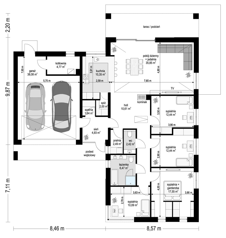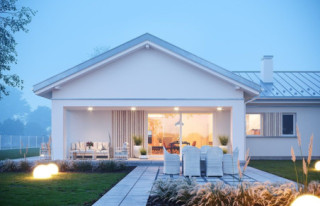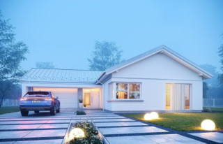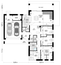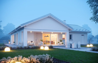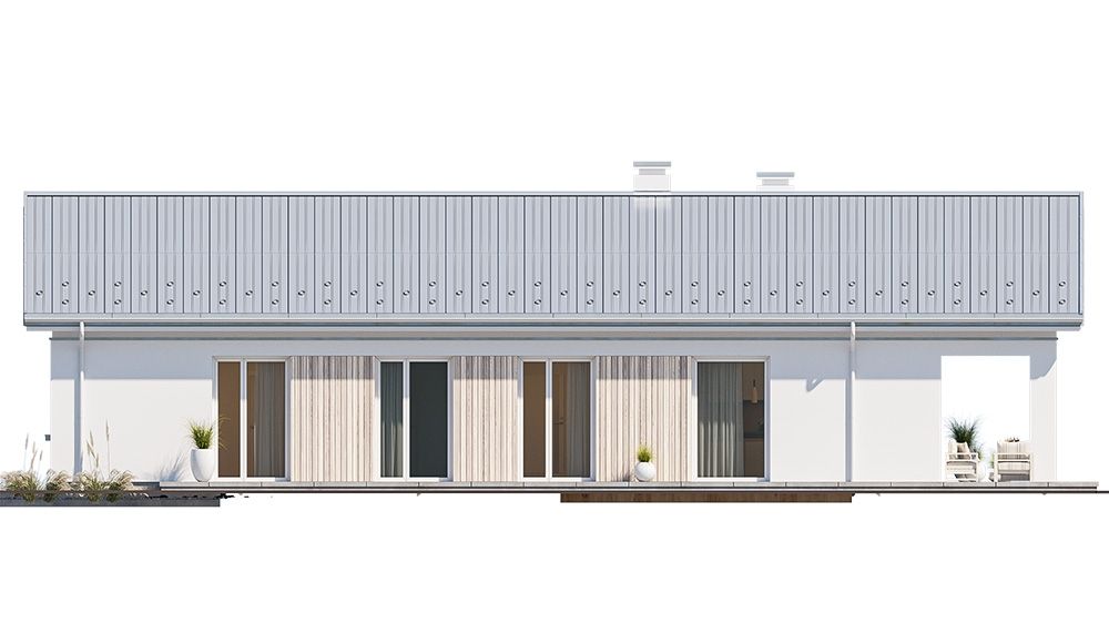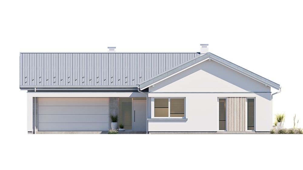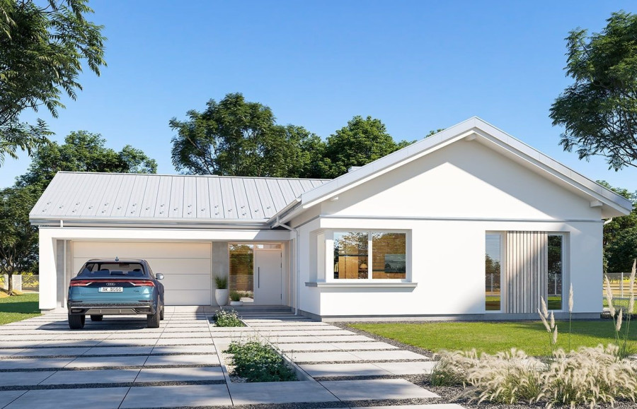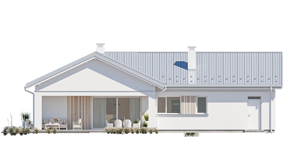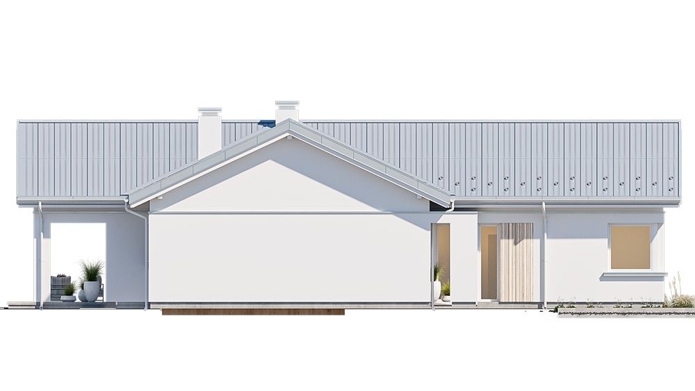 Projekt domu Sielanka 2 jest kolejną wersją projektu z popularnej serii „Sielanek” z MG Projekt. Jest to projekt parterowego budynku, z bryłą w kształcie litery T, przykrytą dwuspadowymi dachami, z cofniętym względem frontu domu dwustanowiskowym garażem -dzięki czemu uzyskujemy duży dziedziniec frontowy, oraz z elewacją ogrodową z przestronnym zadaszonym tarasem będącym przesłużeniem salonu. Budynek został zaprojektowany dla 3- 5-osobowej rodziny, która chce wygodnie mieszkać na parterze, cieszyć się kontaktem z ogrodem i nie biegać co chwila po schodach. Dom nadaje się na działki z ogrodem z tyłu, lub od strony elewacji bocznej - z boku. Architektura budynku jest nowoczesna i prosta, przypominająca skandynawskie czy północnoeuropejskie bungalowy. Front domu urozmaicony jest narożnym oknem pokoju i przede wszystkim reprezentacyjnymi drzwiami wejściowymi z naświetlem bocznym pod zadaszeniem podestu wejściowego. Zastosowana ascetyczna kolorystyka jest bardzo nowoczesna i oryginalna. Świetne dopasowanie białych ścian, ram okien, oraz szarości podmurówki i pokrycia dachowego z blachy na rąbek stojący. Wszystkie te elementy dają interesujący i wyróżniający dom efekt. Od strony ogrodu - od elewacji tylnej i bocznej główną rolę odgrywają piękne przeszklenia pokoi, zadaszenie tarasu, oraz same tarasy w kształcie litery L. Dom ma minimalistyczny styl, ale to właśnie go wyróżnia i czyni wyjątkowym. Wnętrze budynku podzielono na trzy strefy: w części środkowej rzutu mamy ogólną przestrzeń dzienną do życia, po lewej stronie część garażowo-gospodarczą, a z prawej strony - pokoje sypialne z zapleczem. Do domu wchodzimy z zadaszonego podestu wejściowego szerokimi doświetlonymi drzwiami do obszernego przedsionka z szatnią i następnie do holu połączonego przestrzennie z salonem i kuchnią. Kuchnia w tym projekcie jest otwarta na salon, oraz na ogród. Salon z pustką nad sufitem aż do kalenicy dachu jest bardzo ładnym pomieszczeniem o dużej kubaturze. Z holu korytarzem przechodzimy do części prywatnej, gdzie znajdziemy 4 pokoje, wśród nich sypialnię master z podwójną garderobą. Całość tej części dopełnia duża łazienka, wc i pomieszczenie na pralkę, suszarkę i kosze do prania. W części gospodarczej znajdziemy duży dwustanowiskowy garaż, z magazynem, oraz kotłownię. Nad przeważającą częścią parteru zaprojektowano przestrzeń strychową - magazyn domowych rzeczy „nadprogramowych”, dostępną ze schodków drabinkowych z holu. Konstrukcyjne dom jest zaprojektowany bardzo prosto. Prace murarskie i betoniarskie kończą się na wieńcach nad ścianami parteru. Następnie pozostała konstrukcja to układ drewnianych wiązarów prefabrykowanych, tworzących strop nad parterem, oraz więźbę dachową. Takie rozwiązanie znakomicie upraszcza budowę, przyspiesza ją - i przede wszystkim obniża koszty. Dom zaprojektowano jako energooszczędny, z dobrymi izolacjami i nowoczesnymi instalacjami. Budynek jest łatwy i szybki w budowie i będzie niedrogi w późniejszej eksploatacji. To doskonała propozycja dla Inwestorów pragnących parterowego, wygodnego i ekonomicznego domu. Zapraszamy do zapoznania się ze wszystkimi projektami z serii Sielanka: https://www.mgprojekt.com.pl/sielanka, https://www.mgprojekt.com.pl/sielanka-2, https://www.mgprojekt.com.pl/sielanka-2-b, https://www.mgprojekt.com.pl/sielanka-3, https://www.mgprojekt.com.pl/sielanka-4.