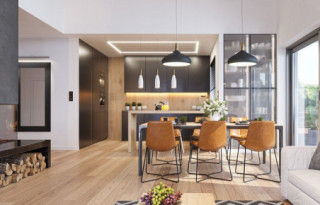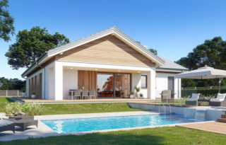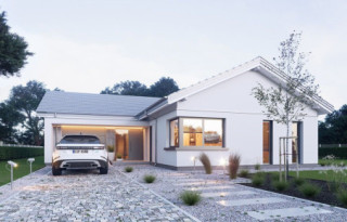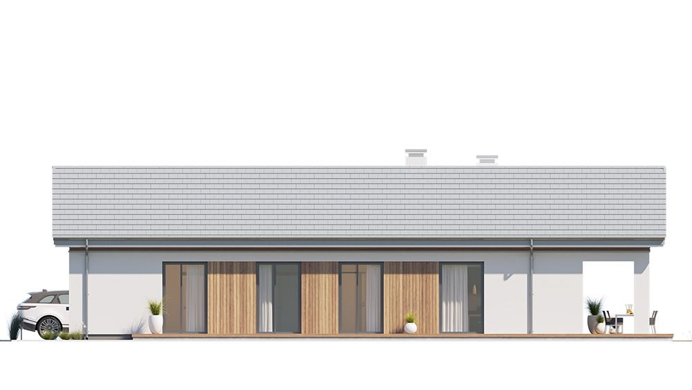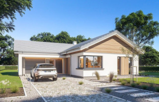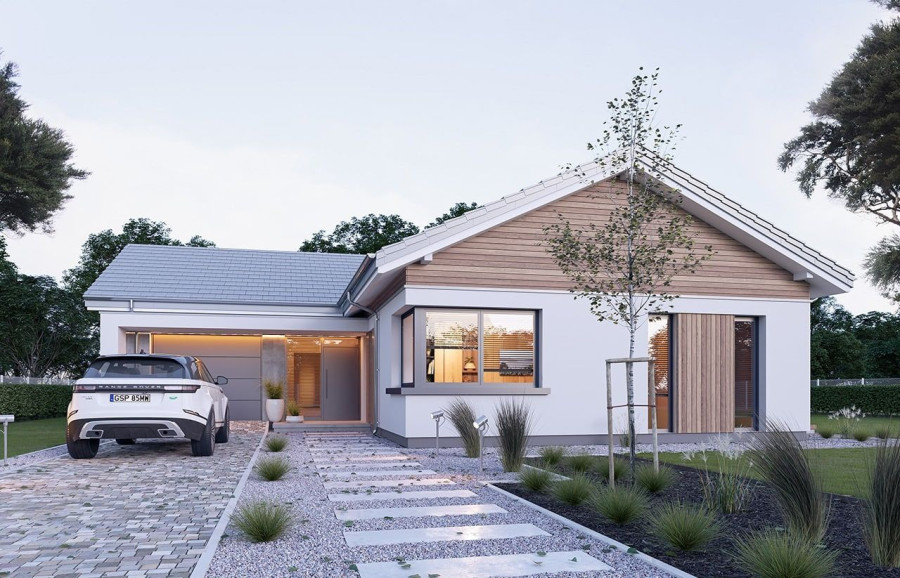 Projekt domu Sielanka 2 B jest kolejną wersją projektu z popularnej serii „Sielanek” z MG Projekt, czyli wersja węższa, z jednostanowiskowym garażem. Jest to projekt parterowego budynku, z bryłą w kształcie litery T, przykrytą dwuspadowymi dachami, z tworzącym długi frontowy podjazd cofniętym garażem z przedsionkiem wejściowym, oraz z elewacją ogrodową z przestronnym zadaszonym tarasem będącym przesłużeniem salonu. Budynek został zaprojektowany dla 3- 5-osobowej rodziny, chcącej wygodnie mieszkać na jednym poziomie, mającej bezpośredni kontakt z otaczającym ogrodem, bez chodzenia po schodach. Dom nadaje się na działkę z ogrodem z tyłu lub z boku budynku - zależnie od jego posadowienia i orientacji względem stron świata. Architektura jest nowoczesna i prosta, przypominająca skandynawskie czy północnoeuropejskie bungalowy. Front budynku urozmaicono narożnym oknem pokoju i reprezentacyjnymi drzwiami wejściowymi z naświetlem bocznym pod zadaszeniem podestu wejściowego. Zastosowane materiały i kolorystyka są udanym połączeniem nowoczesności z tradycją. Połączenie białych ścian, szarą lub grafitową dachówką, oraz kontrastowymi elementami wykończenia dają interesujący i wyróżniający dom efekt. Od strony ogrodu główną rolę odgrywają piękne przeszklenia pokoi, zadaszenie tarasu, oraz same tarasy w kształcie litery L. Dom ma minimalistyczną architekturę, ale to właśnie go wyróżnia i czyni wyjątkowym. Wnętrze budynku podzielono na strefy: w części środkowej mamy ogólną przestrzeń dzienną do życia, po lewej stronie część garażowo-gospodarczą, a z prawej strony - pokoje sypialne z zapleczem. Do domu wchodzimy z zadaszonego podestu wejściowego szerokimi doświetlonymi drzwiami do obszernego przedsionka z szatnią i następnie do holu połączonego przestrzennie z salonem i kuchnią. Kuchnia jest otwarta na salon, oraz na ogród. Salon z pustką nad sufitem aż do kalenicy dachu jest bardzo ładnym pomieszczeniem o dużej kubaturze. Z holu korytarzem przechodzimy do części prywatnej, gdzie znajdziemy 4 pokoje, wśród nich sypialnię master z podwójną garderobą. Całość tej części dopełnia duża łazienka, wc i pomieszczenie na pralkę, suszarkę i kosze do prania. W części gospodarczej znajdziemy duży dwustanowiskowy garaż, z magazynem, oraz kotłownię. Nad przeważającą częścią parteru zaprojektowano przestrzeń strychową - magazyn domowych rzeczy „nadprogramowych”, dostępną ze schodków drabinkowych z holu. Konstrukcyjne dom jest zaprojektowany bardzo prosto. Prace murarskie i betoniarskie kończą się na wieńcach nad ścianami parteru. Następnie pozostała konstrukcja to układ drewnianych wiązarów prefabrykowanych, tworzących strop nad parterem, oraz więźbę dachową. Takie rozwiązanie znakomicie upraszcza budowę, przyspiesza ją - i przede wszystkim obniża koszty. Dom zaprojektowano jako energooszczędny, z dobrymi izolacjami i nowoczesnymi instalacjami. Budynek jest łatwy i szybki w budowie i będzie niedrogi w późniejszej eksploatacji. To świetna propozycja dla Inwestorów szukających domu parterowego, wygodnego i ekonomicznego. Zapraszamy do zapoznania się ze wszystkimi projektami z serii Sielanka: https://www.mgprojekt.com.pl/sielanka, https://www.mgprojekt.com.pl/sielanka-2, https://www.mgprojekt.com.pl/sielanka-2-b, https://www.mgprojekt.com.pl/sielanka-3, https://www.mgprojekt.com.pl/sielanka-4.