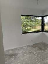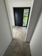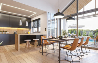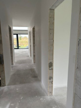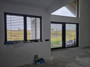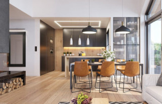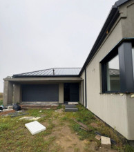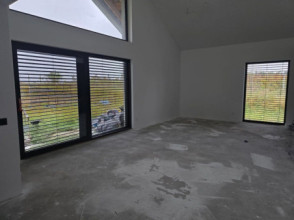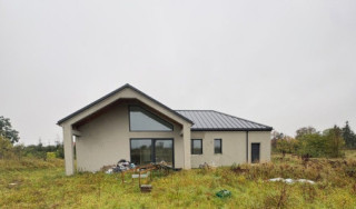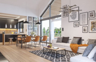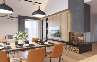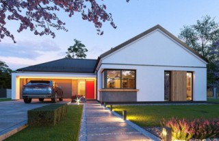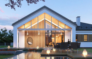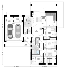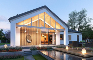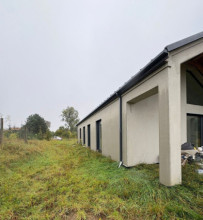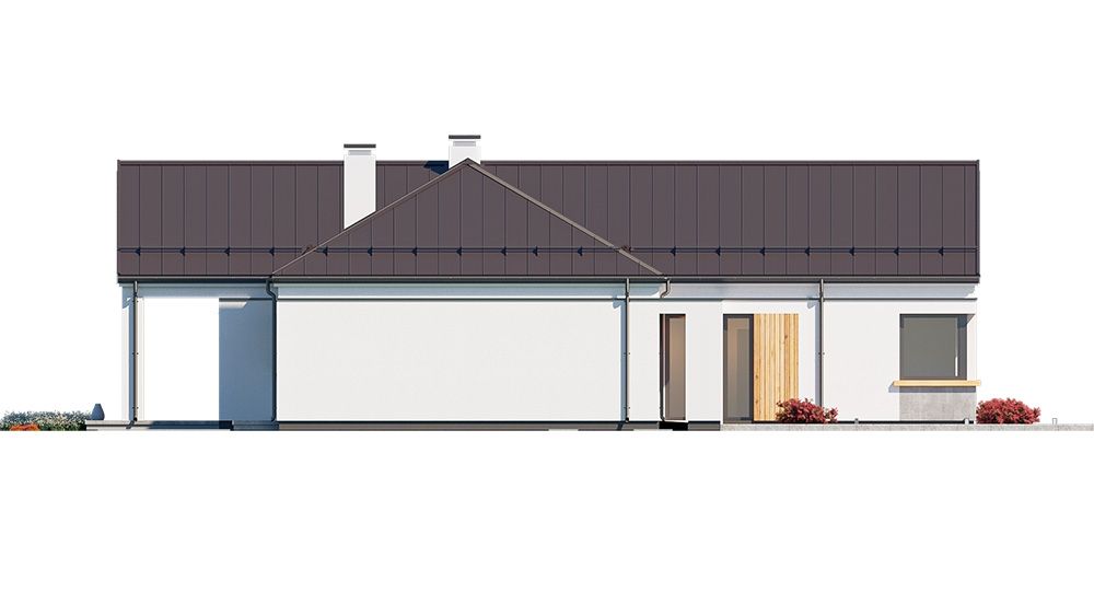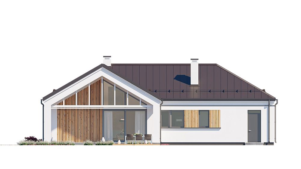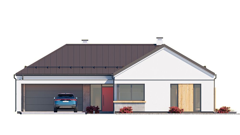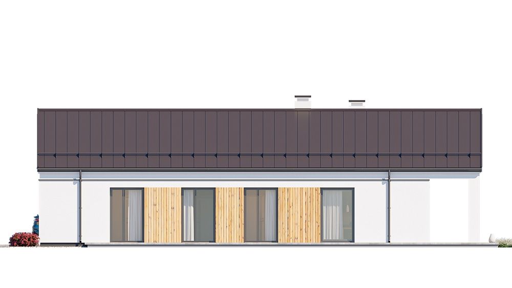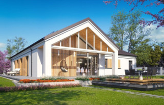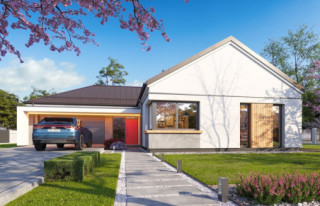 Projekt domu Sielanka 4 jest kolejną wersją projektu z popularnej serii „Sielanek” z MG Projekt. Jest to wersja w architekturze nowoczesnej, z dachami bez okapów, zbliżonej do stylistyki „domu-stodoły”. Sielanka 4 to projekt parterowego budynku, rzutem o kształcie litery T, z główną bryłą z dachem dwuspadowym i dobudowaną częścią garażową przykrytą wielospadowym dachem. Dom z cofniętym garażem i wejściem tworzącym duży placyk – podjazd frontowy. Z elewacją ogrodową z oryginalnym dużym zadaszonym tarasem -przesłużeniem salonu. Budynek zaprojektowano dla 4- 5-oosobowej rodziny, chcącej komfortowo mieszkać w parterowym domu, bez biegania po schodach, z bezpośrednim dostępem do ogrodu z każdego pokoju. Dom nadaje się na działkę z ogrodem z tyłu lub z od strony bocznej - zależnie od jego posadowienia i orientacji względem stron świata. Architektura budynku jest nowoczesna, wykorzystująca modne materiały i zestawienia kolorystyczne, korzysta z modnego języka detali wykorzystywanego we współczesnych domach jednorodzinnych. Front budynku urozmaicono ciekawym podcieniem wejściowym z szerokimi drzwiami z naświetlem bocznym. Dodatkową ozdobą jest narożne okno i okna do podłogi rozdzielone drewnianą okładziną ściany. Od strony ogrodu najważniejszym elementem jest interesująco zaprojektowany podcień – zadaszenie tarasu, ozdobiony pięknymi przeszkleniami salonu i okładziną drewnianą. Całość domu przykryta jest dachem z blachy na rąbek stojący w grafitowym kolorze, będącym znakomitym kontrastem dla białych elewacji. Wnętrze budynku podzielono na strefy: w części środkowej mamy ogólną przestrzeń dzienną do życia, po lewej stronie część garażowo-gospodarczą, a z prawej strony - pokoje sypialne z łazienkami garderobami. Do domu wchodzimy z zadaszonego podestu szerokimi doświetlonymi drzwiami do przedsionka z szatnią i następnie do holu połączonego przestrzennie z salonem i kuchnią. Kuchnia jest tutaj otwarta na salon i na ogród. Pokój dzienny ma podniesiony sufit aż do kalenicy dachu, dzięki czemu jest w nim jeszcze więcej przestrzeni i powietrza. Z salonu rozpościera się piękny widok na ogród przez dwukondygnacyjne szerokie okno. Z holu korytarzem przechodzimy do części prywatnej, gdzie znajdziemy 4 pokoje, wśród nich sypialnię master z podwójną garderobą. Wnętrze dopełnia duża łazienka, wc i pomieszczenie na pralkę, suszarkę i kosze do prania. W części gospodarczej znajdziemy duży dwustanowiskowy garaż, z magazynem, oraz kotłownię. Nad częścią parteru zaprojektowano przestrzeń strychową - magazyn domowych rzeczy „nadprogramowych”. Konstrukcyjne dom jest zaprojektowany w bardzo prosty sposób. Prace murarskie i betoniarskie kończą się na wieńcach nad ścianami parteru. Pozostała konstrukcja budynku to układ drewnianych wiązarów prefabrykowanych, tworzących strop nad parterem, oraz więźbę dachową. Takie rozwiązanie znakomicie upraszcza budowę, przyspiesza ją - i przede wszystkim obniża koszty. Dom zaprojektowano jako energooszczędny, z dobrymi izolacjami i nowoczesnymi instalacjami. Budynek jest łatwy i szybki w budowie i będzie niedrogi w późniejszej eksploatacji. To świetna propozycja dla Inwestorów szukających domu parterowego, wygodnego i ekonomicznego, a zarazem na wskroś nowoczesnego i oryginalnego. Zapraszamy do zapoznania się ze wszystkimi projektami z serii Sielanka: https://www.mgprojekt.com.pl/sielanka, https://www.mgprojekt.com.pl/sielanka-2, https://www.mgprojekt.com.pl/sielanka-2-b, https://www.mgprojekt.com.pl/sielanka-3, https://www.mgprojekt.com.pl/sielanka-4.