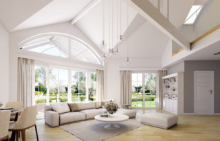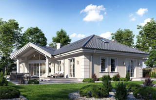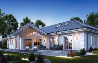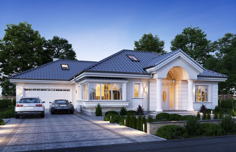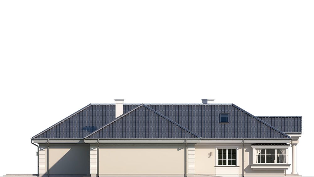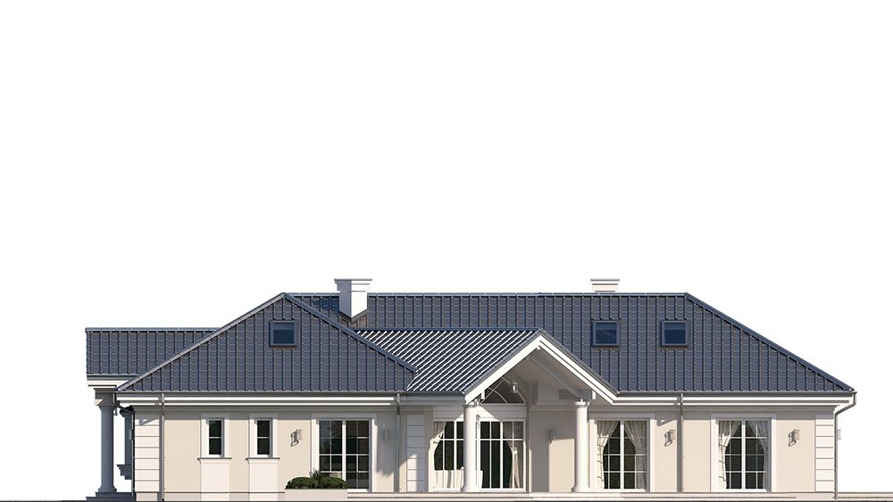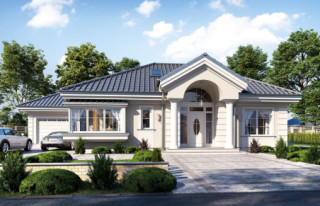 Projekt domu Willa Parkowa 7 jest kolejną wersją projektu z cieszącej się popularnością serii "Willi Parkowych". wariant zwężony, mieszczący się na węższej działce, o szerokości nieco powyżej 26 metrów. Budynek jest klasyczną podmiejską willą, swoim stylem nawiązujący do architektury dworkowej i rezydencyjnej. Dom jest parterowy, o rozbudowanym rzucie w kształcie litery „T”. Bryła budynku przykryta jest wielospadowym dachem, z charakterystycznym pięknym zadaszeniem tarasu ustawionym pod kątem 45 stopni. Połączenie ciekawego kształtu budynku, oryginalnego i funkcjonalnego wnętrza, dopracowanych detali elewacji, razem dają reprezentacyjną willę, która z pewnością wyróżni się spośród wielu zwykłych domów. Front budynku zaprojektowano w taki sposób, aby podkreślić strefę wejściową. Garaż został celowo cofnięty w głąb działki, a na pierwszym planie jest dwukondygnacyjny portyk wejściowy, z pięknymi drzwiami z naświetlami bocznymi i łukową kolebką. W elewacji frontowej zaprojektowano narożne wykuszowe okno kuchenne, wysunięte poza obrys ściany, dzięki czemu blat kuchenny jest głębszy. Cofnięte wrota garażowe tworzą od frontu wygodny podjazd-dziedziniec, na którym bez problemu zmieszczą się nawet 4 dodatkowe auta. Od strony ogrodu mamy ciekawie skomponowane dwie połączone elewacje – boczną i tylną, przełamane skośną ścianą salonu z pięknym przeszkleniem, zakończonym łukowym naświetlem, oraz zadaszeniem tarasu na kolumnach. Taras ogrodowy znajduje się w narożniku domu, otwierając widok na tył i bok domu. Dzięki mniejszej szerokości domu jego bryła bez trudu wpasuje się na niezbyt szeroką parcelę. Wszystkie elewacje domu ozdobione zostały gzymsami, opaskami okien i boniowaniami narożników ścian, nawiązując do ponadczasowej klasycznej architektury i dodając budynkowi eleganckiego sznytu. Wnętrze willi zaprojektowano dzieląc dom na części. Od frontu dostajemy się przez reprezentacyjny podwyższony przedsionek z szatnią wprost do przestrzeni dziennej, z salonem, jadalnią i holem, urozmaiconej ustawioną na środku ścianą kominkowo-telewizyjną, oraz pięknym otwarciem przestrzennym sufitu, z antresolą i szerokim widokiem z salonu na taras i ogród. Z prawej strony wejścia mamy dodatkowy pokój oraz dzienną toaletę, z lewej strony znajduje się duża kuchnia z wyspą, kątem do codziennych posiłków, spiżarnią i przejściem do części gospodarczo -garażowej domu. W części gospodarczej znajdują się pralnia, obszerna kotłownia i dwustanowiskowy garaż. W części tylnej domu, bliżej ogrodu zaprojektowano sypialnie domowników, odgrodzone akustycznie korytarzem. Znajdują się tutaj dwie sypialnie dziecięce z łazienką, oraz apartament master z łazienką i garderobą, oraz własnym mini tarasem porannym. Na parterze domu udało się zmieścić wszystkie pomieszczenia potrzebne domownikom do funkcjonowania. Powyżej znajduje się dodatkowo duży strych, który bez problemu można zaadaptować na poddasze użytkowe. Może ono pełnić rolę dodatkowej antresoli będącej przedłużeniem salonu z dwoma dodatkowym pokojami, albo można oddzielić tą przestrzeń ściankami i zamknąć ją jako strych - domowy magazyn. Willa Parkowa 7 jest atrakcyjnym, stylowym domem, z pewnością nie najprostszym w budowie, ale dzięki zastosowanym dobrym izolacjom i nowoczesnym materiałom i instalacjom - niedrogim w późniejszej eksploatacji. To propozycja dla Inwestorów, którzy marzą o domu wyjątkowym, oryginalnym, nietuzinkowym. Dla Inwestorów, którzy uwielbiają stylowe wille i podoba im się koncept domu parterowego, bez konieczności biegania po schodach. Zapraszamy do obejrzenia wszystkich projektów domów z serii Willa Parkowa: https://www.mgprojekt.com.pl/willa-parkowa, https://www.mgprojekt.com.pl/willa-parkowa-2, https://www.mgprojekt.com.pl/willa-parkowa-3, https://www.mgprojekt.com.pl/willa-parkowa-4, https://www.mgprojekt.com.pl/willa-parkowa-5, https://www.mgprojekt.com.pl/willa-parkowa-6, https://www.mgprojekt.com.pl/willa-parkowa-6-d, https://www.mgprojekt.com.pl/willa-parkowa-7, https://www.mgprojekt.com.pl/willa-parkowa-8-a, https://www.mgprojekt.com.pl/willa-parkowa-8-b, https://www.mgprojekt.com.pl/willa-parkowa-9, https://www.mgprojekt.com.pl/willa-parkowa-10, https://www.mgprojekt.com.pl/willa-parkowa-b, https://www.mgprojekt.com.pl/willa-parkowa-c, https://www.mgprojekt.com.pl/willa-parkowa-d.