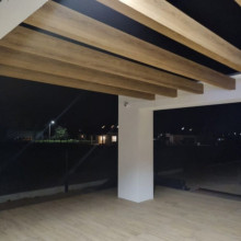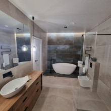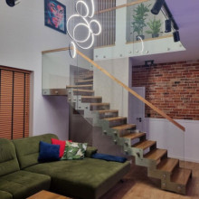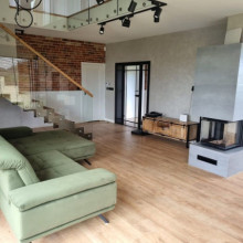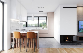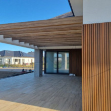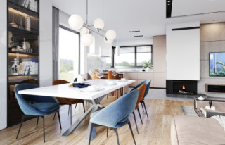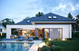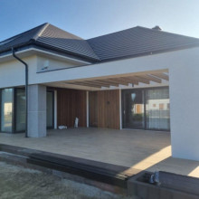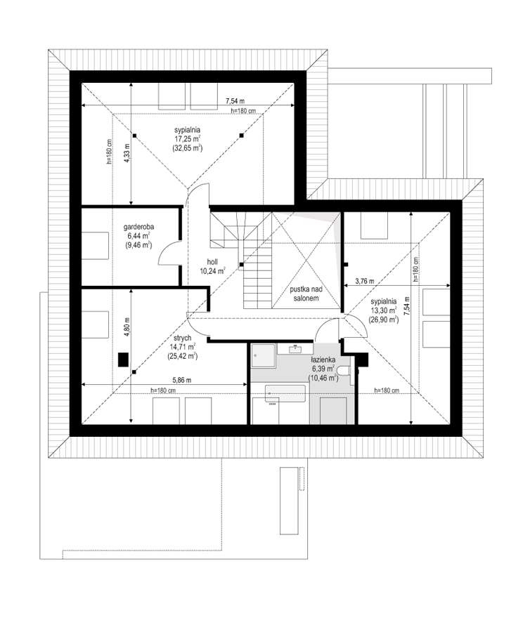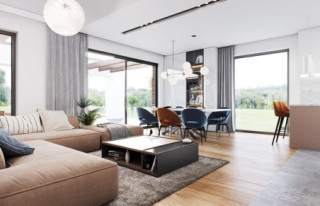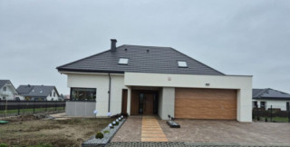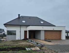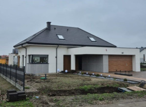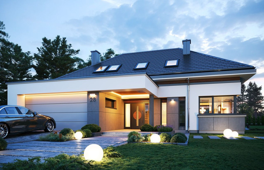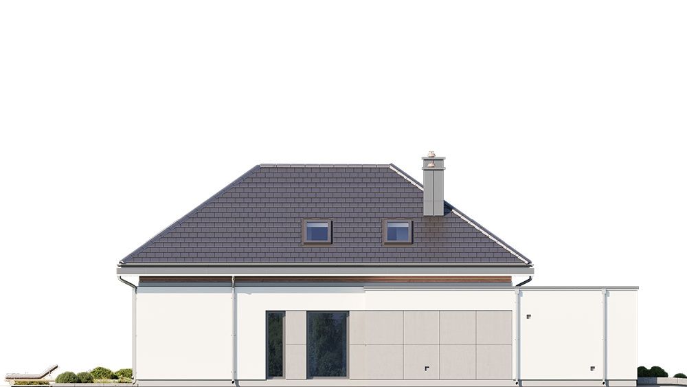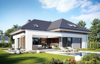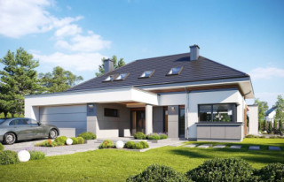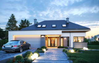 Projekt domu Hiacynt 3 jest wersją wariantową projektu z popularnej serii "Hiacyntów". Jest to pomniejszona wersja bazowego projektu, o powierzchni użytkowej około 150 m2. Budynek ma mniejszą powierzchnię zabudowy, jest węższy - dzięki czemu zmieści się swobodnie na mniejszej działce. Dom jest też tańszy w realizacji, ale został zmniejszony w taki sposób, aby nie ustępować bardzo bazowej wersji domu pod względem estetyki, czy funkcjonalności. Budynek zaprojektowano jako parterowy z poddaszem użytkowym. Parter domu zakomponowano na planie litery "T". Dom przykryty jest wielospadowym dachem, z fragmentem płaskiego zadaszenia nad garażem. Od strony ogrodu zaprojektowano częściowo osłonięty taras - patio, mieszczący się między ścianami budynku i zamykającą go żelbetową belką ze słupem i pergolą. Nowoczesna architektura domu podkreślona została ciekawymi detalami wykończeniowymi. Duże przeszklenia elewacji, narożne okna, kontrastujące z bielą ścian fragmenty obłożone betonem architektonicznym i drewnem - wszystkie te elementy tworzą spójną kompozycyjnie całość. Podziały elewacji na poziome pasy w linii okien i powyżej, w linii nadproży nad oknami, tworzą ramy dla strefy wejściowej od frontu domu i strefy wypoczynkowej od strony tarasu ogrodowego. Wnętrze budynku zaprojektowano w sposób pozwalający mieszkać domownikom tylko na parterze - można też wykorzystywać całość domu z poddaszem. Do budynku wchodzimy reprezentacyjnymi drzwiami z naświetlami wprost do holu i części dziennej. Nad pokojem dziennym zaprojektowano pustkę i otwarcie przestrzenne z antresolą poddasza, pięknie powiększającą przestrzeń domu. W salonie przewidziano miejsce na meble wypoczynkowe na wprost ściany kominkowo – telewizyjnej, oraz wygodny stół jadalny. Częściowo otwarta kuchnia ze spiżarnią i pięknym narożnym oknem powiększa cześć dzienną. Szerokie drzwi balkonowe otwierają wnętrze na taras i ogród. Na parterze przewidziano dodatkowo apartament rodziców z garderobami i łazienką, oraz dodatkowy pokój - sypialnię lub gabinet. Przy strefie wejściowej umieszczono dwustanowiskowy garaż, kotłownię i pomieszczenie pralni. Na poddaszu miejsce znalazły trzy pokoje sypialne z łazienką i garderobą. Dom został zaprojektowany jako energooszczędny. Ma bardzo dobre izolacje termiczne i nowoczesne instalacje, dzięki czemu będzie niedrogi w utrzymaniu. Hiacynt 3 to doskonała propozycja dla Inwestorów szukających nowoczesnego, komfortowego domu z oryginalnymi ciekawymi rozwiązaniami architektonicznymi. Zapraszamy do zapoznania się z innymi projektami: projekt domu Hiacynt, projekt domu Hiacynt 2, projekt domu Hiacynt 4, projekt domu Hiacynt 5, projekt domu Hiacynt 6., projekt domu Hiacynt 7, projekt domu Hiacynt 7 B, projekt domu Hiacynt 8. Projekty dostępne są w odbiciu lustrzanym.