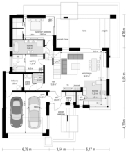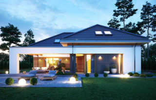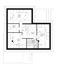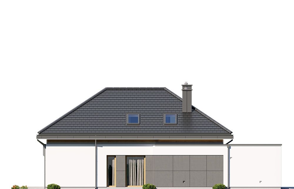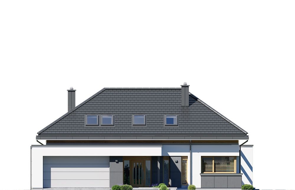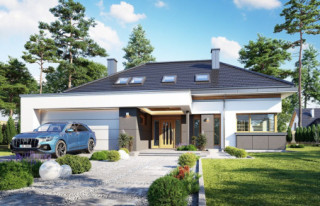 Projekt domu Hiacynt 4 jest wersją wariantową projektu z popularnej serii „Hiacyntów”. Tym razem jest to projekt nieco zmniejszony w stosunku do wersji bazowej, o powierzchni użytkowej ca 185 m2. Dom zaprojektowano na takiej samej zasadzie jak projekt bazowy, wykorzystując ten sam język detali architektonicznych, podobny kształt bryły i układ funkcjonalny. Dom jest po prostu proporcjonalnie zmniejszony. Hiacynt 4 to budynek parterowy z poddaszem użytkowym, zakomponowany na planie litery „T”, przykryty wielospadowym dachem, z częścią dachu płaskiego nad garażem. Elementami wyróżniającymi sylwetkę budynku są : od frontu - zadaszona strefa wejściowa podcieniem i szerokimi drzwiami frontowymi z naświetlami, a od tyłu - narożnik tarasu ogrodowego zamknięty ścianami i żelbetową ramą zakończoną pergolą. Ściany domu zostały zaprojektowane na zasadzie kontrastu białych fragmentów z okładzinami z betonu architektonicznego i drewna. Duże przeszklenia dodatkowo zdobią elewacje i otwierają wnętrze na otaczający ogród. Wnętrze domu zostało zaprojektowane w podobny sposób do projektu bazowego Hiacynt 1, ale jest nieco mniejsze. Do domu wchodzimy ładnym przedsionkiem z szatnią do holu połączonego z pokojem dziennymi i kuchnią. Na wprost wejścia znajdują się reprezentacyjne schody, połączone z pustką nad salonem i antresolą poddasza. Dodatkowe pokoje na parterze to cześć państwa domu - z garderobami, łazienką i wyjściem na taras, dodatkowy pokój - sypialnia lub gabinet, oraz część gospodarcza z dwustanowiskowym garażem, kotłownią i pomieszczeniem pralni. Na poddaszu swoje miejsce mają trzy pokoje sypialne, garderoba i łazienka. Cały budynek został zaprojektowany jako energooszczędny, z bardzo dobrymi izolacjami termicznymi i wykorzystaniem nowoczesnych instalacji. Dom będzie niedrogi w późniejszym utrzymaniu. Hiacynt 4 to wymarzona propozycja dla Inwestorów planujących wybudować oryginalny komfortowy dom, z rozbudowanym parterem, z nowoczesnymi i energooszczędnymi rozwiązaniami. Świetna propozycja dla tych osób, którym Hiacynt 1 nie mieści się na działce, lub potrzebują wybudować po prostu dom trochę mniejszy i trochę mniej kosztowny. Zapraszamy do zapoznania się z innymi projektami: projekt domu Hiacynt, projekt domu Hiacynt 2, projekt domu Hiacynt 3, projekt domu Hiacynt 5, projekt domu Hiacynt 6., projekt domu Hiacynt 7, projekt domu Hiacynt 7 B, projekt domu Hiacynt 8. Projekty dostępne są w odbiciu lustrzanym.