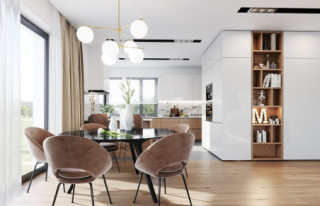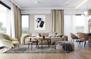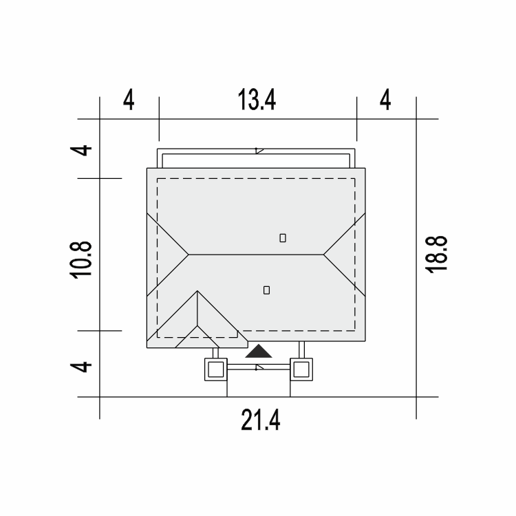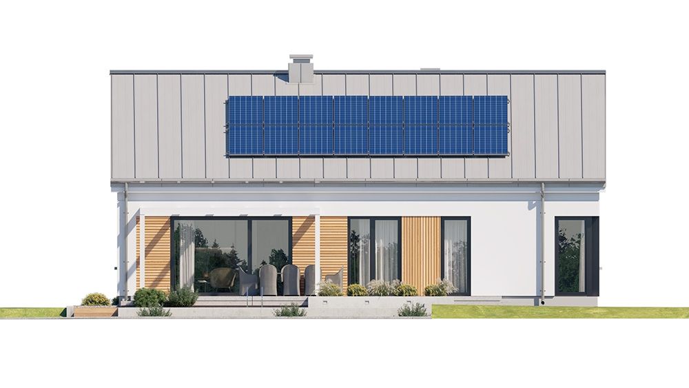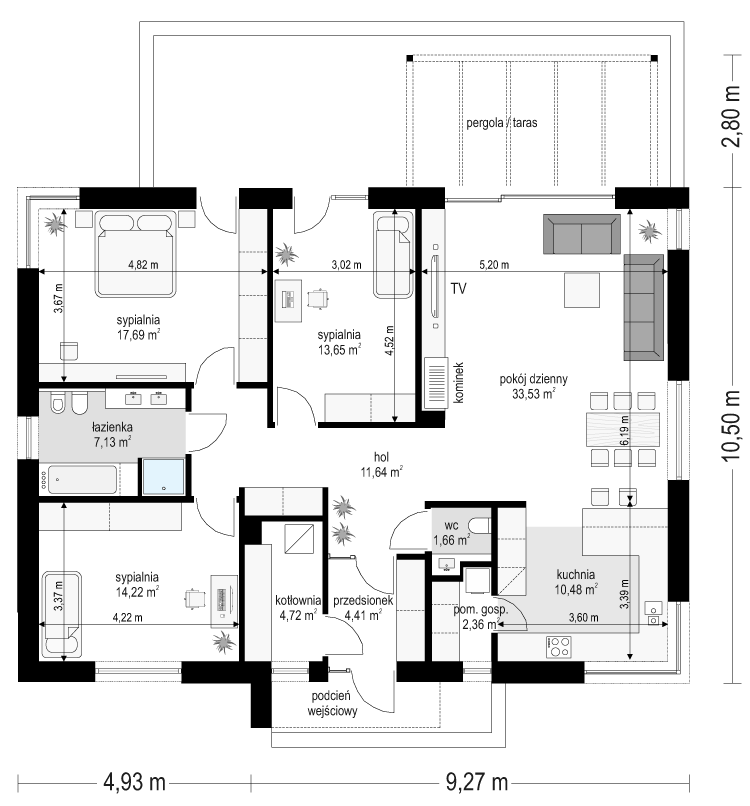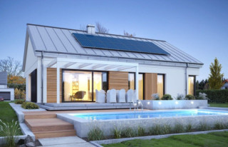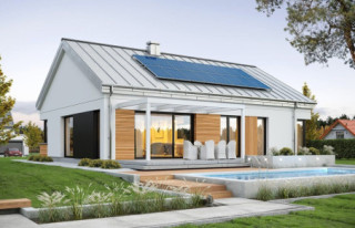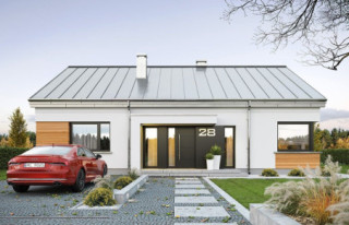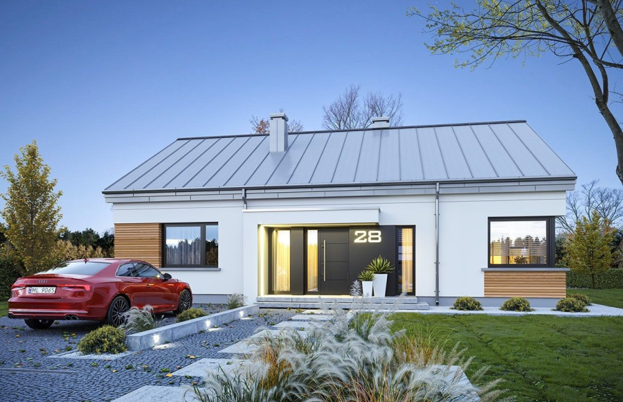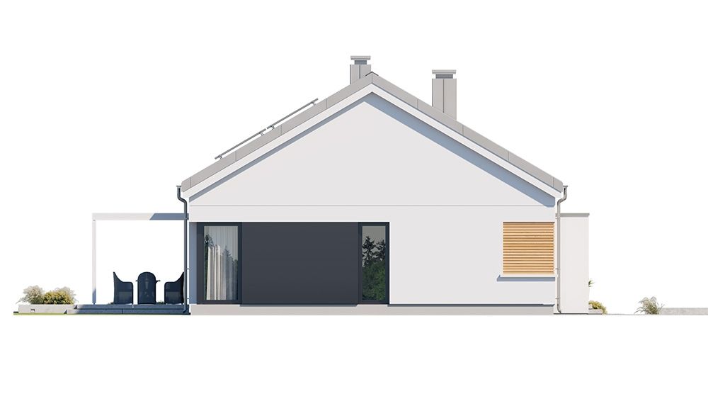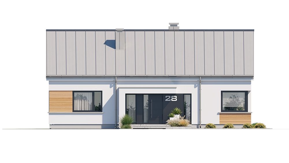 Projekt domu Dom na Praktycznej to projekt parterowego domu jednorodzinnego dla 3-4 osobowej rodziny. Budynek zaprojektowano na planie prostokąta, przykrytego łagodnym dwuspadowym dachem z blachą na rąbek stojący, w modnej stylistyce domu-stodoły, z maksymalnie skróconymi okapami. Prostota architektury, połączona z ciekawymi detalami i konsekwentną, pełną kontrastów kolorystyką, tworzy bardzo interesujący nowoczesny wygląd domu. Budynek sprawia ważenie solidnego, przemyślanego i wykonanego z porządnych materiałów. Front domu ma reprezentacyjne wejście z szerokimi drzwiami z naświetlem bocznym. Podest wejściowy przykrywa ciekawe zadaszenie w kształcie litery „L”. Narożne okno kuchni dodatkowo ozdabia elewację, dając fajny efekt we wnętrzu. Elewację tylną domu dominuje szerokie przeszklenie z salonu na ogród i taras, z zadaszeniem nad tarasem w formie pergoli lub terasoli. Wnętrze zaprojektowano z zachowaniem podziału na część dzienną i nocną. Do środka wchodzimy ładnym przedsionkiem z szafami wprost do holu, z niego rozchodzimy się do części dziennej z salonem i kuchnią, oraz do sypialni domowników. Połączona przestrzeń dzienna składająca się a salonu i kuchni mieści w sobie cześć wypoczynkową z siedziskami i ścianą kominkowo – telewizyjną, kąt jadalny z wygodnym stołem i kuchnię oddzieloną półwyspem (lub wyspą ) - ze ścianą w pełnej zabudowie i spiżarnią. Część nocna domu to trzy wygodne sypialnie z dużymi zabudowanymi szafami, oraz duża łazienka. Z przedsionka dodatkowo mamy przejście do pomieszczenia gospodarczego kotłowni. Cały program funkcjonalny budynku przewidziano na jednym poziomie parteru, ale powyżej właściciele mają jeszcze dostęp do niemałej przestrzeni strychowej, która może być zagospodarowana jako domowy magazyn, ale może też być zaadaptowana na poddasze – wedle inwencji mieszkańców. Konstrukcja domu jest bardzo prosta - cały rzut zamknięty jest czterema zewnętrznymi ścianami. Konstrukcja dachu i stropu wykonana jest z wiązarów prefabrykowanych. Najprościej, najpraktyczniej i najtaniej jak to tylko możliwe. Budynek jest zaprojektowany jako energooszczędny - dzięki bardzo dobrym ociepleniom i nowoczesnym instalacjom, koszty utrzymania domu będą minimalne. „Dom na Praktycznej” to praktyczna i sensowna propozycja dla Inwestorów planujących budowę zgrabnego, ładnego i nie za dużego domu jednorodzinnego, który będzie łatwy i niedrogi w budowie i tani w późniejszym utrzymaniu. Zapraszamy!