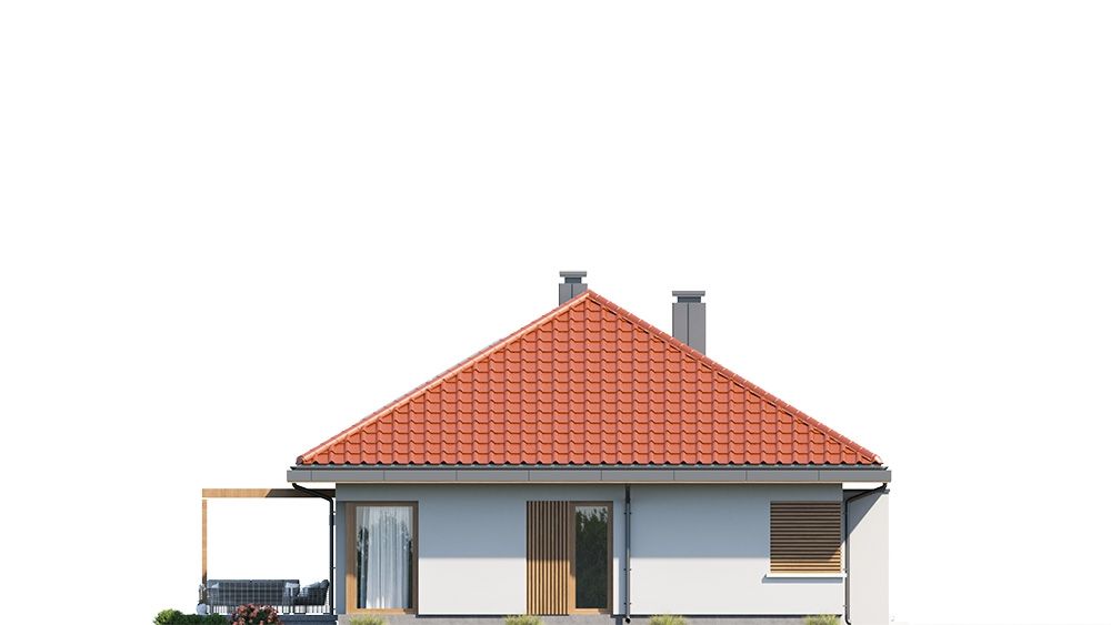Projekt domu Dom na Praktycznej 3 to projekt parterowego domu jednorodzinnego z serii „Praktycznych”. Projekt wyłamujący się z modnej ostatnio czarno-biało-antracytowej kolorystyki i stylistyki. Zamiast tego mamy domek o ładnej, miłej, przyjemnej dla oka architekturze, z czerwonym dachem i dużą ilością drewnianych wstawek i elementów, tworzących razem pełną wdzięku i ponadczasowej elegancji architekturę. Budynek zaprojektowany jest na planie prostokąta, zwieńczony symetrycznym czterospadowym dachem przykrytym czerwoną dachówką. Nowoczesna forma architektury, połączona z tradycyjną kolorystyką materiałów tworzą udane połączenie. Patrzymy na ten dom i odczuwamy radość i poczucie spełnienia - to realizacja marzenia o własnej przystani, o własnym miejscu na ziemi. Front domu ozdobiony jest szerokimi drzwiami z naświetlem i designeskim zadaszeniem podestu wejściowego. Od strony elewacji ogrodowej główną rolę gra piękne okno salonu otwierające wnętrze na taras, oraz zadaszenie w postaci pergoli ( lub tarasoli ). Wnętrze domu zaprojektowano z zachowaniem podziału na część dzienną i nocną. Do centralnie usytuowanego holu dostajemy się przez duży przedsionek, z którego przechodzimy do części dziennej z salonem i kuchnią, oraz części z sypialniami domowników. Salon mieści w sobie kącik wypoczynkowy z siedziskami i ścianą kominkowo – telewizyjną, jadalnię z wygodnym stołem i pięknym oknem do podłogi i połączony jest z kuchnią z półwyspem. Część prywatna domowników to trzy wygodne sypialnie z obszernymi zabudowanymi szafami, oraz duża łazienka. Z sypialni rodziców możemy wyjść dodatkowymi drzwiami balkonowymi na taras – na poranną kawkę. Obok przedsionka znajduje się pomieszczenie gospodarcze kotłowni. Całość wnętrza budynku zaprojektowano na jednym poziomie parteru, ale powyżej właściciele mają dodatkowo dostęp do przestrzeni strychowej - domowego magazynu. Konstrukcja domu jest prosta. Rzut parteru wyznaczają cztery ściany zewnętrzne, a całość przykryta jest konstrukcją dachową z wiązarów prefabrykowanych - prosto i efektywnie. Budynek jest zaprojektowany jako energooszczędny - dzięki bardzo dobrym ociepleniom i nowoczesnym instalacjom, koszty utrzymania domu będą minimalne. „Dom na Praktycznej 3 ” to świetna propozycja dla Inwestorów planujących budowę uroczego, niedużego domu jednorodzinnego, który będzie prosty w budowie i niedrogi w późniejszym utrzymaniu. Zapraszamy!
