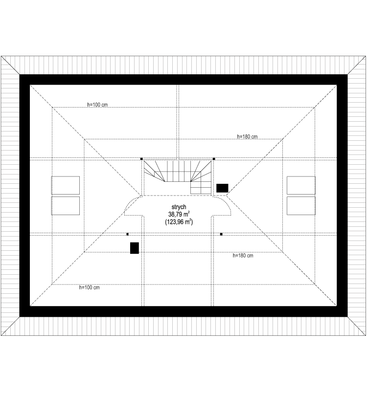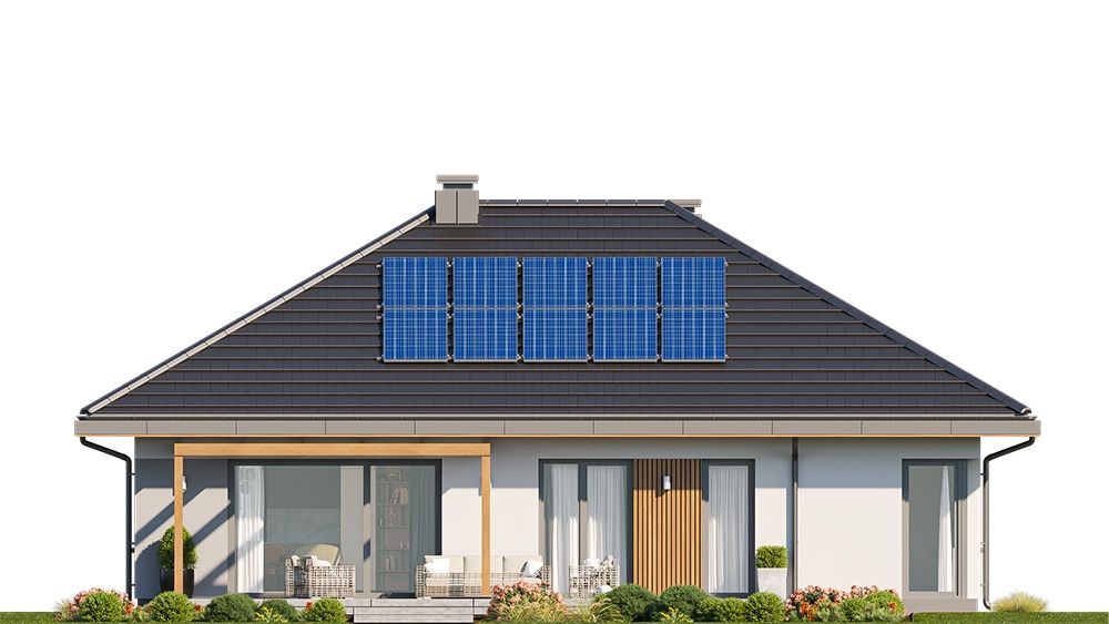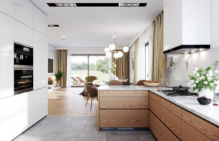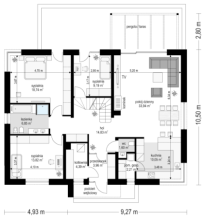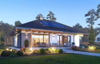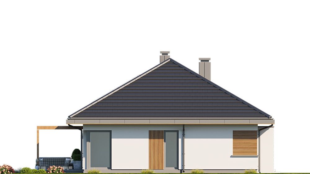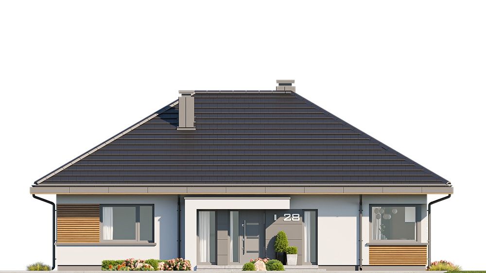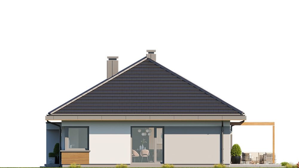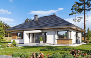 Projekt domu Dom na Praktycznej 3 B to projekt z serii „Dom na Praktycznej ”. Jest to projekt budynku parterowego, z górną przestrzenią do dowolnego zaaranżowania na pełne poddasze użytkowe, lub strych. Dom zaprojektowano ze stropem żelbetowym monolitycznym nad parterem, dzięki czemu uzyskujemy pełnowartościową górną kondygnację. Bryłę budynku zaprojektowano na prostokątnym rzucie przykrytym czterospadowym dachem z nowoczesną płaską dachówką w kolorze grafitowym. Architektura domu jest prosta i elegancka. Elewację frontową zdobi reprezentacyjne wejście, z drzwiami z naświetlem i oryginalnym zadaszeniem. Od strony ogrodu dom urozmaica piękne okno balkonowe salonu i zadaszony pergolą taras. Wnętrze domu zaprojektowano z zachowaniem podziału na część dzienną i nocną. Do centralnie usytuowanego holu ze schodami na poddasze dostajemy się przez duży przedsionek. Z holu przechodzimy do części dziennej - z salonem i kuchnią, oraz do pokoi sypialnych domowników. W salonie wydzielono jadalnię, oraz kącik wypoczynkowy przy oknie otwierającym wnętrze na taras i przy ścianie telewizyjno- kominkowej. Otwarta na wnętrze dzienne kuchnia, oddzielono półwyspem z barkiem. Kuchnia posiada całą ścianę w pełnej zabudowie i spiżarnię. Z przedsionka z kolei przechodzimy dodatkowo do pomieszczenia gospodarczego kotłowni. Pozostałe pokoje na parterze to sypialnia master, dodatkowa druga sypialnia, łazienka i jeszcze jeden pokój, mogący pełnić rolę sypialni lub gabinetu-pokoju do pracy. Na poddaszu bez żadnego problemu uzyskamy dodatkowe dwa duże pokoje z łazienką, a konstrukcja ramowa podpierająca więźbę dachu pozwoli zagospodarować poddasze bez słupków konstrukcyjnych w środku pomieszczeń. Konstrukcja domu jest prosta, choć droższa od pozostałych wariantów „Domów na Praktycznej” - z uwagi na żelbetowy strop monolityczny. Budynek jest zaprojektowany jako energooszczędny - dzięki bardzo dobrym ociepleniom i nowoczesnym instalacjom, koszty utrzymania domu będą minimalne. „Dom na Praktycznej 3 B” to bardzo dobra propozycja dla Inwestorów planujących budowę sensownego, niedużego domu jednorodzinnego, niedrogiego w utrzymaniu, który będzie rósł wraz z rodziną i domownikami i który będzie można dowolnie aranżować i zmieniać korzystając z dodatkowej przestrzeni nad parterem. Zapraszamy!