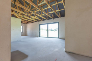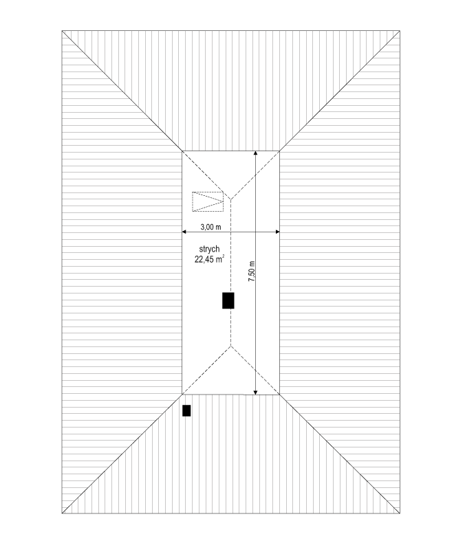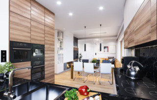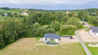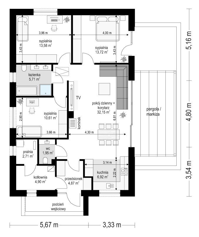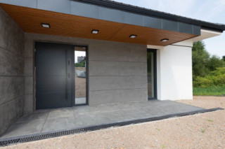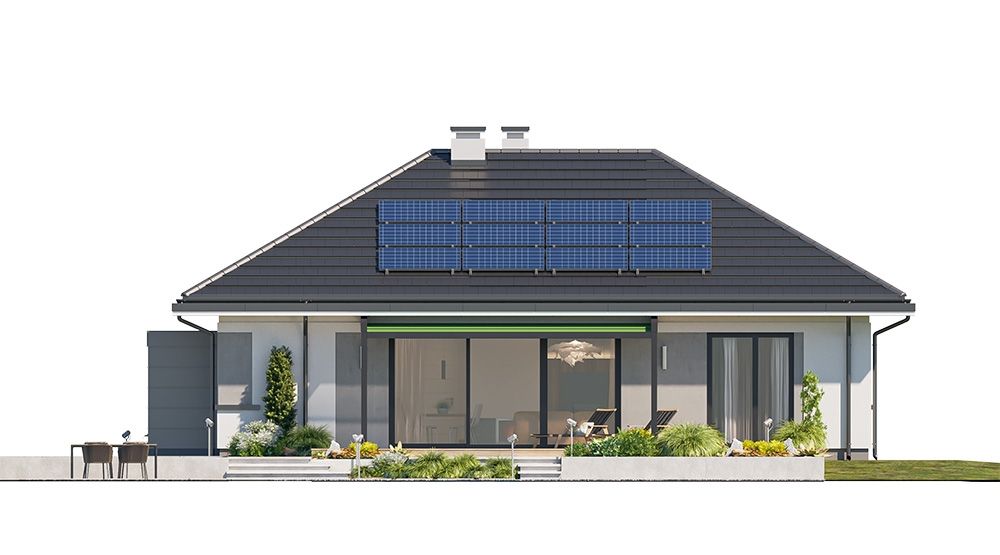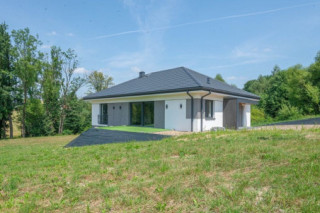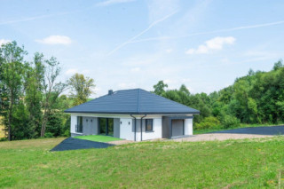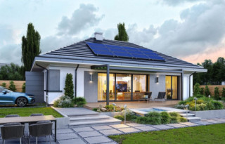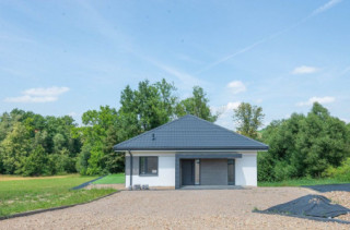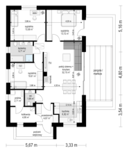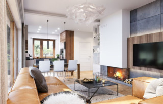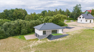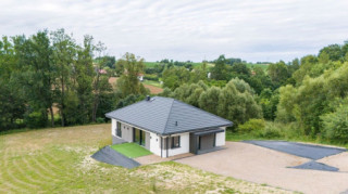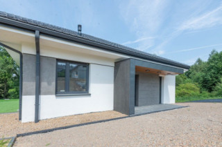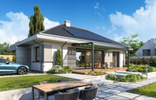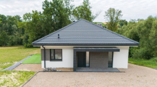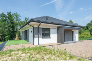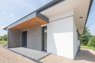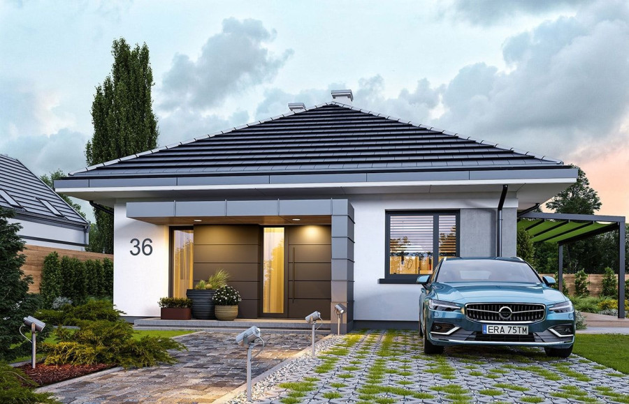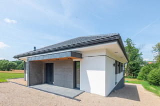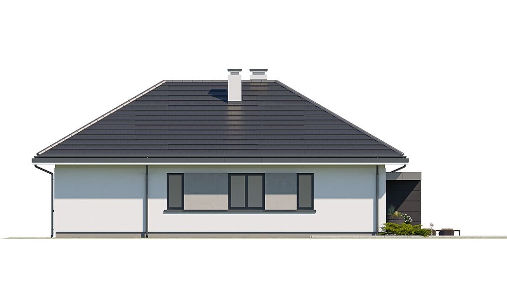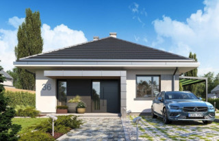 Projekt domu Dom na Przytulnej 2 to kolejna propozycja projektu niewielkiego parterowego domu z serii „przytulnych” - tym razem budynek dla 4-osobowej rodziny, na prostokątnym planie, przykryty czterospadowym dachem krytym dachówką. Cały program użytkowy domu mieści się na jednej kondygnacji. Głównym założeniem projektu jest funkcjonalność budynku, oraz jego późniejsze bezproblemowa użytkowanie. Architektura budynku jest nowoczesna, z atrakcyjną kolorystyką i zastosowanymi nowoczesnymi materiałami. Oszczędny detal, brak zbędnych ozdób i udziwnień, daje w efekcie prosty i elegancji wygląd zewnętrzny domu. Elewacja frontowa urozmaicona została reprezentacyjnym wejściem z zadaszeniem, z drzwiami z bocznym naświetlem i okładziną nawiązującą do podziałów na skrzydle drzwi. Od strony elewacji ogrodowej dominują szerokie drzwi balkonowe łączące salon z tarasem, oraz konstrukcja pergoli z odsuwaną markizą – zadaszeniem (tarasolą). Wnętrze domu zaprojektowano z podziałem na otwartą przestrzeń dzienną, z salonem i kuchnią, oraz część z trzema sypialniami i łazienką. Przy strefie wejściowej umieszczono dodatkowo dwa pomieszczenia techniczne dostępne z przedsionka - kotłownię i pralnię /suszarnię. W salonie mamy szeroką ścianę telewizyjno – kominkową, zestaw mebli wypoczynkowych i jadalnię z wygodnym stołem, a nade wszystko szerokie otwarcie drzwiami balkonowymi na taras i otaczający dom ogród. Z sypialni rodziców również zaprojektowano dodatkowe drzwi balkonowe na taras - miejsce spożywania porannej kawy. „Dom na Przytulnej 2” to budynek o prostej konstrukcji. Całą bryłę udało się zamknąć czterema ścianami zewnętrznymi - prościej się nie da. Parter domu zwieńczony jest czterospadowym dachem w konstrukcji z wiązarów, z przestrzenią strychową jako domowym magazynem rzeczy mniej i bardziej potrzebnych. Budynek jest energooszczędny, bardzo dobrze ocieplony i wyposażony w nowoczesne instalacje, dzięki czemu będzie tani w utrzymaniu. Łatwa konstrukcja domu uprości i przyspieszy budowę, oraz ułatwi późniejszą eksploatację i serwisowanie budynku. „Dom na Przytulnej 2 ” to propozycja niedużego niedrogiego domu, dla Inwestorów nie planujących wydać ostatnich pieniędzy w swoim życiu na budowę, chcących mieszkać komfortowo i swobodnie w swoim upragnionym domku.