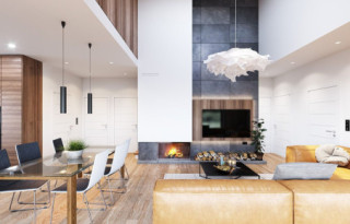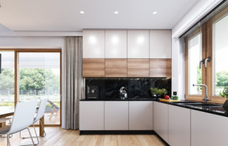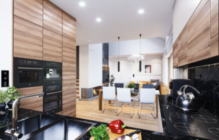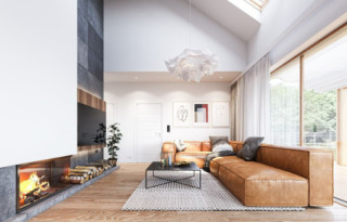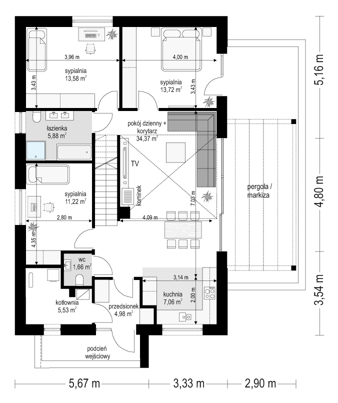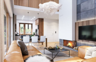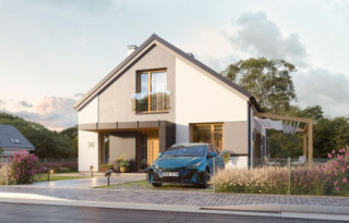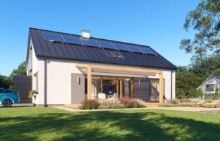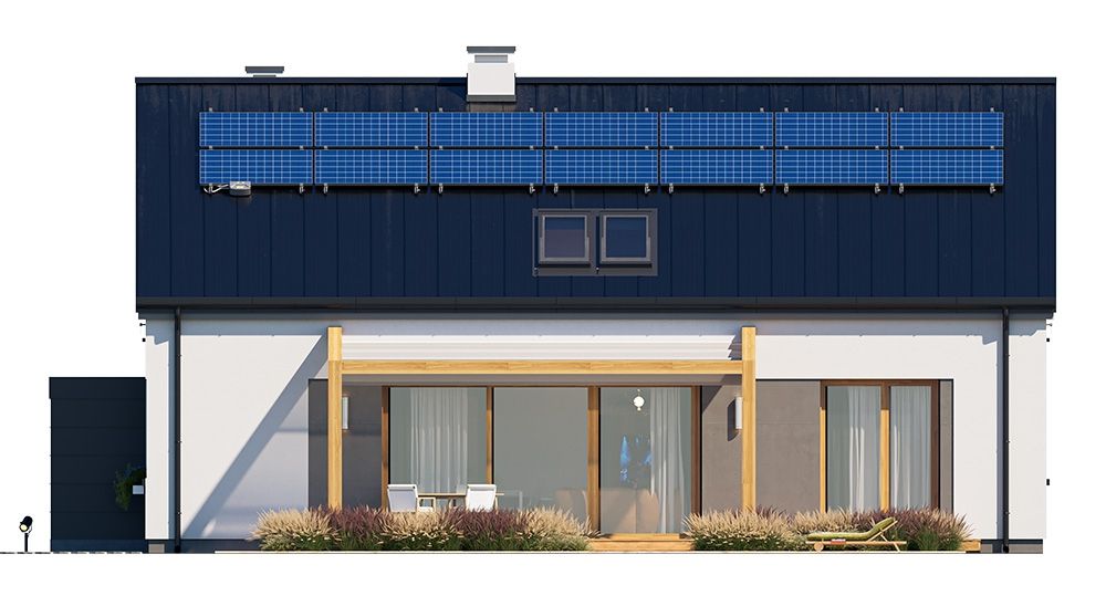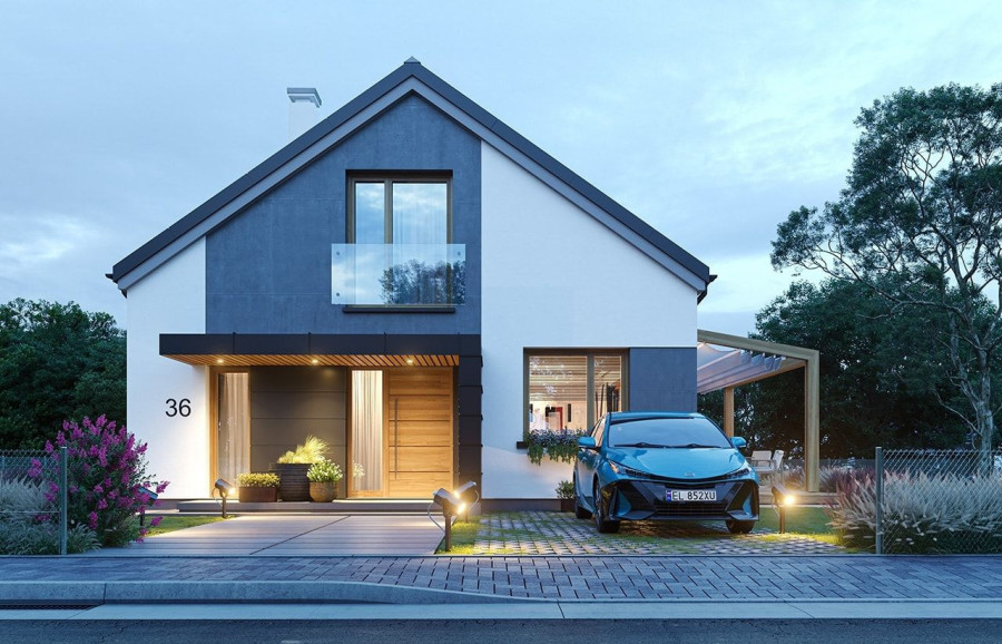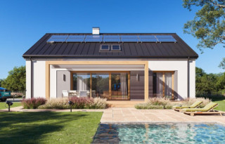 Projekt domu Dom na Przytulnej 3 to nasza następna propozycja niewielkiego projektu z serii „przytulnych” - tym razem jest to budynek z poddaszem użytkowym, zaprojektowany na takim samym rzucie jak inne warianty parterowe z serii, ale z dodatkowym poddaszem użytkowym - dzięki podniesieniu nieco w górę połaci dachu. Dom dla 4- 6-osobowej rodziny, na prostokątnym planie, przykryty dwuspadowym dachem krytym blachę na rąbek, w modnej stylistyce domu -stodoły, z uciętymi okapami. Podstawowy program użytkowy mieści się na kondygnacji parteru i zawiera przestrzeń dzienną z salonem, oraz trzy pokoje sypialne. Dodatkowo nad parterem mamy przestrzeń strychową do adaptacji na poddasze użytkowe, w której swobodnie zmieszczą się ekstra dwa pokoje oraz łazienka. Podsumowując, w tym niewielkim domu jednorodzinnym mamy do dyspozycji potencjalnie aż 6 pokoi. Daje to ogromne możliwości aranżowania wnętrza. Może tutaj zamieszkać wieloosobowa rodzina z trójką lub czwórką dzieci. Może to być również dom trzypokoleniowy z sypialnią dla seniorów. Dom można też zaaranżować urządzając miejsce pracy dla gospodarzy – biuro czy gabinet, umieszczając sypialnie dziecięce na poddaszu i wykorzystując 1 lub dwa pokoje na parterze na biznes. Możliwości aranżacji wnętrza jest tutaj mnóstwo. Głównym założeniem projektu jest funkcjonalność budynku i wyciśnięcie maksimum powierzchni i użyteczności z tej niewielkiej bryły. Architektura domu jest nowoczesna, z atrakcyjną kolorystyką i zastosowanymi nowoczesnymi materiałami. Oszczędny detal, brak zbędnych ozdób i udziwnień, daje w efekcie prosty i elegancji wygląd zewnętrzny. Elewacja frontowa to przede wszystkim wejście z zadaszeniem, z drzwiami z bocznym naświetlem i okładziną nawiązującą do podziałów na skrzydle drzwi. Od strony elewacji ogrodowej dominują szerokie drzwi balkonowe łączące salon z tarasem, oraz konstrukcja pergoli z odsuwaną markizą – zadaszeniem (tarasolą). Wnętrze domu to przede wszystkim otwarty salon, z dodatkową atrakcją - otwartym sufitem aż do dachu nad dużą częścią salonu. Pustka nad salonem powiększa i dodaje atrakcyjności pokojowi dziennemu. W salonie mamy szeroką ścianę telewizyjno – kominkową, zestaw mebli wypoczynkowych i jadalnię z wygodnym stołem, oraz szerokie otwarcie balkonowe na taras i otaczający dom ogród. Na parterze znajdują się też trzy pokoje, łazienka, wc, pomieszczenie gospodarcze dostępne z przedsionka wejściowego, oraz schody na strych/poddasze, z praktycznym schowkiem. Na górnej kondygnacji z powodzeniem zmieszczą się dwa wygodne pokoje oraz łazienka. „Dom na Przytulnej 3” ma bardzo prostą i tanią w budowie konstrukcję. Bryła zamknięta została czterema ścianami zewnętrznymi i dwuspadowym dachem z wiązarów ramowo-kratowych, co stanowi najbardziej ekonomiczne rozwiązanie dla tego typu domków. Budynek jest energooszczędny, bardzo dobrze ocieplony i wyposażony w nowoczesne instalacje, dzięki czemu będzie tani w utrzymaniu. Dom będzie się budować łatwo i szybko, a późniejsza jego eksploatacja i serwisowanie będą bezproblemowe. „Dom na Przytulnej 3 ” to propozycja niedrogiego domu, dla Inwestorów mających ograniczony budżet i niewiele czasu na budowanie. Chcących zamieszkać szybko, komfortowo i swobodnie w swoim upragnionym domku.