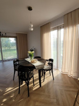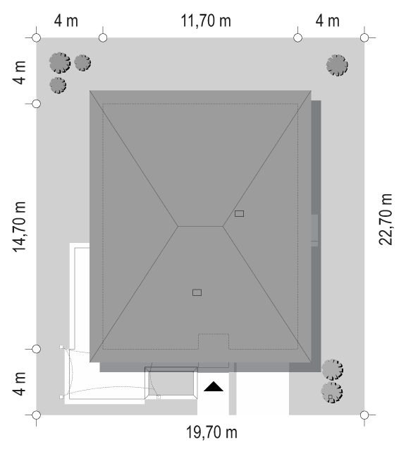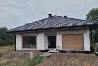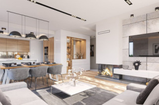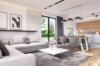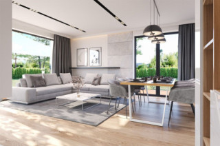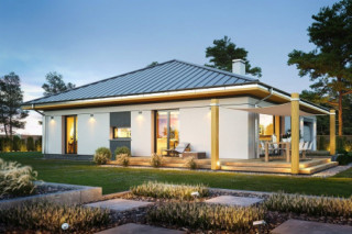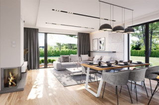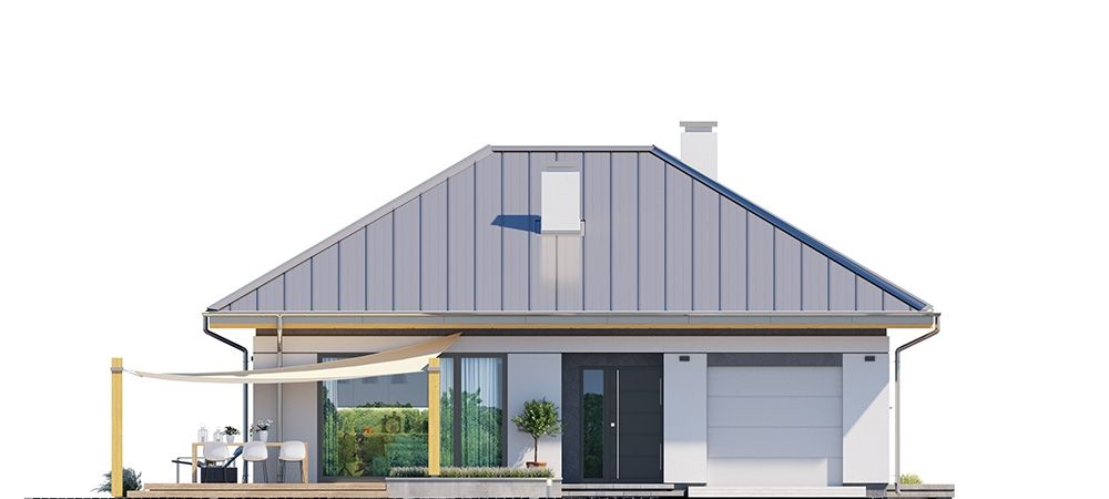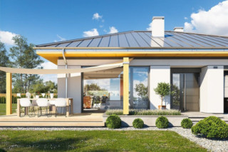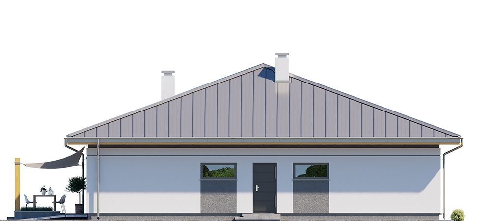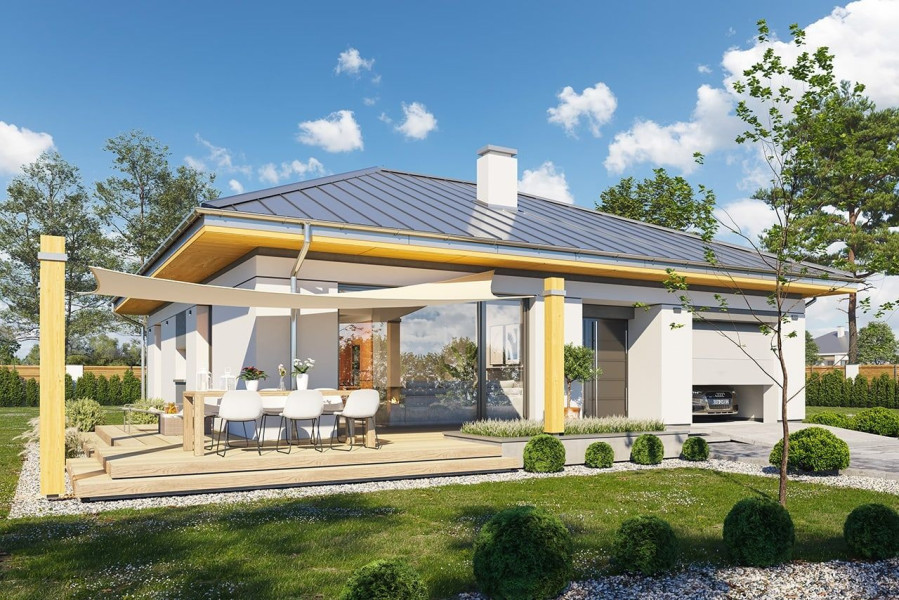 Projekt domu Dom na Słonecznej to projekt parterowego domu jednorodzinnego przeznaczonego dla 3- 4-osobowej rodziny. Dom został zaprojektowany z myślą o działkach z niekorzystnym usytuowaniem w stosunku do stron świata i nasłonecznienia. Dzięki lokalizacji salonu i części dziennej we frontowo-bocznym narożniku budynku, wnętrze jest bardzo dobrze oświetlone. Bryła domu zaprojektowana została na planie prostokąta, przykrytego czterospadowym łagodnym dachem, kryjącym w sobie przestrzeń strychową wygospodarowaną w przestrzeni konstrukcji dachowej z wiązarów prefabrykowanych. Bryła domu jest bardzo prosta, konstrukcja budynku również, dzięki czemu dom jest nieskomplikowany w budowie. Architektura budynku jest nowoczesna. Elewacje urozmaicono dużymi atrakcyjnymi przeszkleniami okien, oraz kontrastującymi kolorystycznie fragmentami ścian. Dach budynku pokryty jest blachą na rąbek stojący. Wejście do domu zaakcentowano podcieniem z szerokimi nowoczesnymi drzwiami wejściowymi z naświetlem bocznym. Wnętrze domu podzielone zostało na trzy części. Obszernym przedsionkiem wchodzimy do części dziennej połączonego salonu, holu i kuchni. W salonie wygospodarowano część wypoczynkową z narożnym siedziskiem i ścianą telewizyjno -kominkową, oraz jadalnię. Otwarta kuchnia z półwyspem, spiżarnią i ścianą z pełną zabudową, powiększa dodatkowo wnętrze. Z centralnie usytuowanego holu przechodzimy korytarzem wgłęb domu do części nocnej z sypialniami, gdzie znajdują się dwa pokoje dziecięce z łazienką, oraz sypialnia rodziców z garderobami. Uzupełnieniem programu użytkowego jest część gospodarcza, czyli dostępny z przedsionka garaż i pomieszczenie kotłowni. Wnętrze domu jest bardzo wygodne i komfortowe i odpowiada na wszystkie potrzeby czteroosobowej rodziny. Dodatkowo, dzięki usytuowaniu salonu, ogródek może znajdować się z boku domu, lub od frontu - przy wycofaniu budynku wgłęb działki. Takie rozwiązanie jest optymalne dla działek z wjazdem od południa lub południowego wschodu. Budynek jest energooszczędny - ma bardzo dobre izolacje i zastosowane nowoczesne instalacje. Dom ma prostą konstrukcję i będzie łatwy i niedrogi z budowie. Dom na Słonecznej jest doskonałą propozycją dla Klientów oczekujących prostego sensownego budynku, bez przesadnych udziwnień i ozdobników, domu który nie będzie wymagał wiecznego serwisowania i poprawiania, budynku o ponadczasowej architekturze, który się szybko nie znudzi i nie zestarzeje.