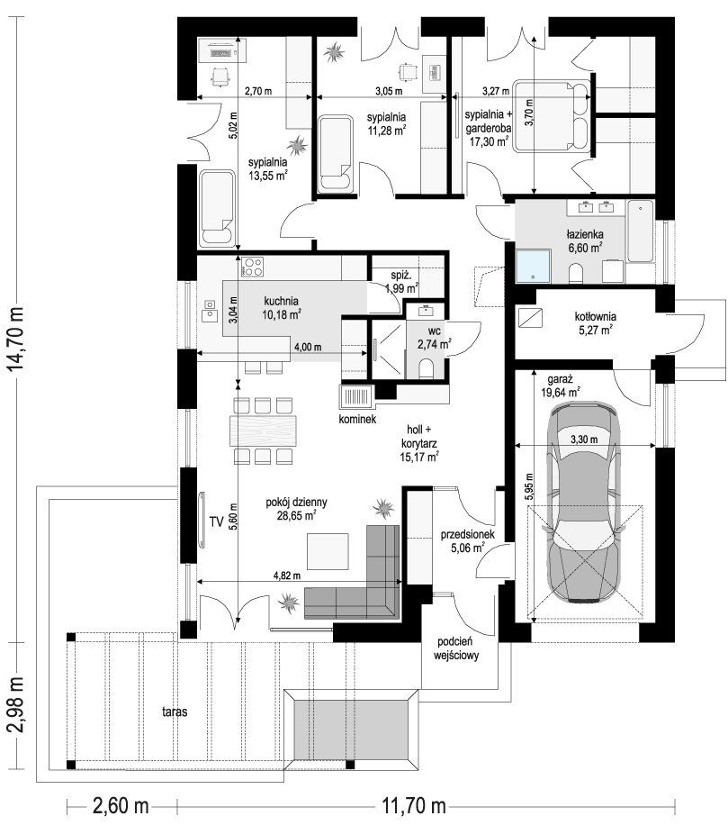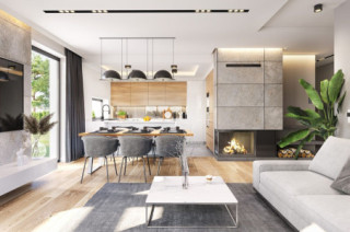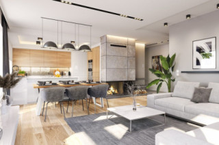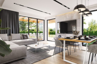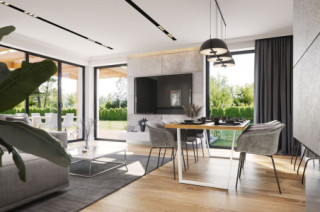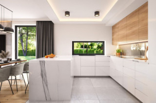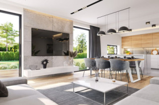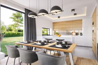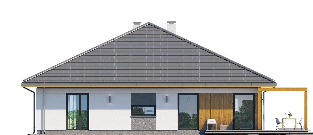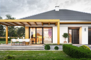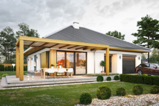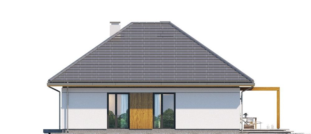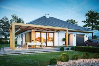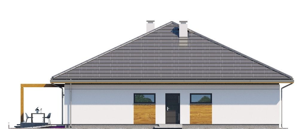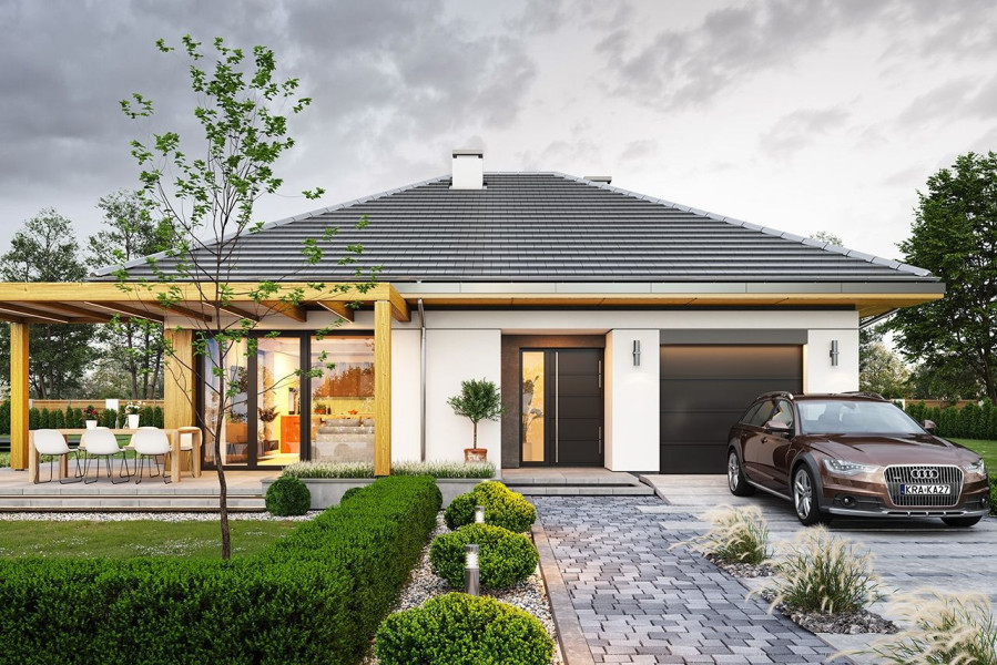 Projekt domu Dom na Słonecznej 2 jest wersją wariantową projektu „Dom na Słonecznej”, o bardziej konserwatywnej architekturze, z dachem przykrytym dachówką ceramiczną i z antracytowymi ramami stolarki okiennej. Budynek zaprojektowano jako parterowy, z przeznaczeniem dla 4-osobowej rodziny. Bryła domu została zaprojektowana na planie prostokąta, przykryta czterospadowym symetrycznym dachem, krytym dachówką. Dom będzie doskonale pasował na działkę z niekorzystnym ustawieniem względem stron świata i nasłonecznienia - z wjazdem od południa lub od wschodu. Dom zaprojektowano w taki sposób, aby ogród znajdował się z boku domu lub od frontu. Takich projektów jest zdecydowanie za mało - a przecież połowa dostępnych działek w Polsce ma wjazd od niekorzystnej strony, a to nie powód żeby siedzieć potem całe życie w ciemnym salonie źle dobranego projektu. Tutaj cześć dzienna jest bardzo dobrze doświetlona dużymi przeszkleniami w narożniku budynku. Architektura domu jest skromna, powściągliwa, a zarazem elegancka. Ładne duże okna i kontrastujące fragmenty ścian współgrają z bielą elewacji. Wejście do domu zaakcentowane zostało reprezentacyjnymi drzwiami z naświetlem bocznym, umieszczonymi we wnęce – podcieniu wejściowym. Do wnętrza wchodzimy wygodnym przedsionkiem, wprost do centralnego holu i do przestrzeni dziennej, na którą składa się część wypoczynkowa salonu, jadalnia i kuchnia z półwyspem-barkiem do szybkich posiłków. Część nocna domu dostępna z korytarza, składa się z sypialni master z garderobami, dwóch sypialni dziecięcych i wygodnej łazienki. Całość wnętrza zamyka część gospodarcza z garażem i kotłownią. Dom stosownie do swojej skali i powierzchni jest bardzo funkcjonalny i komfortowy. Dodatkowa przestrzeń jaką można dowolnie wykorzystać znajduje się na strychu nad parterem - można ją zagospodarować jako domowy magazyn-graciernię, albo przestrzeń użytkową - wedle pomysłu Inwestora. Dom na Słonecznej 2 ma prostą konstrukcję, jest łatwy i szybki w budowie. Budynek jest energooszczędny - ma bardzo dobre izolacje i zastosowane nowoczesne instalacje. Koszty utrzymania budynku będą niewygórowane. Dom na Słonecznej 2 to doskonała propozycja dla Inwestorów planujących budowę normalnego domu o prostej i ponadczasowej architekturze, o sensownej wielkości i skali, dzięki czemu właściciele będą mogli się cieszyć swoim domem nie będąc jego niewolnikami. Zapraszamy też do zapoznania się z projektem Dom na Słonecznej.