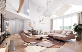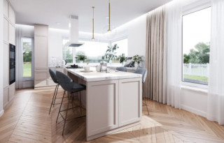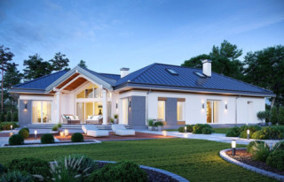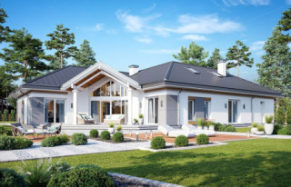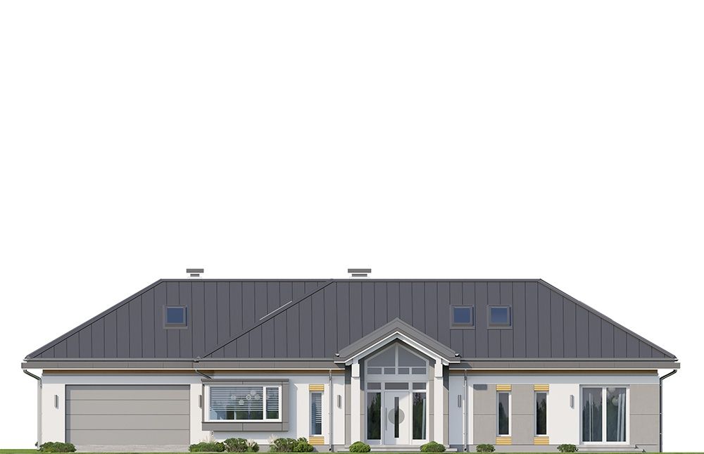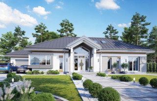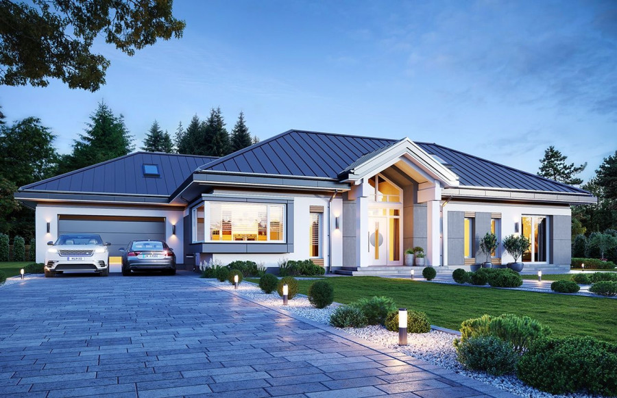 Projekt domu Willa Parkowa 6 modern B jest wersją wariantową popularnego projektu Willa Parkowa 6 – tym razem w nowoczesnej stylistyce, ze współczesną nie stylizowaną architekturą, w wersji „Modern B”. Dom zaprojektowano podobnie do pierwotnego projektu - zachowując wielkość bryły i układ przestrzenny. Zmiana polega tutaj na wprowadzeniu nowoczesnych detale i materiałów, zmieniających zupełnie stylistykę budynku. Willa Parkowa 6 – „Modern B” to komfortowa podmiejska willa, na rozłożystą działkę, z programem użytkowym przewidzianym na jednym poziomie parteru, z dodatkową przestrzenią strychowo-poddaszową na górnej kondygnacji.Budynek ma kształt litery „L” z dobudowaną częścią garażową i przykryty jest łagodnym wielospadowym dachem, krytym nowoczesną blachą na rąbek stojący w kolorze grafitowym. Front domu zdobi piękne reprezentacyjne wejście, z wysokimi drzwiami z bocznymi i górnymi naświetlami.Dodatkową ozdobą frontu jest duże narożne okno kuchni z wykuszem. Zróżnicowane kolorystycznie i materiałowo fragmenty elewacji i wysokie okna schodzące do ziemi dają poczucie dynamicznej i nowoczesnej architektury. Część garażowa domu została wycofana wgłab działki, tworząc frontowy placyk – dziedziniec, miejsce na parking dla dodatkowych aut. Od strony ogrodu najważniejszym elementem jest duża narożna przeszklona ściana szczytowa dwukondygnacyjnego salonu, łącząca się z tarasami urokliwym zadaszeniem podcienia. Szerokie okna salonu i sypialni pozwalają maksymalne połączyć wnętrze budynku z otaczającym ogrodem. Do domu wchodzimy przez wysoki reprezentacyjny przedsionek z podwyższonym sufitem, wprost do holu i pokoju dziennego. Salon podzielono na centralną część wypoczynkową – z kanapami naprzeciwko ściany telewizyjno – kominkowej, oraz część jadalnianą z wygodnym stołem dla ośmiu osób. Po przeciwnej stronie we frontowym narożniku budynku zaprojektowano obszerną kuchnię z miejscem do spożywania codziennych posiłków. Kuchnia połączona została funkcjonalnie z zapleczem technicznym domu - z pralnią, garażem i kotłownią. Dzięki temu przejście z zakupami z auta będzie krótsze i łatwiejsze. W dwóch narożnikach budynku zaprojektowano sypialnie dzieci z łazienką, oraz osobny apartament master z łazienką, garderobą i dodatkowym gabinetem. Parter domu mieści w sobie cały program użytkowy ze wszystkimi potrzebnymi pomieszczeniami, ale nad parterem znajduje się jeszcze pokaźna przestrzeń strychowa, którą można zagospodarować jako poddasze użytkowe, lub zamknąć je i wykorzystać jako domowy strych -magazyn. W projekcie zaproponowaliśmy oddzielenie przestrzeni strychowej od pustki salonu za pomocą dużych szyb wkomponowanych w ściany działowe, ale można tutaj dowolnie aranżować przestrzeń. Izolacje i nowoczesne instalacje powodują, że budynek jest energooszczędny. Zastosowane materiały i technologie sprawią, że ta nowoczesna mini-rezydencja będzie miała ponadczasowy styl i będzie się ładnie starzeć, nie tracąc swojej wartości. Willa Parkowa 6 – „Modern B” to doskonała propozycja dla Klientów, którym podoba się Willa Parkowa 6, ale nie do końca chcą stylowej architektury. W tym projekcie architektura jest jednocześnie nowoczesna i szykowna. Zapraszamy do obejrzenia wszystkich projektów domów z serii Willa Parkowa: https://www.mgprojekt.com.pl/willa-parkowa, https://www.mgprojekt.com.pl/willa-parkowa-2, https://www.mgprojekt.com.pl/willa-parkowa-3, https://www.mgprojekt.com.pl/willa-parkowa-4, https://www.mgprojekt.com.pl/willa-parkowa-5, https://www.mgprojekt.com.pl/willa-parkowa-6, https://www.mgprojekt.com.pl/willa-parkowa-6-d, https://www.mgprojekt.com.pl/willa-parkowa-7, https://www.mgprojekt.com.pl/willa-parkowa-8-a, https://www.mgprojekt.com.pl/willa-parkowa-8-b, https://www.mgprojekt.com.pl/willa-parkowa-9, https://www.mgprojekt.com.pl/willa-parkowa-10, https://www.mgprojekt.com.pl/willa-parkowa-b, https://www.mgprojekt.com.pl/willa-parkowa-c, https://www.mgprojekt.com.pl/willa-parkowa-d.