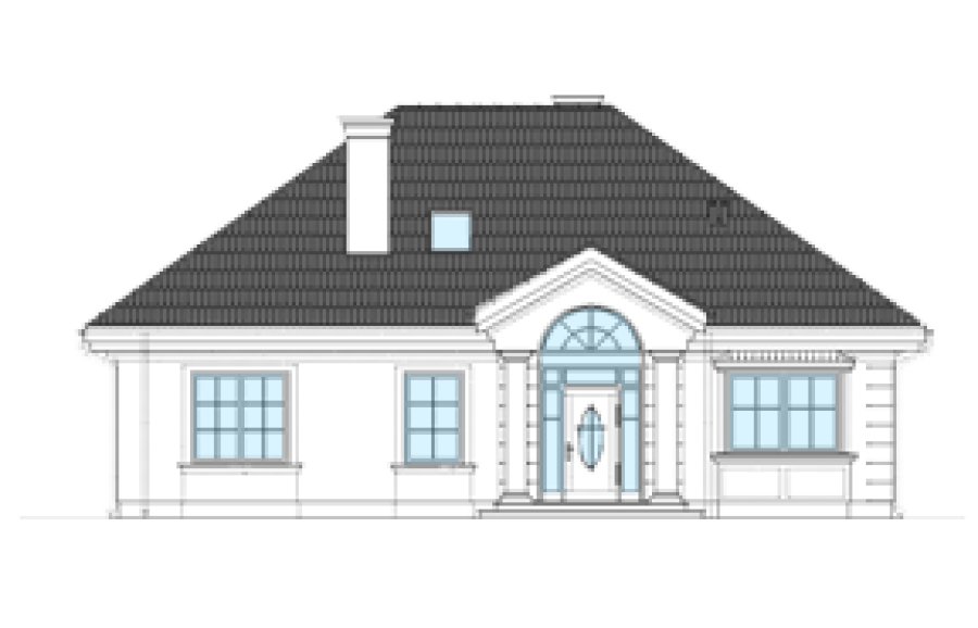 Wariant projektu z wprowadzonymi zmianami takimi jak - likwidacja garażu, parapet okna w jadalni obniżony do poziomu zera projektu, w związku z likwidacją garażu powiększenie sypialni i przeniesienie okna z elewacji bocznej na frontową.