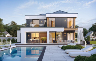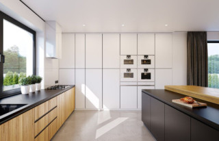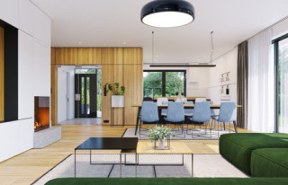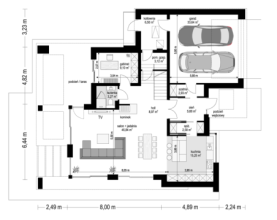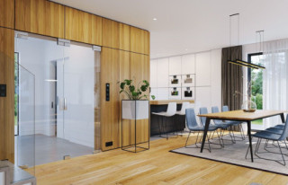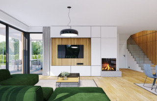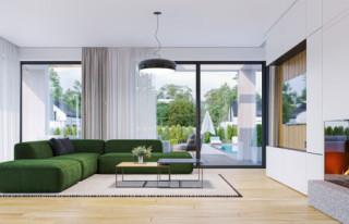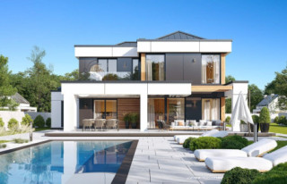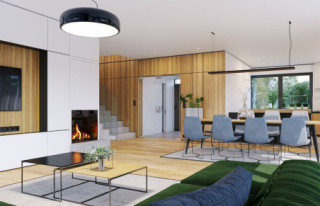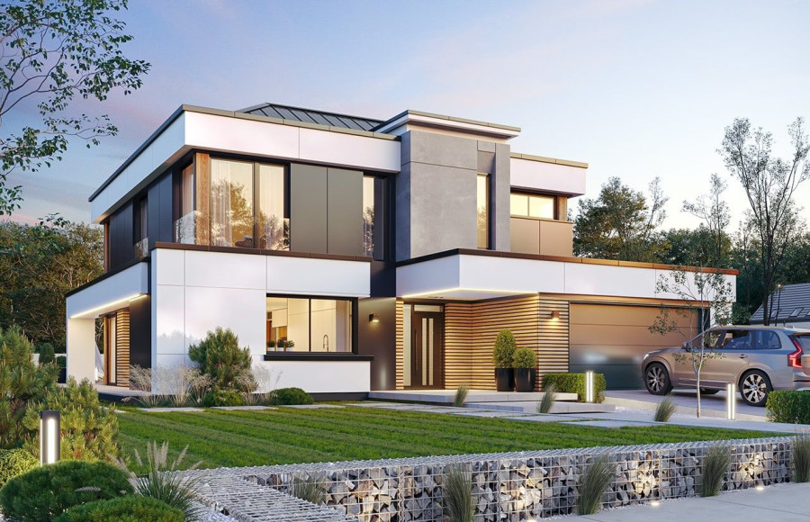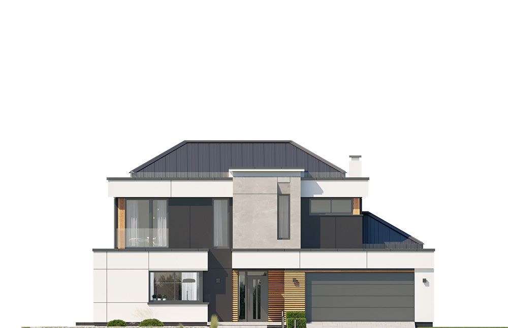 Projekt domu Willa Floryda 6 to kolejny wariant projektu domu jednorodzinnego z serii „Willa Floryda”, będący odpowiedzią na pytania wielu Inwestorów o wersję o mniejszej powierzchni użytkowej. Dom jest nowoczesną miejską willą, o jednopiętrowej bryle, przykrytą wielospadowym dachem z szerokim gzymsowaniem, z dobudowanymi parterowymi częściami garażu i zadaszeniem nad tarasem. Nowoczesną stylistykę budynku podkreślają poziome podziały elewacji w kontrastujących kolorach, duże okna z narożnymi przeszkleniami, belki wokół głównego rdzenia bryły i dominujący nad wejściem wykusz piętra. Architektura domu jest nietuzinkowa, nowoczesna i bardzo efektowna. Willa mimo nieprzesadzonej wielkości prezentuje się jak prawdziwa mini-rezydencja. Budynek na pewno zrobi wrażenie i długo będzie się wyróżniał swoim stylem wśród sąsiedniej zabudowy. Do wnętrza wchodzimy przez ładny podcień i podest wprost do obszernego przedsionka z szatnią, a następnie do części dziennej połączonego salonu, holu i jadalni. Częściowo oddzielona kuchnia z pięknym narożnym oknem z widokiem na front dopełnia wnętrze dzienne. Przeszklenia salonu pozwalają na usytuowanie budynku na działce zarówno z ogrodem z tyłu jak i z boku domu. Z salonu wychodzimy na duży taras, częściowo zadaszony podcieniem i pergolą. Na parterze mamy do dyspozycji jeszcze dodatkowy pokój – gabinet, oraz cześć gospodarczą z kotłownią i garażem. Na piętro dostajemy się wygodnymi schodami i mamy tam przewidziane dwie sypialnie dziecięce, z dużą łazienką i pralnią, oraz apartament rodziców z własną łazienką i garderobą. Pomieszczenia można dowolnie kształtować i zmieniać ustawienie ścianek działowych, dzięki zastosowaniu monolitycznych stropów żelbetowych. Willa Floryda 6 jest wygodnym komfortowym domem dla 4-5 osobowej rodziny. W budynku zastosowano nowoczesne materiały i rozwiązania technologiczne. Dzięki energooszczędnym instalacjom i dobrym izolacjom budynek będzie niedrogi w utrzymaniu i eksploatacji. Konstrukcja domu nie jest wbrew pozorom bardzo skomplikowana (główną trudnością są tutaj dwa stropy żelbetowe). Willa Floryda 6 to propozycja dla osób preferujących nowoczesną architekturę, poszukujących oryginalnego projektu, jednocześnie domu o nieprzesadzonej skali i powierzchni. Istnieje możliwość dostosowania projektu do standardu NF40. Zapraszamy! Zapraszamy do zapoznania się z pełną ofertą pracowni: projekt domu Willa Floryda, projekt domu Willa Floryda 2, projekt Willa Floryda 3, projekt domu Willa Floryda 4, projekt domu Willa Floryda 5, projekt Rezydencja Floryda, projekt Rezydencja Floryda 2, projekt domu Willa Floryda 7, projekt domu Willa Floryda 8.