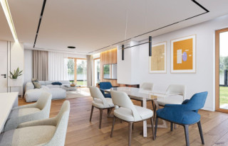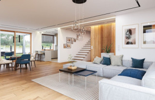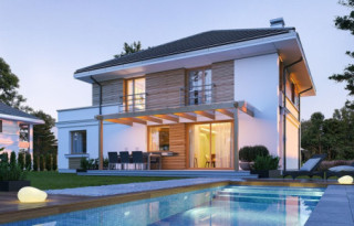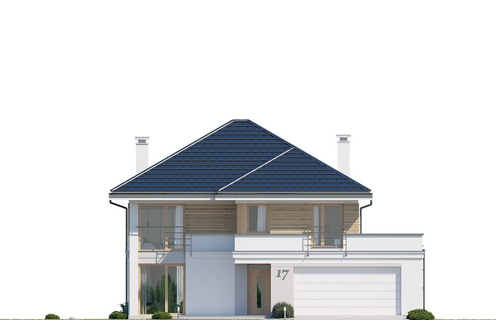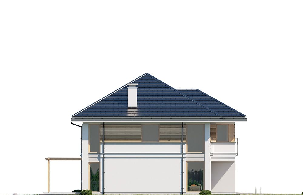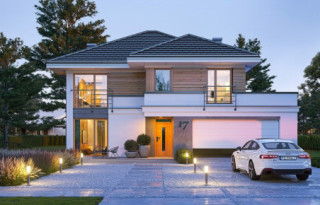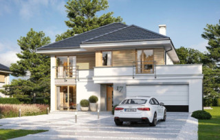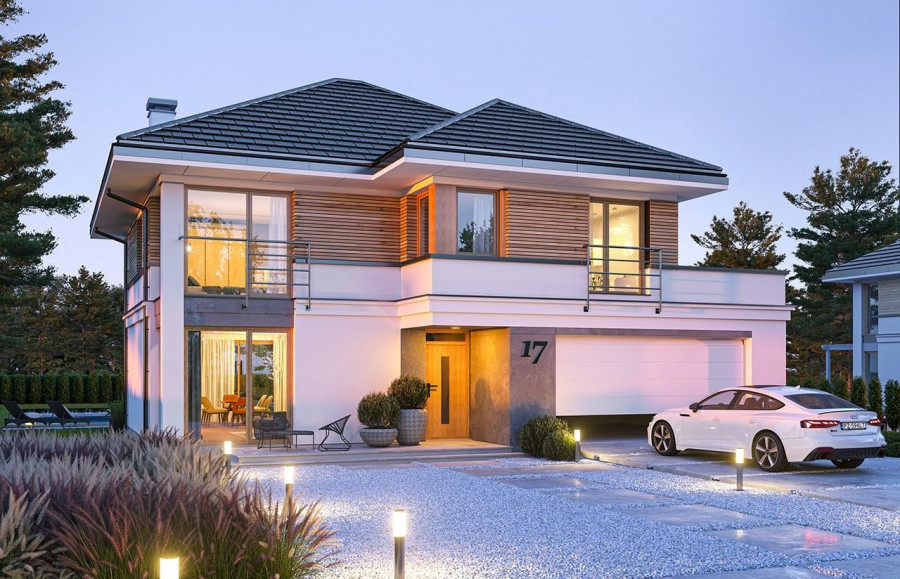 Projekt domu Tytan 5 jest kolejną wersję projektu z popularnej serii „Tytanów”. Jest to projekt domu jednorodzinnego dla rodziny 4- 6-osobowej, piętrowego, o zwartej prostokątnej bryle, przykrytej czterospadowym dachem o kącie nachylenia 30 stopni. Architektura domu utrzymana jest w stylistyce łączącej nowoczesność z tradycją, połączonej z solidnymi materiałami i detalami wykończeniowymi. Duże przeszklenia okien, narożne okna, oraz podział elewacji na poziome pasy dodają sylwetce dynamiki. Drewniana stolarka i fragmenty ścian wykończone drewnem wprowadzają ciepło i wrażenie przytulności. Konsekwentna kompozycja dodatków i kontrastujących ze sobą okładzin dają domowi elegancję i reprezentacyjny wygląd. Budynek ma zwartą bryłę o niewielkiej szerokości i powierzchni zabudowy, dzięki czemu zmieści się na niedużej wąskiej parceli. Dodatkowo usytuowanie części dziennej salonu na całej długości boku parteru z doświetleniem zarówno od strony ogrodu, jak i od frontu, pozwala na usytuowanie budynku zarówno na działce z wjazdem od północy, jak i na działce o niekorzystnej orientacji względem słońca - na przykład z wjazdem od południa. Wnętrze zaprojektowano przeznaczając parter na przestrzeń dzienną i gospodarczo-techniczną, a piętro na sypialnie domowników. Do wnętrza wchodzimy przez przedsionek z szafą, do przestrzeni dziennej połączonych pomieszczeń holu, salonu i jadalni. Między narożnymi przeszkleniami pokoju dziennego mamy do dyspozycji długą ścianę telewizyjną z kominkiem. Od strony ogrodu zlokalizowano półotwartą kuchnię ze spiżarką. Głębiej za schodami znajduje się przejście do wc z prysznicem i do dodatkowego pokoju – na przykład gabinetu. Z przedsionka przedostajemy się do wygodnego dwustanowiskowego garażu i kotłowni. Na piętrze zaprojektowano trzy pokoje dziecięce i łazienkę, oraz oddzielny apartament rodziców z własną łazienką i bardzo dużą garderobą. Dom, choć nie jest duży, ma bardzo funkcjonalne wnętrze, i aż 6 pokoi. Konstrukcja budynku jest prosta. Zastosowano w nim nowoczesna energooszczędne materiały, oraz wydajne instalacje, które pomogą utrzymać koszty eksploatacji budynku na niskim poziomie. Tytan 5 jest doskonałą propozycję dla Inwestorów poszukujących projektu średniej wielkości piętrowego domu, o zwartej bryle - ładnego i praktycznego W łatwy sposób można go przystosować do standardu NF40. Zapraszamy do zapoznania się z pełną ofertą pracowni MG Projekt: projekt domu Tytan, projekt domu Tytan 2, projekt domu Tytan 2B, projekt domu Tytan 3, projekt domu Tytan 4, projekt domu Tytan 5B, projekt domu Tytan 6, projekt domu Tytan 6B. Projekty są również dostępne w odbiciu lustrzanym.