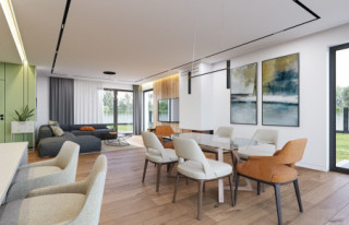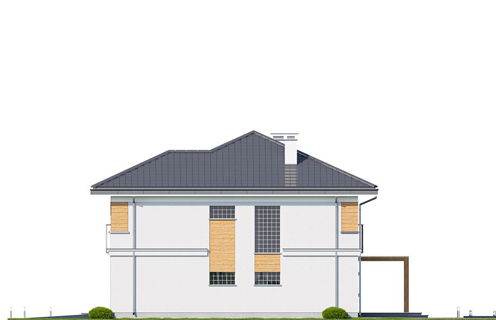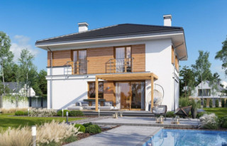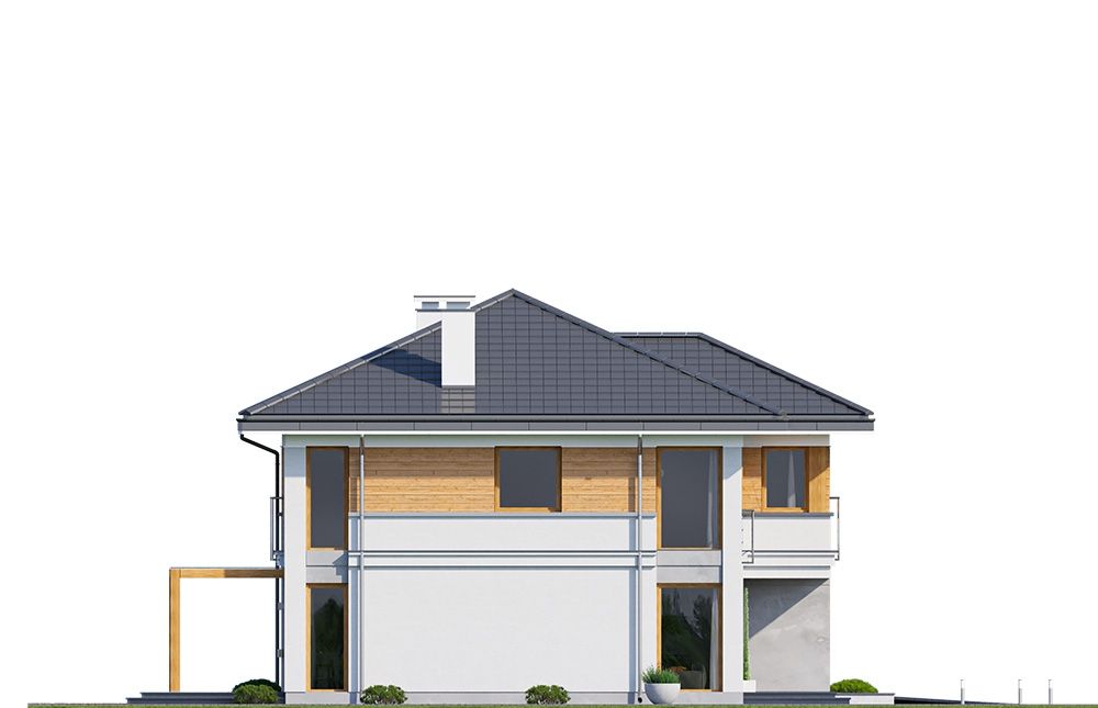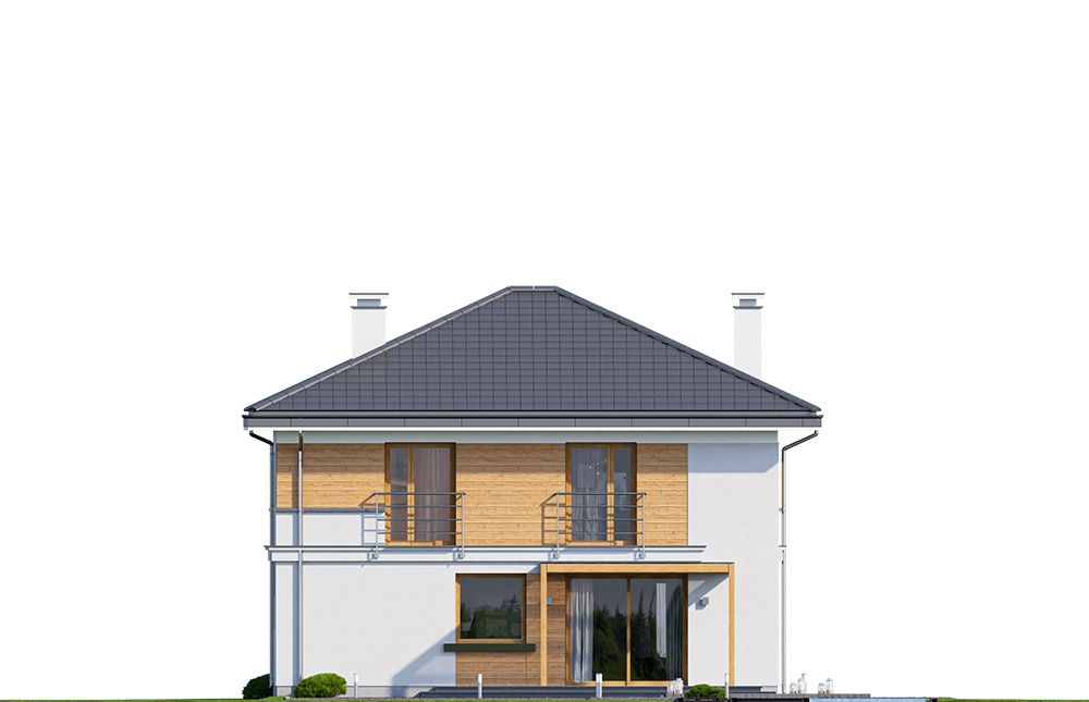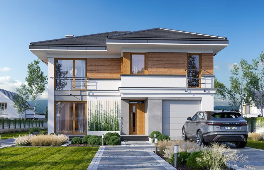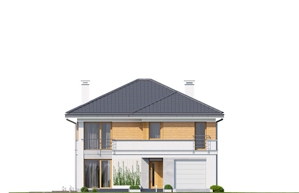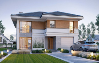 Projekt domu Tytan 5 B jest nową wersją wariantową z popularnej serii domów o tej nazwie. Tytan 5B zaprojektowano jako jednopiętrowy dom dla 4- 5-osobowej rodziny. Zbudowany został na kwadratowym rzucie, przykryty czterospadowym dachem o kącie 25 stopni. W bryle znajduje się wbudowany jednostanowiskowy garaż. Domek ma bardzo przyjemną przytulną stylistykę. Prosta forma budynku, ozdobiona została dużymi przeszkleniami i imitującymi drewno łatwymi w utrzymaniu okładzinami. Forma domu łączy w sobie nowoczesność, z elementami tradycji, podkreślając wrażenie solidności i reprezentacyjny wygląd. Dom utrzymano jest w radosnej kolorystyce. Okna z ramami w kolorze drewna, drewnopodobne okładziny ścian, szare kontrastujące fragmenty elewacji i grafitowa nowoczesna dachówka - wszystko daje efekt czystej, dobrze skomponowanej architektury. Wnętrze domu podzielono na część dzienną na parterze, oraz pokoje sypialne na piętrze. Parter to głównie jednoprzestrzenne wnętrze salonu, jadalni i holu, z półotwartą kuchnią, oraz pomieszczenia techniczne - garaż i kotłownia. Górna kondygnacja to cztery pokoje sypialne i dwie łazienki, w tym oddzielona od reszty wnętrza sypialnia rodziców z własną łazienką i bardzo pojemną garderobą. Konstrukcyjne Tytan 5B jest bardzo prosty i będzie łatwy z budowie. W projekcie zastosowano nowoczesne energooszczędne materiały i instalacje, które utrzymają koszty użytkowania domu na niskim poziomie. Tytan 5B to bardzo dobra propozycja dla Inwestorów planujących budowę niewielkiego praktycznego piętrowego domu jednorodzinnego, o estetycznym wyglądzie. W łatwy sposób można go przystosować do standardu NF40. Zapraszamy do zapoznania się z pełną ofertą pracowni MG Projekt: projekt domu Tytan, projekt domu Tytan 2, projekt domu Tytan 2B, projekt domu Tytan 3, projekt domu Tytan 4, projekt domu Tytan 5, projekt domu Tytan 6, projekt domu Tytan 6B. Projekty są również dostępne w odbiciu lustrzanym.