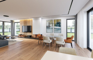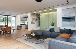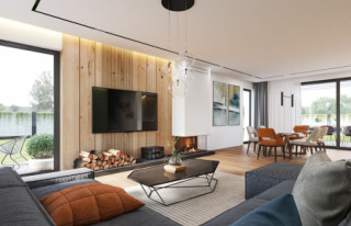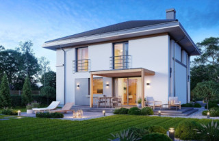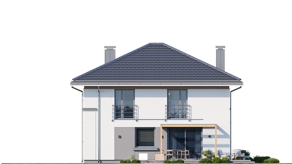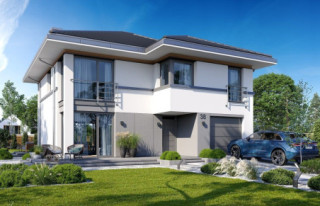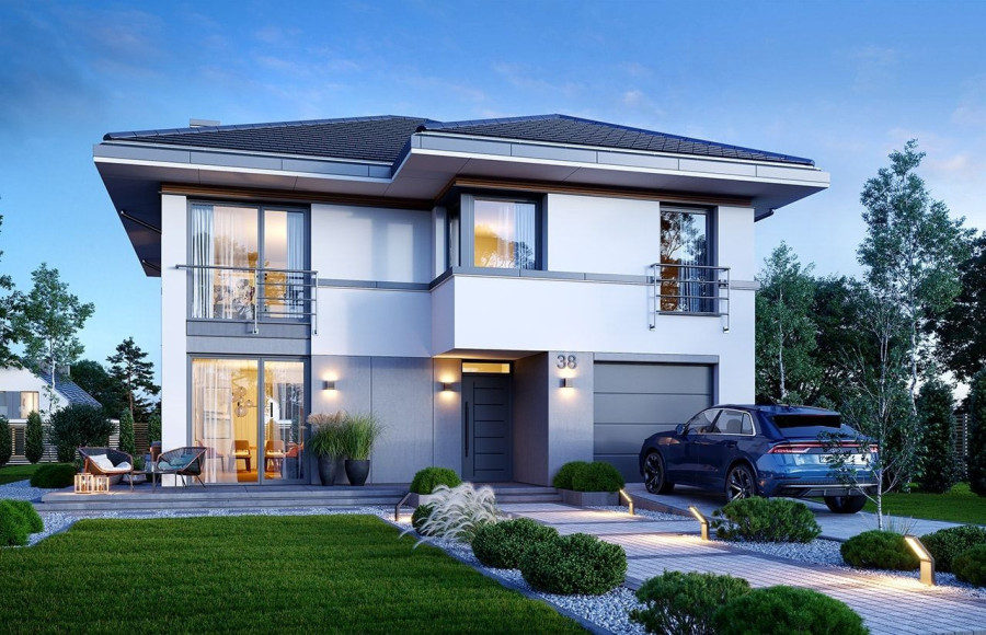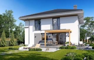 Projekt domu Tytan 6 B jest nową wersją wariantową z popularnej serii domów o tej nazwie. Jest to piętrowy dom dla 4- 5-osobowej rodziny, zbudowany na planie kwadratu, przykryty czterospadowym dachem o kącie 25 stopni, z wbudowanym w bryłę jednostanowiskowym garażem. Architektura domu jest nowoczesna i oszczędna w wyrazie. Fragmenty elewacji w kontrastujących kolorach, duże przeszklenia okien, poziome podziały elewacji, kolorystyka utrzymana w bieli, odcieniach szarości i graficie, dają w połączeniu efekt reprezentacyjnej dynamicznej nowoczesnej miejskiej mini-willi. Front domu zdobią duże narożne przeszklenia i drzwi wejściowe w wyciętym narożniku, będącym zadaszeniem podestu wejściowego. Elewację ogrodową zdobi duże przedszkolne otwarcie z salonu na taras i zadaszenie w formie pergoli, która może być zamknięta szklanym daszkiem. Tytan 6B ma zwartą bryłę, o niewielkiej szerokości i niedużej powierzani zabudowy. Zmieści się nawet na małej i wąskiej działce. Salon z jadalnią zaprojektowano z oknami wychodzącymi na trzy strony, dzięki czemu wnętrze jest doskonale doświetlone, a dom bardzo dobrze wpisze się w działkę nawet z wjazdem od południa. Wnętrze domu podzielono na przestrzeń dzienną na dole i pokoje sypialnie na piętrze. Na parterze mamy niemal pięćdziesięciometrową przestrzeń salonu i holu, połączoną z półotwartą kuchnią ze spiżarnią, oraz część techniczną - garażu i kotłowni. Na piętrze mieszczą się cztery pokoje i dwie łazienki, w tym oddzielny apartament rodziców z własną łazienką i dużą wygodną garderobą. Konstrukcja Tytana 6B jest bardzo prosta i łatwa w budowie. W budynku zastosowano nowoczesne energooszczędne materiały i instalacje, które utrzymają koszty użytkowania domu na niskim poziomie. Tytan 6B to bardzo dobra propozycja dla Inwestorów planujących budowę niewielkiego praktycznego piętrowego domu jednorodzinnego, o nowoczesnej stylistyce i rozsądnej skali. W łatwy sposób można go przystosować do standardu NF40. Zapraszamy do zapoznania się z pełną ofertą pracowni MG Projekt: projekt domu Tytan, projekt domu Tytan 2, projekt domu Tytan 2B, projekt domu Tytan 3, projekt domu Tytan 4, projekt domu Tytan 5, projekt domu Tytan 5B, projekt domu Tytan 6. Projekty są również dostępne w odbiciu lustrzanym.