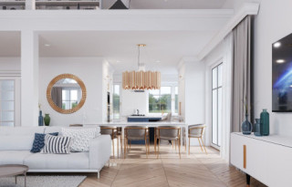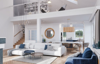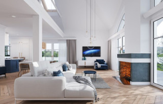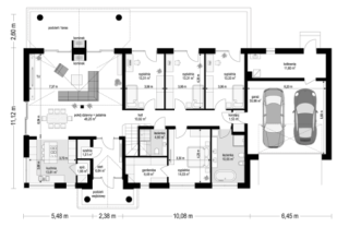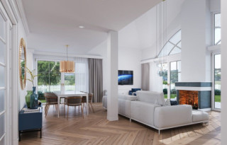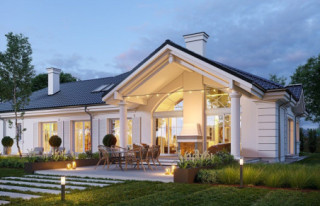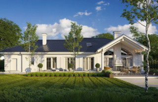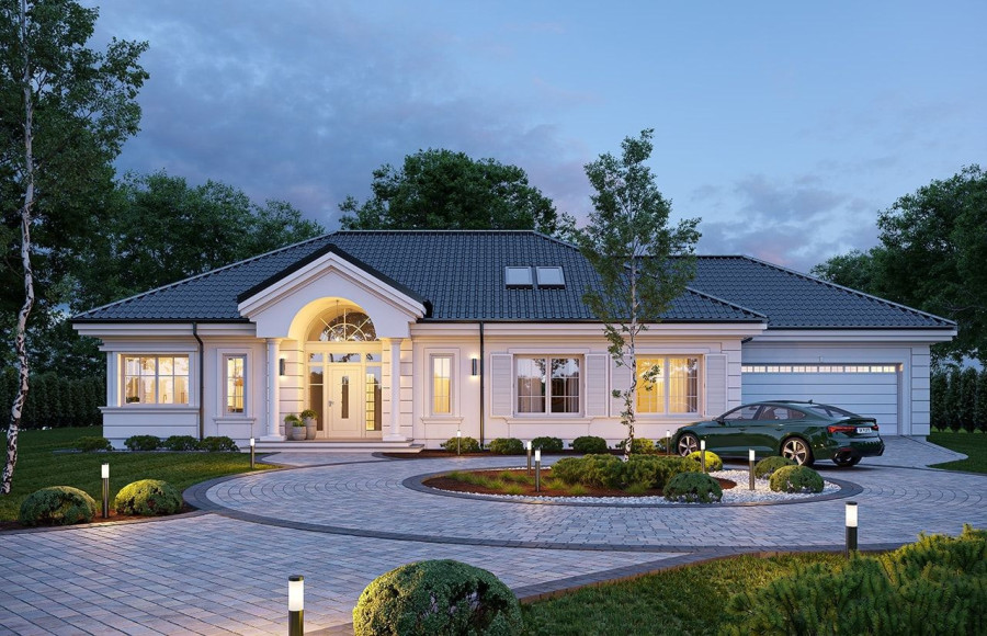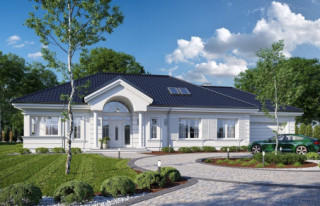 Projekt domu Willa Parkowa 8 B jest kolejną propozycją domu jednorodzinnego z popularnej serii „Willi Parkowych”. Dom został zaprojektowany jako parterowy, z przestrzenią poddasza / strychu do dowolnego wykorzystania i aranżacji. Budynek przykryto wielospadowym dachem i zaprojektowano na planie prostokąta, z dobudowaną z boku częścią garażowo -techniczną. Cały program użytkowy domu zmieszczono na parterze, aby zapewnić mieszkańcom wygodę życia na jednym poziomie, bez konieczności ciągłego chodzenia po schodach. Styl Willi Parkowej to architektura dworkowo – rezydencyjna w nowoczesnym ujęciu - dworek XXI wieku. Front domu ozdobiono jest pięknym portykiem wejściowym z szerokimi drzwiami frontowymi z naświetlami i łukowym świetlikiem doświetlającym podniesiony westybul. Od strony ogrodu urody dodaje zadaszenie tarasu z dużym przeszkleniem z salonu, z łukowymi oknami i kominkiem dwustronnym. Dom jest reprezentacyjny, elegancki, a za razem utrzymuje ludzką skalę i powściągliwość. Uroku całej sylwetce domu dodają duże okna z delikatnymi podziałami i pięknymi okiennicami, gzymsy, boniowania i sztukateria. A całość zamyka od góry łagodny proporcjonalny dach. Wnętrze domu podzielono wyraźnie na cześć dzienną - z salonem, część nocną - z pokojami sypialnymi i cześć techniczną - z garażem i kotłownią. Do domu wchodzimy reprezentacyjnym wejściem przez podwyższony przedsionek z sufitem łukowym, do pokoju dziennego łączącego funkcję holu, salonu i jadalni. Od frontu część dzienną zamyka dodatkowo kuchnia z wyspą, spiżarnią i narożnym oknem. Salon zaprojektowano z otwarciem przestrzennym – pustką, łącząc przestrzennie parter z antresolą na poddaszu - będącą przedłużeniem pokoju dziennego. W części sypialnej mamy trzy sypialnie dziecięce z łazienką, oraz sypialnię master z własną łazienką i garderobą. Dalej zaprojektowano dostępną z korytarza przez śluzę podwójnych drzwi część gospodarczą, z pomieszczeniami kotłowni i dwustanowiskowym garażem. Na poddaszu mamy do dyspozycji przestrzeń do indywidualnej aranżacji, w której można uzyskać dwa lub trzy dodatkowe pokoje. W projekcie zastosowano nowoczesne instalacje i bardzo dobre ocieplenia, dzięki czemu budynek jest energooszczędny i będzie niedrogi w późniejszej eksploatacji. Willa Parkowa 8 B to jedna z mniejszych wersji projektów z tej serii. Dom idealny dla osób marzących o pięknym romantycznym prawdziwym domu, osadzonym swoją formą w tradycji, ale będącym też zupełnie współczesną komfortową willą. Zapraszamy ! Zapraszamy do obejrzenia wszystkich projektów domów z serii Willa Parkowa: https://www.mgprojekt.com.pl/willa-parkowa, https://www.mgprojekt.com.pl/willa-parkowa-2, https://www.mgprojekt.com.pl/willa-parkowa-3, https://www.mgprojekt.com.pl/willa-parkowa-4, https://www.mgprojekt.com.pl/willa-parkowa-5, https://www.mgprojekt.com.pl/willa-parkowa-6, https://www.mgprojekt.com.pl/willa-parkowa-6-d, https://www.mgprojekt.com.pl/willa-parkowa-7, https://www.mgprojekt.com.pl/willa-parkowa-8-a, https://www.mgprojekt.com.pl/willa-parkowa-8-b, https://www.mgprojekt.com.pl/willa-parkowa-9, https://www.mgprojekt.com.pl/willa-parkowa-10, https://www.mgprojekt.com.pl/willa-parkowa-b, https://www.mgprojekt.com.pl/willa-parkowa-c, https://www.mgprojekt.com.pl/willa-parkowa-d. Projekty są również dostępne w odbiciu lustrzanym.