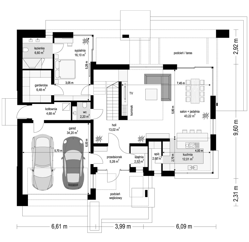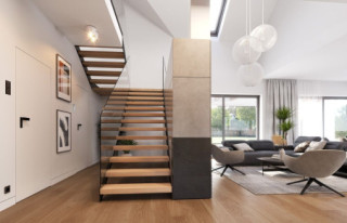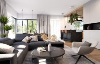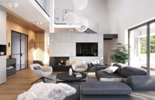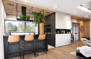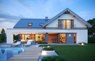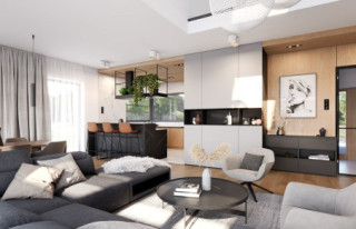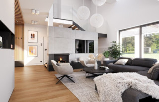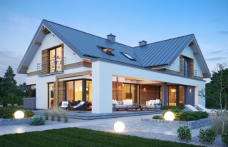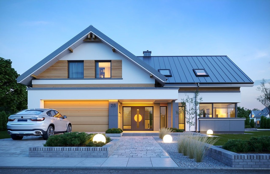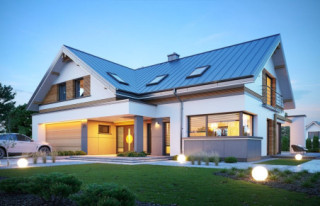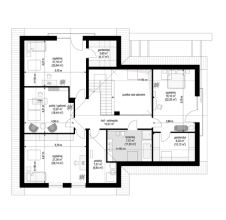 Projekt domu Hiacynt 8 to kolejny wariant projektu z popularnej serii „Hiacyntów”. Jest to parterowy dom z poddaszem użytkowym, zbudowany na planie litery T, z układem dwóch przecinających się dachów dwuspadowych. Zarówno od frontowej elewacji, jak i od strony ogrodowej poddasze posiada ściany szczytowe, dzięki czemu aż trzy szczyty domu zapewniają na poddaszu okna w ścianach zamiast okien tylko połaciowych w skosach dachów. Architektura domu łączy w sobie tradycyjną formę z nowoczesnymi rozwiązaniami,detalami i materiałami wykończeniowymi. Elewacje budynku urozmaicono podziałami kontrastujących powierzchni wykończonych różnymi materiałami. Do domu wchodzimy przez reprezentacyjne drzwi z naświetlami bocznymi, ukryte w podcieniu wejściowym pod podciągami i płytą nad podestem wejściowym i garażem. Dodatkowymi elementami zasługującymi na uwagę jest piękne narożne okno kuchni, oraz ciekawie obudowane okna ściany szczytowej poddasza. Od strony ogrodu uwagę przyciąga szeroka na niemal całą elewację belka podpierająca zadaszenie tarasu i pergolę nad tarasowym patio. Ciekawa i urozmaicona bryła budynku, nowoczesne materiały i kolorystyka, dają w sumie atrakcyjny wygląd domu i niepowtarzalny styl. Wnętrze domu - zarówno parteru jak i poddasza, podzielono na oddzielone strefy o różnej funkcji. Na parterze w centrum domu znajduje się część dzienna, z jednoprzestrzennym wnętrzem salonu z antresolą, jadalnią połączoną z tarasem, oraz obszerną kuchnią ze spiżarnią. Na lewo od schodów przechodzimy do oddzielnego apartamentu rodziców, z własną łazienką i garderobą, połączonego z tarasem i ogrodem. Parter zamyka część techniczna budynku z garażem i kotłownią. Na poddaszu dzięki trzem szczytom i zredukowanej ilości skosów dachów w stosunku do takiej samej powierzchni podłogi, mamy aż cztery pokoje ( w tym dwa z własnymi garderobami ), dużą łazienkę i pomieszczenie pralni. To bardzo duże poddasze udało się uzyskać w identycznym obrysie zewnętrznych ścian jak w wersjach Hiacynta 7, lub 7B. W projekcie zastosowano bardzo dobre izolacje i nowoczesne instalacje, dzięki czemu budynek jest energooszczędny i będzie niedrogi w późniejszej eksploatacji. Hiacynt 8 to idealna propozycja dla osób, którym spodobały się domy z tej serii, ale chcieli uzyskać możliwie największe poddasze, z normalnymi oknami w ścianach i ze zmniejszoną ilością skosów od połaci dachów poddasza. To propozycja dla Inwestorów chcących wybudować spory ale niewielki dom jednorodzinny, o atrakcyjnej nowoczesnej architekturze i funkcjonalnym wnętrzu. Zapraszamy do zapoznania się z innymi projektami: projekt domu Hiacynt, projekt domu Hiacynt 2, projekt domu Hiacynt 3, projekt domu Hiacynt 4, projekt domu Hiacynt 5, projekt domu Hiacynt 6, projekt domu Hiacynt 7, projekt domu Hiacynt 7 B. Projekty dostępne są w odbiciu lustrzanym.