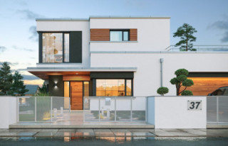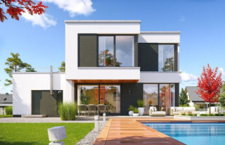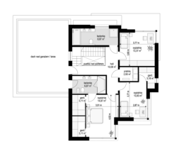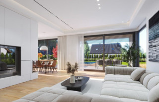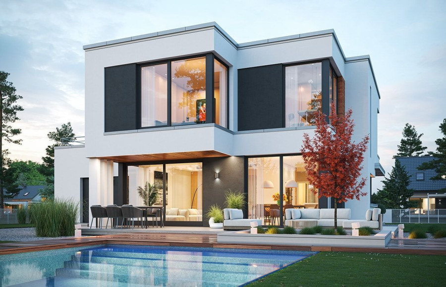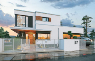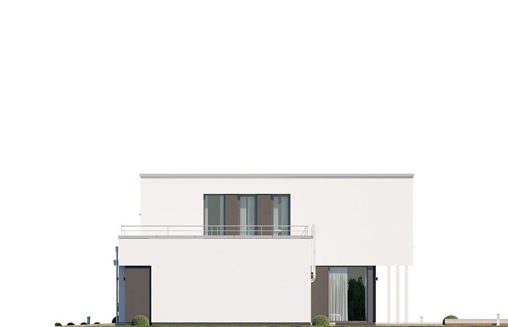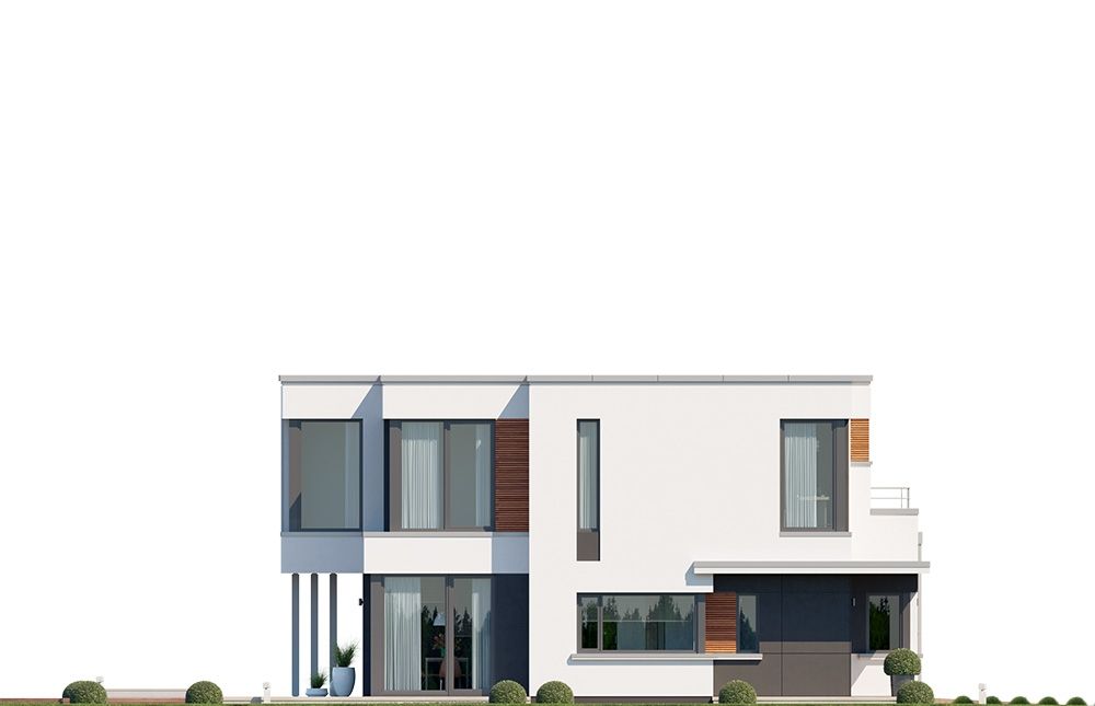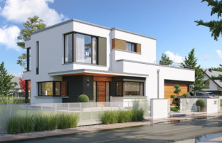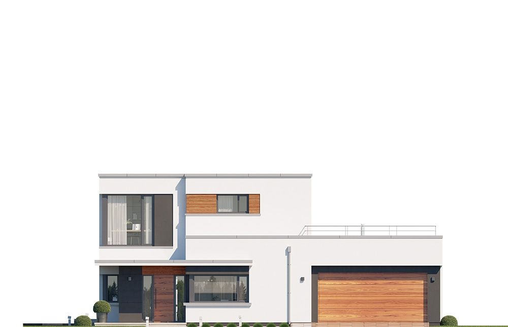 Projekt domu Qubik jest to projekt nowoczesnego domu jednorodzinnego piętrowego, z płaskim dachem - z serii „Qubik”, przeznaczony dla 4- 5-osobowej rodziny. Dom zaprojektowano w prostopadłościennej bryle złożonej z kilku przenikających się ze sobą bloków, tworzących interesującą harmonijną sylwetkę - z zaakcentowanym wejściem w narożniku elewacji frontowej, oraz z zawieszonym nad tarasem fragmentem piętra, tworzącym podcień. Dom otwarto maksymalnie dużymi przeszkleniami na stronę ogrodu, łącząc salon i sypialnie z otoczeniem. Od frontu zaprojektowane zostały trzy narożne okna - kuchni i gabinetu, oraz jednej z sypialni na piętrze, a narożnik ścian wejścia wykonano w kontrastującym kolorze akcentując reprezentacyjne drzwi do domu. Do jednopiętrowej bryły części mieszkalnej dołączona została parterowa część garażowa, z tarasem na dachu garażu, dostępnym z holu piętra. Zastosowane w elewacjach kształty, kolory i materiały dają estetyczny, czysty, bezkompromisowy wygląd - minimalistyczną nowoczesną architekturę. Wnętrze domu ma równie nowoczesny wyraz i charakteryzuje się prostymi podziałami pomieszczeń i wzajemnie przenikającymi się przestrzeniami. Parter domu to przede wszystkim salon otwarty szeroko na taras i ogród, połączony z wysokim holem z pięknymi schodami, z aneksem jadalnym i oddzieloną częściowo kuchnią. Centralnym elementem wnętrza jest tu ściana telewizyjno-kominkowa z trzystronnym kominkiem. Na parterze znajdziemy także dodatkowy pokój - gabinet, oraz garaż z kotłownią. Na piętrze zaprojektowane zostały dwie sypialnie dziecięce z garderobami i dużą łazienką, oraz oddzielny apartament rodziców z własną łazienką i garderobami. Całość spięta jest holem z pustką nad parterem i przejściem na taras na dachu garażu. Qubik to dom o nowoczesnej minimalistycznej architekturze, z zastosowanymi dopracowanymi detalami i energooszczędnymi instalacjami. Budynek ma bardzo korzystny stosunek powierzchni podłóg do kubatury, oraz zwartą bryłę, przez co będzie niedrogi w ogrzewaniu i eksploatacji. Konstrukcja domu jest prosta. Największym wyzwaniem dla Inwestora będzie tutaj dość kosztowna stolarka okienna. Qubik to doskonała propozycja dla osób planujących budowę domu piętrowego z płaskim dachem, posiadających niewielką działkę, którzy chcą zrealizować swoje marzenie o własnym domu trochę inaczej niż inni. Zapraszamy do obejrzenia wszystkich projektów domów z serii Qubik: projekt domu Qubik, projekt domu Qubik 2, projekt domu Qubik 3, projekt domu Qubik 3 wariant B, projekt domu Qubik 4. !