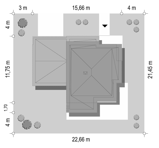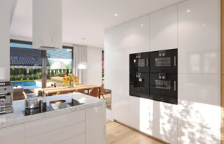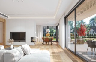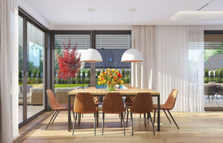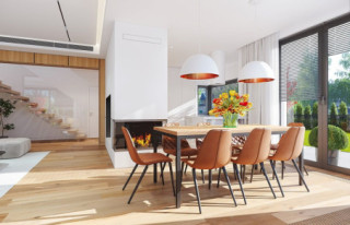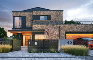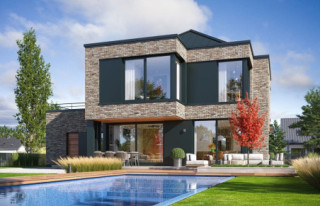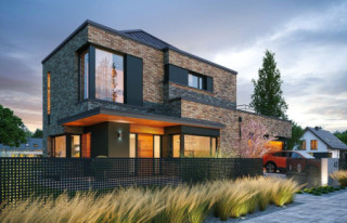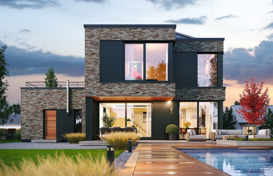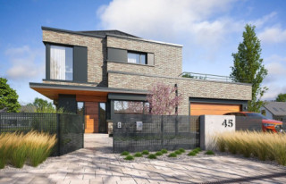 Projekt domu Qubik 2 jest to projekt domu jednorodzinnego o piętrowej prostopadłościennej bryle, przykrytej czterospadowym dachem z gzymsami. Dom przeznaczony jest dla 4- 5-osobowej rodziny - posiada trzy sypialnie z garderobami i łazienkami, oraz salon i dodatkowy pokój na parterze. Do piętrowej bryły części mieszkalnej dobudowany jest dwustanowiskowy parterowy garaż z tarasem na dachu dostępnym z piętra. Qubik 2 ma nowoczesną architekturę. Bryła budynku to połączenie kilku przenikających się mniejszych brył. Elewacje domu zdobią duże przeszklenia pokoi i dodająca elegancji i wyjątkowości okładzina klinkierowa ścian, komponująca się z kontrastującymi kolorami ram okiennych i obróbek blacharskich. Wejście do domu to szerokie drzwi z naświetlami, we wciętym narożniku bryły, podkreślone dodatkowym zadaszeniem. Od strony ogrodu na pierwszy plan wychodzi nadwieszony nad podcieniem tarasu fragment piętra budynku. Bryła budynku jest kompromisem między chęcią posiadania przez Inwestora modernistycznego domu z płaskim dachem a dostosowaniem się do często spotykanych przepisów w naszym kraju, nakazujących budowę domu z dachem spadzistym (dach nad garażem jest tarasem). Dzięki takiej bryle można połączyć pragnienie z wymaganiami urzędowymi. Wnętrze domu to głównie otwarta przestrzeń salonu, aneksu jadalnego i holu. Częściowo zasłonięta kuchnia kryje się za centralną ścianą telewizyjno- kominkową pokoju dziennego. W holu mamy piękne schody oraz otwarcie przestrzenne sufitu na piętro. Na parterze znajduje się dodatkowo pokój -gabinet, oraz część techniczna z garażem i kotłownią. Piętro domu to dwie ładne sypialnie dziecięce z garderobami, łazienką i pralnią, oraz oddzielony apartament rodziców z własną łazienką i garderobami. Bryła budynku jest prosta, łatwa w budowie. Dom został zaprojektowany jako energooszczędny, z nowoczesnymi instalacjami i materiałami wykończeniowymi. Qubik 2 stanowi doskonałą propozycję dla Inwestorów szukających nietuzinkowej nowoczesnej architektury = domu praktycznego i rzucającego się w oczy. Zapraszamy do obejrzenia wszystkich projektów domów z serii Qubik: projekt domu Qubik, projekt domu Qubik 2, projekt domu Qubik 3, projekt domu Qubik 3 wariant B, projekt domu Qubik 4.