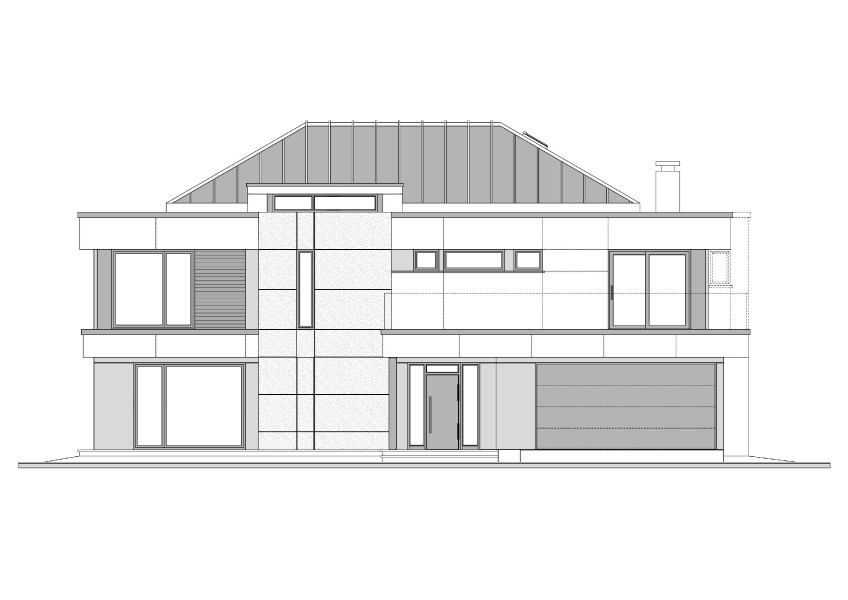 Zmiany: przesunięcie garażu do przodu budynku. Wydłużenie budynku w stronę ogrodu. W powstałą przestrzeń dodatkowa przestrzeń, pokoje gościnne z osobną łazienką. Przestrzeń wspólna powiększona, schodkowe okno elewacyjne wyprostowane - elewacja ogrodowa równa. Zlikwidowana szatnia ale większa garderoba na parterze. Kuchnia zamknięta drzwiami przesuwnymi. Likwidacja kominka tradycyjnego na rzecz kominka elektrycznego. Znaczne powiększenie pustki nad salonem. Zastąpienie słupów stalowych, słupami żelbetowymi. Na piętrze zmiany organizacyjne w pokojach sypialnianych. Wysunięcie daszku na elewacji od strony ogrodu. Zmiany w oknach.