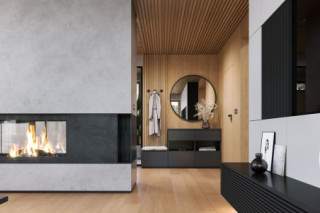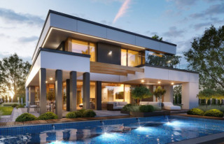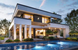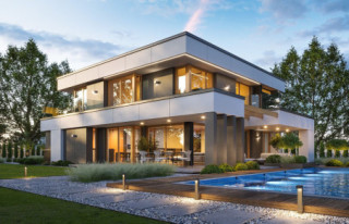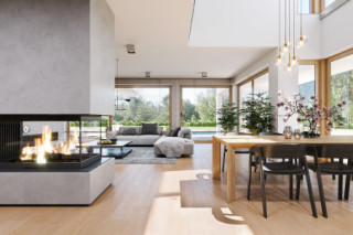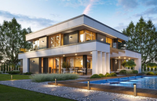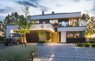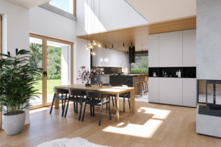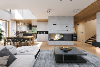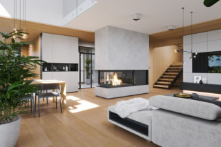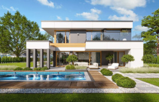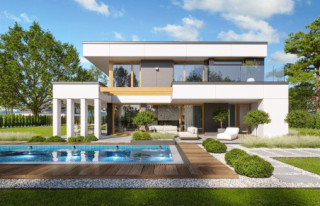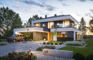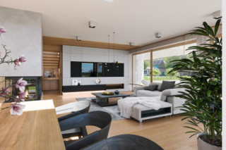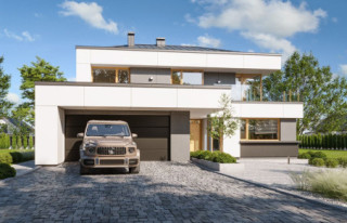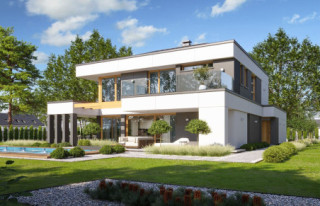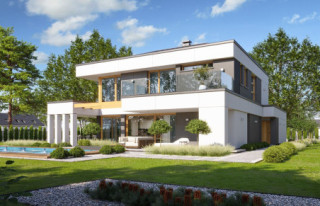 Projekt domu Willa Floryda 8 to kolejny projekt reprezentacyjnego domu piętrowego z serii „Willa Floryda”. Dom został zaprojektowany jako przestronna miejska willa, zbudowana na planie zbliżonym do kwadratu, z wystającą do przodu częścią garażową, dzięki czemu zmieści na węższej parceli - nawet o szerokości 21 metrów. Budynek łączy w sobie zwartą prostopadłościenną bryłę, komfortowe, reprezentacyjne wnętrze, oraz nowoczesną atrakcyjną architekturę z ciekawymi detalami. Willa Floryda 8 jest mniejszym budynkiem od podstawowych wariantów „Floryd”. Ma mniejszą powierzchnię, mniej rozciągnięty rzut, dzięki czemu budynek jest też mniej kosztowny. Układ funkcjonalny domu zbliżony jest do cieszącego się popularnością domu Willa Floryda 3, jednak zaproponowaliśmy tutaj zupełnie inną formę architektoniczną budynku. Podstawowy język detali został zachowany, jak podział fasad na poziome pasy, duże ilości przeszkleń, balkony i tarasy piętra, czy zwieńczenie budynku czterospadowym dachem z szerokim gzymsowaniem. Dodatkowo wprowadziliśmy kolejne architektoniczne smaczki. Przede wszystkim od strony ogrodu dodane zostały piękne zadaszenia części salonu, z przerwą tworzącą półzamknięte wewnętrzne patio, dające mieszkańcom przytulność i intymność. Przedłużenie sufitów parteru w podcieniach okalających tarasy, oraz szerokie przeszklenia między częścią dzienną, a tarasem wywołują efekt zatarcia granicy między wnętrzem domu a przestrzenią na zewnątrz. Wnętrze domu zaaranżowano łącząc poszczególne fragmenty przestrzeni dziennej ze sobą w taki sposób, aby pomieszczenia były duże, a równocześnie przytulne i odpowiednio wyskalowane. Pod względem układu funkcjonalnego wnętrza, dom podzielono na cześć dzienną i techniczno-garażową na parterze, oraz cześć z sypialniami na piętrze. Do budynku wchodzimy szerokim wejściem, z drzwiami z bocznym naświetlem, do wygodnego przedsionka z szatnią. Następnie przechodzimy do otwartego holu, oddzielonego od salonu dwustronnym ozdobnym kominkiem będącym centralnym akcentem całej przestrzeni dziennej. Na część dzienną składają się pomieszczenia salonu – z szeroką ścianą tv i dużym oknem, jadalnia z pustką sufitu i antresolą, oraz obszerna kuchnia z wyspą i spiżarnią. Dodatkowe pomieszczenia parteru to pokój-gabinet, łazienka, oraz garaż z kotłownią. Na piętrze znalazły się 4 sypialnie, w tym apartament master łazienką, garderobą i tarasem, oraz dwie dodatkowe łazienki. Wnętrze można oczywiście dowolnie modelować dostosowując do potrzeb konkretnej rodziny. Budynek zaprojektowano jako energooszczędny, z dobrymi izolacjami i nowoczesnymi instalacjami. Dom łączy w sobie nowoczesny wygląd z prostą konstrukcją i zwartą bryłą, dzięki czemu nie będzie trudny w budowie i powinien być niedrogi w późniejszej eksploatacji. Willa Floryda 8 to propozycja dla Inwestorów planujących budowę wyjątkowego domu dla siebie - wygodnej reprezentacyjnej willi o nowoczesnym stylu. Budynek będzie atrakcyjną oprawą i scenografią codziennego życia, podkreślającą dobry gust jego użytkowników. Dom stawiając Inwestorom wysoko poprzeczkę podczas budowy, odwdzięczy się ciesząc oko i karmiąc codziennie zmysły właścicieli, przyciągając jednocześnie spojrzenia sąsiadów i przechodniów. Willa Floryda 8 do dom dla Inwestorów chcących wyrazić siebie i zaznaczyć swoje przywiązanie do dobrego smaku i jakościowej architektury. Zapraszamy ! Zapraszamy do zapoznania się z pełną ofertą pracowni: projekt domu Willa Floryda, projekt domu Willa Floryda 2, projekt Willa Floryda 3, projekt domu Willa Floryda 4, projekt domu Willa Floryda 5, projekt domu Willa Floryda 6, projekt domu Willa Floryda 7, projekt Rezydencja Floryda, projekt Rezydencja Floryda 2.
