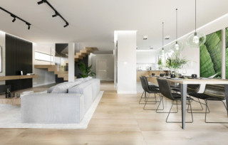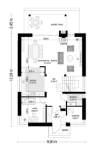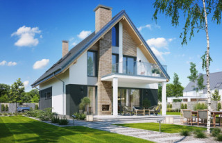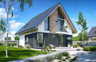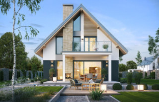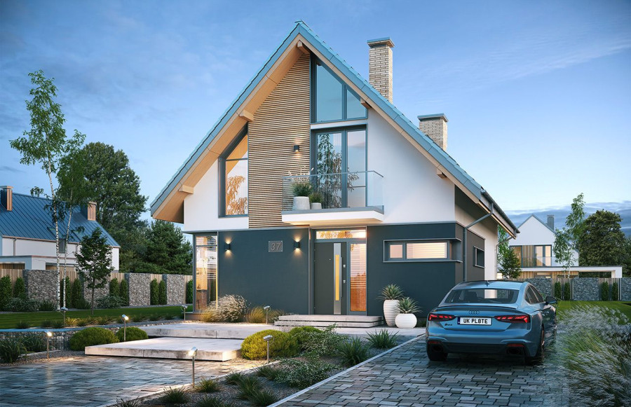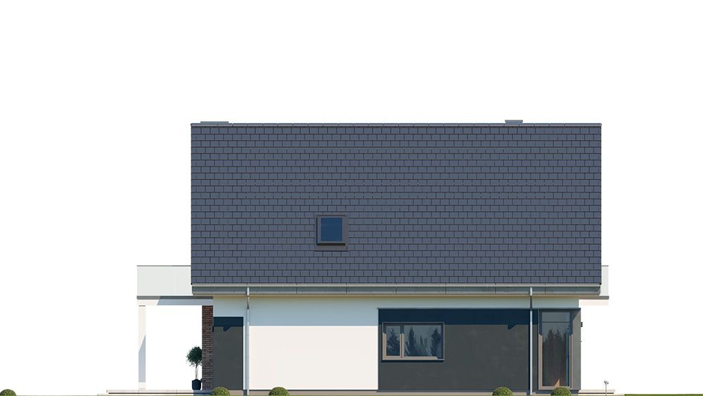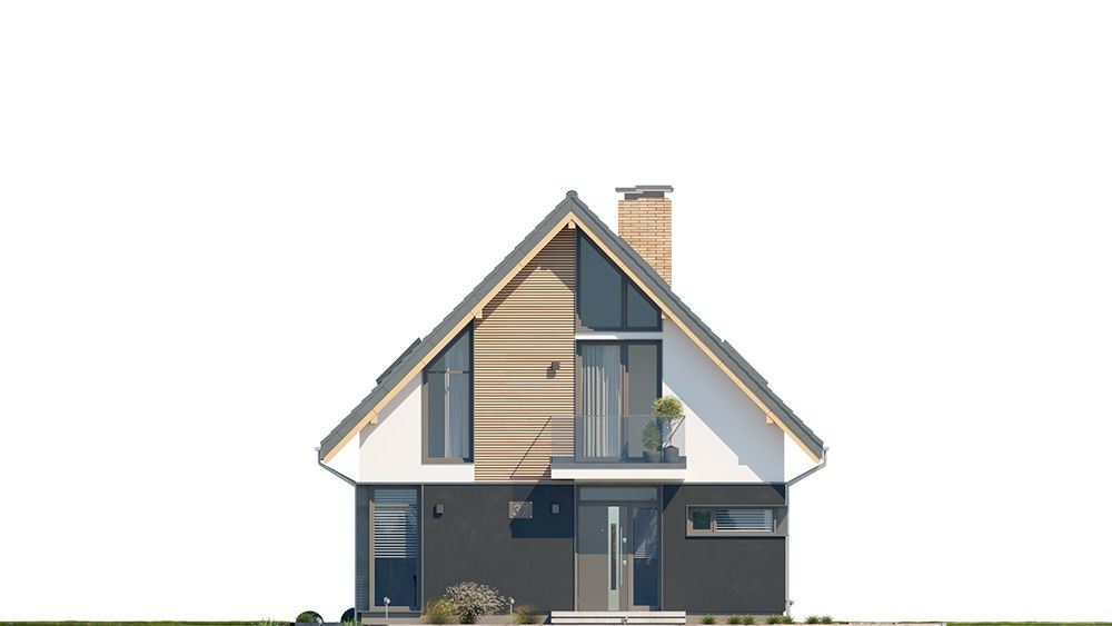Projekt domu Miejski 2 to projekt domu jednorodzinnego parterowego z poddaszem użytkowym z serii projektów ”Miejski”. Dom zbudowany na planie prostokąta, przykryty dwuspadowym dachem z okapami, o prostej sylwetce, nowoczesnej architekturze i stylistyce, w tradycyjnej bryle typowego „dachowca”. To co wyróżnia architekturę budynku i sprawia jest ona oryginalna, to ciekawe detale urozmaicające elewacje, oraz wnętrze domu. Front budynku to ścian szczytowa, podzielona zmieniającą się kolorystyką ścian na dwa poziome pasy. Kontrastowy ciemny tynk podkreśla strefę wejściową do domu. Górna biała elewacja szczytu dodaje budynkowi lekkości. Pionowe pasy okien, oraz okładziny drewnianej dzielą elewację na dodatkowe sekcje. Całość stanowi zgrabną kompozycję, przerywającą monotonię prostej bryły domu. Wejście podkreślono szerokimi drzwiami z naświetlem bocznym, z daszkiem – balkonem nad podestem wejściowym. Duże przeszklenia dodają budynkowi dynamiki i nowoczesności. Od strony ogrodu wprowadzono w ścianie szczytowej masywny komin z podwójnym kominkiem – wewnętrznym i zewnętrznym, obłożony płytkami klinkierowymi. Duże szerokie przeszklenie salonu otwiera pokój dzienny na taras i ogród. Sam taras jest częściowo przykryty zadaszeniem balkonu poddasza. Architektura zewnętrzna domu łączy tradycyjny kształt bryły budynku z nowoczesnością i współczesnym designem, oraz ciekawym zestawieniem materiałowo-kolorystycznym. Wnętrze zaprojektowano dzieląc je na część dzienną na parterze i sypialnie na poddaszu. Do domu wchodzimy przez wygodny przedsionek do holu i części dziennej. Salon podzielony jest na cześć wypoczynkową z dużą ścianę TV, oraz jadalnię z wyjściem na taras przesuwnymi drzwiami HS. Do częściowo otwartej kuchni dostajemy się z holu lub jadalni. Na parterze przewidziano także dodatkowy pokój, łazienkę i kotłownię. Na poddaszu mamy trzy duże sypialnie, oraz wygodną łazienkę. Sypialnia master posiada własną garderobę. Wnętrze można aranżować w dowolny sposób – według koncepcji właścicieli. Nad poddaszem znajduje się jeszcze spory stryszek, który można dowolnie zagospodarować. W domu celowo nie przewidziano garażu, wychodząc z założenia, że szkoda jest powierzchni domu na „salon” dla samochodu – auto stoi na zewnątrz, lub w wolnostojącej wiacie czy garażu. Budynek zaprojektowano jako energooszczędny, z dobrymi izolacjami i nowoczesnymi instalacjami. Dom ma prostą konstrukcję i zwartą bryłę, dzięki czemu będzie łatwy w budowie i niedrogi w późniejszej eksploatacji. Miejski 2 to propozycja dla Inwestorów pragnących zbudować nowoczesny, ciekawy architektonicznie dom o nieprzesadzonej wielkości. Dom dla Inwestorów chcących połączyć funkcjonalność, tradycyjną bryłę i ciekawą nowoczesną architekturę. Zapraszamy do zapoznania się ze wszystkimi domkami z tej serii: https://www.mgprojekt.com.pl/miejski, https://www.mgprojekt.com.pl/miejski-2, https://www.mgprojekt.com.pl/miejski-3, https://www.mgprojekt.com.pl/miejski-4