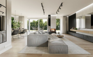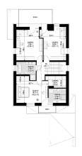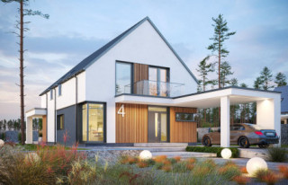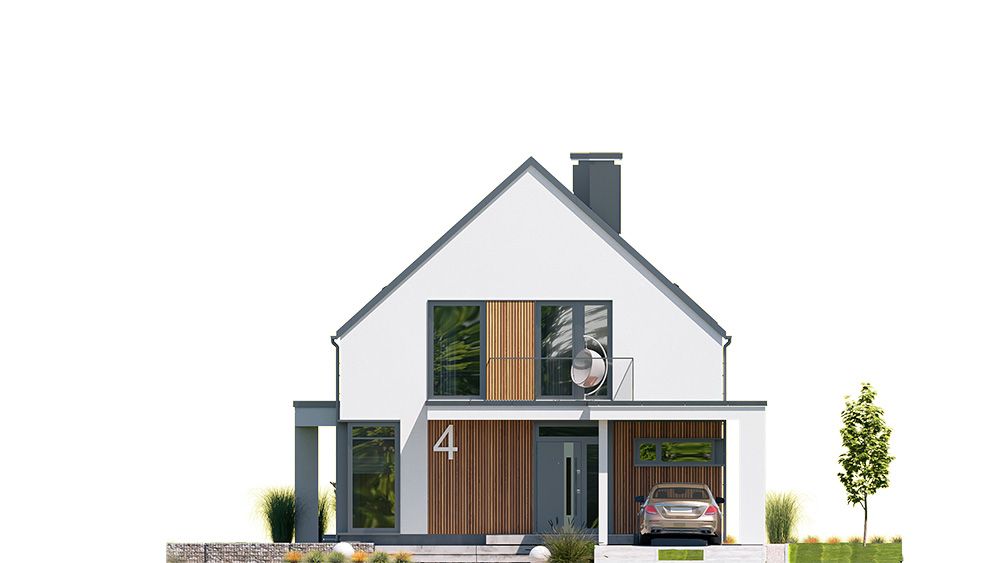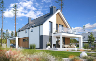 Projekt domu Miejski 4 to projekt z serii projektów ”Miejski” z naszej pracowni. Budynek jednorodzinny parterowy z poddaszem użytkowym zaprojektowany na planie prostokąta, o smukłej sylwetce, nadający się doskonale na wąską parcelę. Dom przykryty jest dwuspadowym dachem bez okapów, o prostej bryle i nowoczesnej architekturze w modnej stylistyce „domu-stodoły”. Dach domu zawieszono dość wysoko na podniesionych ścianach kolankowych, dla zapewnienia maksymalnego wykorzystania powierzchni poddasza użytkowego. Zewnętrzny design domu to połączenie prostoty, czystości formy i ciekawych architektonicznych detali i smaczków. Elewacje podzielono na kontrastujące kolorystycznie pola białych tynkowanych ścian, ścian wykończonych ciemnoszarym tynkiem i fragmentów w pionowej okładzinie drewnianej rombus. Obróbki blacharskie, glify otworów okiennych i ramy okien utrzymano w antracytowym kolorze. Całość kolorystyki domu daje ciekawą, elegancką, czystą architekturę zewnętrzną budynku. Ciekawa kompozycja okien przełamuje monotonię prostopadłościennej bryły. Frontowe i ogrodowe zadaszenia, kryjące wiatę garażową, daszek nad podestem wejściowym, oraz zadaszenie części tarasu od strony ogrodowej, dodatkowo wzbogacają bryłę. Dzięki zachowaniu właściwych proporcji, podziałom elewacji, budynek przyciąga wzrok i ma w sobie coś interesującego – wyróżniającego go spośród wielu podobnych domów z poddaszem. Wnętrze Miejskiego 4 podzielono na część dzienną na parterze i sypialnie na poddaszu. Do domu wchodzimy przez duży przedsionek z szafami do holu i części dziennej. Z holu dostępne są wygodne schody na poddasze użytkowe, widoczne częściowo z pokoju dziennego. Salon podzielony jest na cześć wypoczynkową - z kanapami, ścianą TV, szerokim oknem ogrodowym, ozdobnym kominkiem, oraz jadalnię z dużym stołem i wyjściem na taras przesuwnymi drzwiami. Do przestronnej kuchni dostajemy się z holu lub jadalni. Na parterze zaprojektowano też dodatkowy pokój, łazienkę i kotłownię. Poddasze domu to trzy ładne sypialnie i łazienka. Sypialnia master posiada dodatkowo własną drugą łazienkę i garderobę. Wnętrze można dowolnie aranżować – według koncepcji właścicieli. Nad poddaszem znajduje się sporych rozmiarów strych, do wykorzystania jako domowy magazyn. W budynku nie przewidziano garażu, wychodząc z założenia, że szkoda jest powierzchni domu na „salon” dla samochodu. Natomiast zaprojektowana została zadaszona wiata na samochód, z daszkiem prowadzącym wprost do drzwi wejściowych domu. Budynek zaprojektowano jako energooszczędny, z dobrymi izolacjami i nowoczesnymi instalacjami. Dom ma prostą konstrukcję i zwartą bryłę, dzięki czemu będzie łatwy w budowie i niedrogi w późniejszej eksploatacji. Miejski 4 to bardzo dobra propozycja dla Inwestorów planujących budowę energooszczędnego nowoczesnego domu jednorodzinnego, o nieprzesadzonej skali, jednocześnie funkcjonalnego, o atrakcyjnym przyciągającym wzrok wyglądzie. Domu na wskroś praktycznego, który przez wiele lat będzie wymagał minimalnej obsługi, a tego będzie oryginalny, ciekawy architektonicznie i ponadczasowy. Zapraszamy do zapoznania się ze wszystkimi domkami z tej serii: https://www.mgprojekt.com.pl/miejski, https://www.mgprojekt.com.pl/miejski-2, https://www.mgprojekt.com.pl/miejski-3, https://www.mgprojekt.com.pl/miejski-4