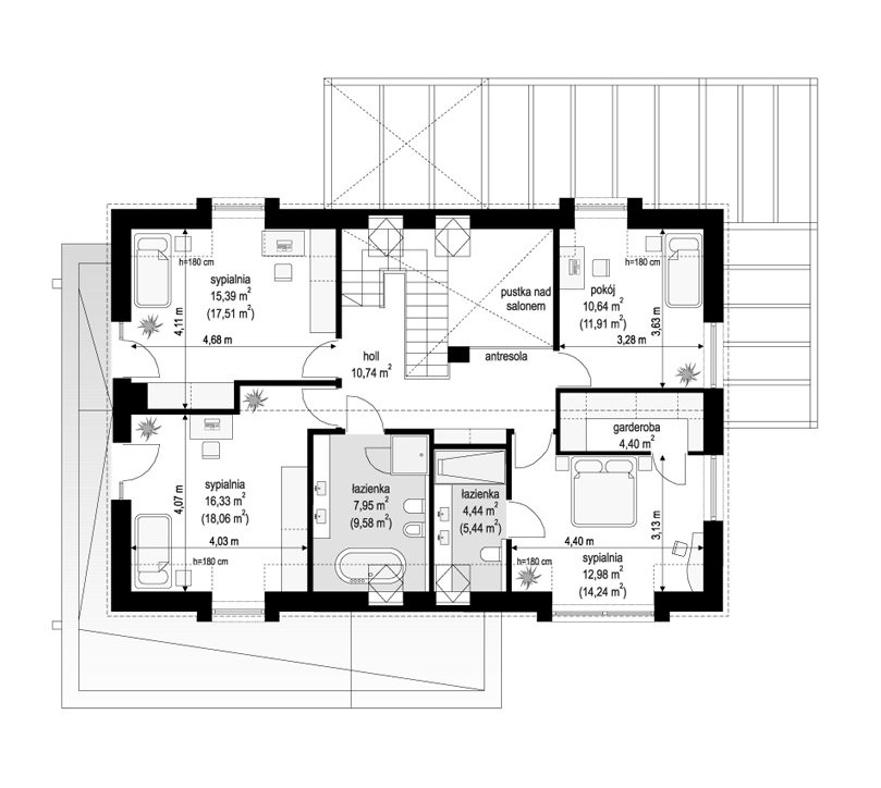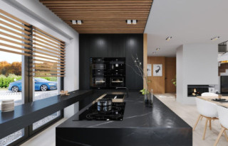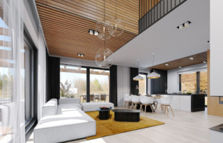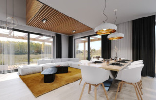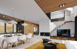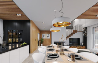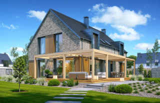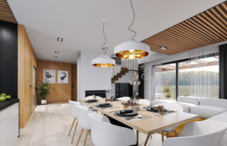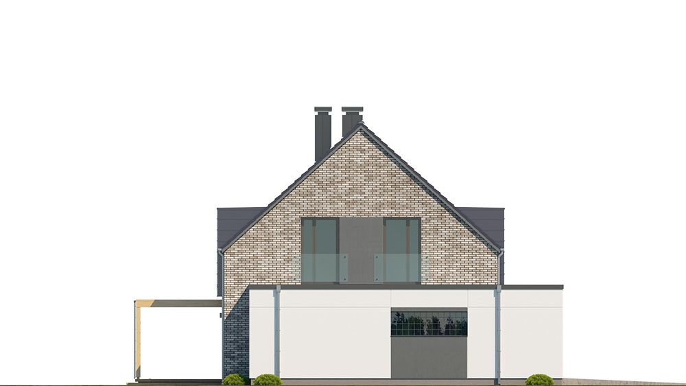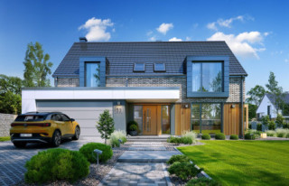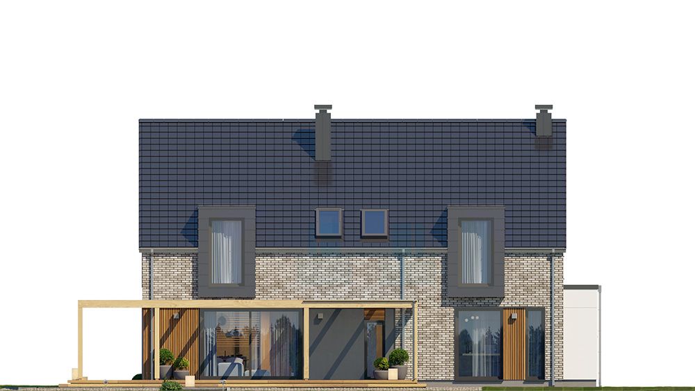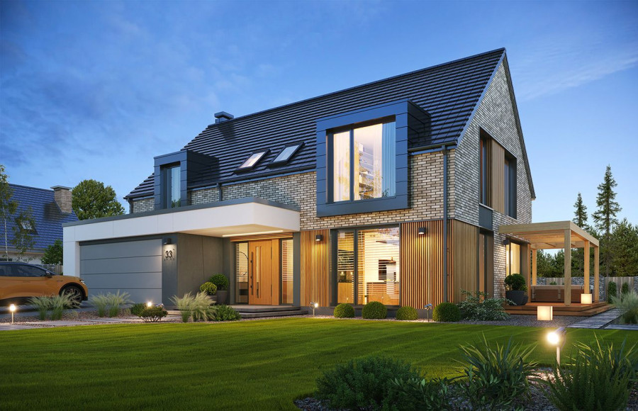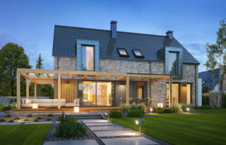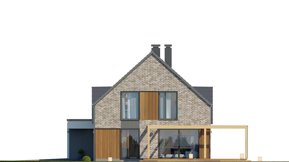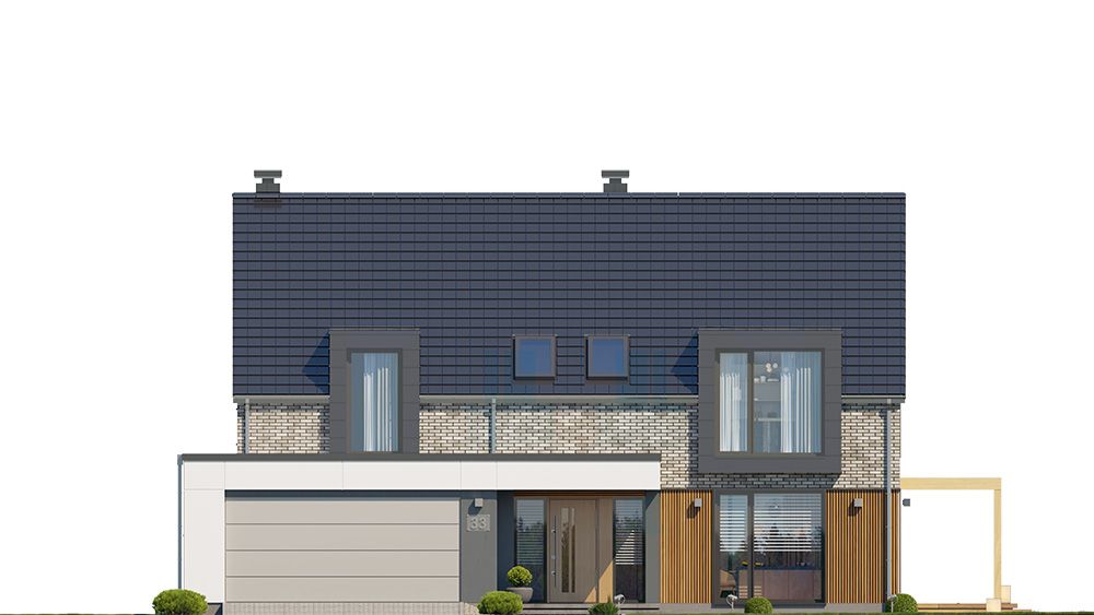 Projekt domu Bolero to projekt domu jednorodzinnego - z naszej serii taneczno-imprezowych domów (Mambo, Lambada, Makarena, Party, Biba, Tango, Salsa, Samba, Rumba, Fokstrot). Bolero to propozycja praktycznego, funkcjonalnego domu jednorodzinnego, parterowego z poddaszem użytkowym, o nowoczesnej architekturze, w popularnej stylistyce domu-stodoły. Budynek wyróżnia zwarta bryła, nowoczesne detale architektoniczne i funkcjonalne wnętrze. Prostokątny plan, z wbudowanym częściowo garażem przykryto dwuspadowym symetrycznym dachem z wysoką ścianą kolankową poddasza. Sylwetkę domu urozmaicono kubicznymi lukarnami poddasza, a całą fasadę podzielono na poziome pasy wykończone kontrastującymi materiałami. Propozycja elewacji to miks płytki klinkierowej, z fragmentami wykończenia drewnem, oraz tynku. Całość kompozycji zwieńcza dach pokryty płaską dachówką. Oczywiście to jedna z możliwych opcji wykończenia domu od zewnątrz – wszystko zależy od inwencji, wyobraźni i preferencji przyszłych właścicieli. Elewację frontową podkreśla reprezentacyjne wejście z szerokimi drzwiami z naświetlami bocznymi, piękne duże okno kuchni z wyspą, oraz lukarny poddasza z dużymi przeszkleniami. Od strony ogrodowej dom ma spokojniejszą bardziej jednorodną fasadę, z dużymi narożnymi przeszkleniami części dziennej i dodaną pergolą zadaszającą taras ogrodowy. Wnętrze domu zaskakuje poczuciem przestrzeni, niełatwym do uzyskania w 150-metrowym domu. Poczucie przestronności części dziennej potęgują duże przeszklenia salonu na taras, oraz pustka nad salonem i schodami, łącząca pokój dzienny z antresolą na poddaszu. Wnętrze jest bardzo nowoczesne. Przykładem może tu być niebanalna kuchnia z dużą wyspą i oryginalnym baletem roboczym przy oknie. Na parterze prócz salonu zaprojektowano dodatkowy pokój z łazienką, oraz garaż z pomieszczeniem technicznym. Na poddaszu przewidziano cztery pokoje z dwiema łazienkami, w tym apartament master z własną łazienką i garderobą. Wnętrze można dowolnie kształtować, ale bez problemu zmieści się tutaj 4- 6-osobowa rodzina. Budynek zaprojektowano jako energooszczędny, z dobrymi izolacjami i nowoczesnymi instalacjami. Dom ma prostą konstrukcję i zwartą bryłę, dzięki czemu będzie łatwy w budowie i niedrogi w późniejszej eksploatacji. Bolero to propozycja dla Inwestorów pragnących zbudować nowoczesny, nietuzinkowy i ciekawy architektonicznie dom o nieprzesadzonej wielkości. Dom dla Inwestorów chcących połączyć tradycyjną funkcjonalność z ciekawymi designerskimi detalami. Zapraszamy do zapoznania się z całą serią "roztańczonych domów": projekt domu Makarena, projekt domu Samba, projekt domu Lambada projekt domu Fokstrot, projekt domu Party, projekt domu Party 2, projekt domu Biba, projekt domu Tango, projekt domu Salsa, projekt domu Rumba, projekt domu Mambo.