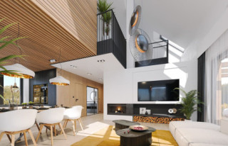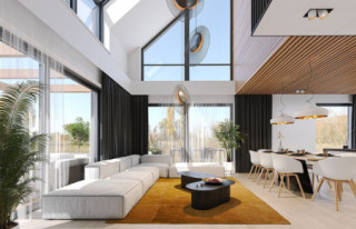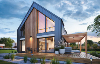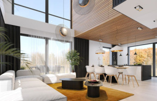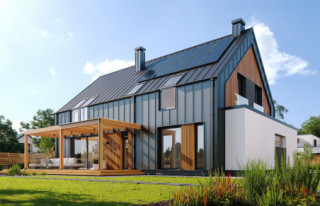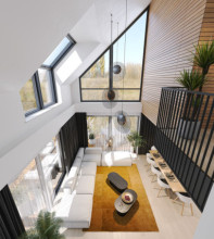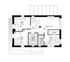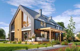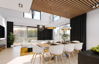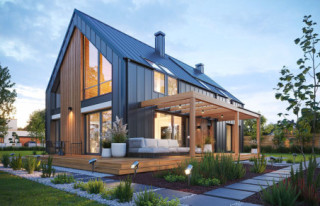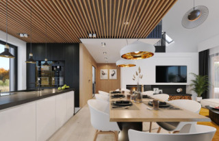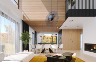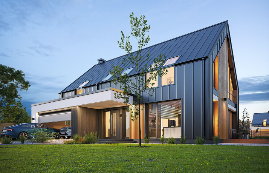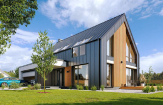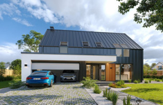 Projekt domu Makarena to projekt nowoczesnej stodoły z naszej serii taneczno-imprezowych domów (Mambo, Bolero, Lambada, Party, Biba, Tango, Salsa, Rumba, Fokstrot). To wyjątkowy projekt w naszej ofercie - tylko dla odważnych Inwestorów, patrzących z wizją i wyobraźnią na swoją przeszłą inwestycję. Makarena to połączenie bezkompromisowej architektury, zamkniętej w nowoczesnej formie domu- stodoły, oraz funkcjonalnego parterowego domku jednorodzinnego z poddaszem użytkowym. Rzut domu na planie prostokąta, z wbudowanym parterowym garażem, wieńczy dwuspadowy symetryczny dach z wysoką ścianą kolankową poddasza. Całość bryły budynku wykończona jest blachą na rąbek stojący - zarówno połacie dachu jak i ściany elewacji bocznych. Jednolitą materiałowo i kolorystycznie bryłę przecinają duże przeszklenia okienne, fragmenty elewacji drewnianej, parterowy garaż od frontu i pergola od strony elewacji ogrodowej. Antracytowy kolor blachy kontrastuje z elementami drewnianymi, z fragmentami elewacji tynkowanej i z szybami otwierającymi wnętrze lub odbijającymi otaczającą dom zieleń. Sylwetka i bryła budynku jest bardzo nowoczesna, bezkompromisowa w swym wyrazie, nietuzinkowa. Dom z pewnością ma oryginalny wyraz i będzie przyciągał spojrzenia. Od strony elewacji frontowej pierwsze skrzypce gra reprezentacyjne wejście do domu - z drzwiami wejściowymi z naświetlami bocznymi, oraz duże okno kuchenne otwierające wnętrze kuchni z wyspą. Strona ogrodowa to piękne przeszklenia salonu, w tym wysokie dwukondygnacyjne okno antresoli, oraz drewniane elementy - taras, okładzina szczytu i pergola, przełamujące monotonię ciemnej blachy. Wnętrze domu zaskakuje poczuciem dużej przestrzeni części dziennej - niełatwym do uzyskania w 150-metrowym domu. Wrażenie przestronności potęgują duże przeszklenia, oraz pustka nad salonem i schodami, łącząca pokój dzienny z antresolą na poddaszu. Wnętrze jest bardzo nowoczesne. Dominują tu trzy przenikające się kolory i materiały : biel ścian, drewno i kontrastujące wstawki w szarości i czerni. Na parterze prócz części dziennej znajdziemy dodatkowy pokój z łazienką, oraz garaż z pomieszczeniem technicznym. Na poddaszu przewidziano trzy pokoje sypialne z dwiema łazienkami, w tym apartament master z własną łazienką i garderobą. Wnętrze można dowolnie kształtować, ale bez problemu zmieści się tutaj 4- 6-osobowa rodzina. Budynek zaprojektowano jako energooszczędny, z dobrymi izolacjami i nowoczesnymi instalacjami. Dom, mimo ekstrawaganckiego wyglądu, ma prostą konstrukcję i zwartą bryłę, dzięki czemu będzie łatwy w budowie i niedrogi w późniejszej eksploatacji. Makarena to propozycja dla Inwestorów pragnących zbudować oryginalny, wyjątkowy dom o ultranowoczesnym bezkompromisowym wyglądzie. Dom, który jest nietuzinkową i wyjątkową scenografią codziennego życia, który sam w sobie podnosi jego jakość, ciesząc zmysły właścicieli i przyciągając zaciekawione spojrzenia sąsiadów i przechodniów. Makarena do dom dla Inwestorów chcących wyrazić siebie i zaznaczyć swój wyraźny i oryginalny ślad. Zapraszamy do zapoznania się z całą serią "roztańczonych domów": https://www.mgprojekt.com.pl/makarena, https://www.mgprojekt.com.pl/bolero, https://www.mgprojekt.com.pl/lambada, https://www.mgprojekt.com.pl/party, https://www.mgprojekt.com.pl/party-2, https://www.mgprojekt.com.pl/biba, https://www.mgprojekt.com.pl/tango, https://www.mgprojekt.com.pl/salsa, https://www.mgprojekt.com.pl/rumba, https://www.mgprojekt.com.pl/fokstrot.