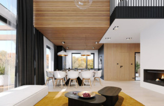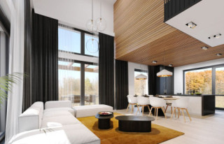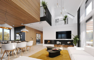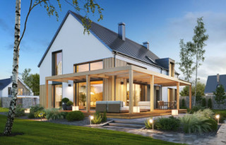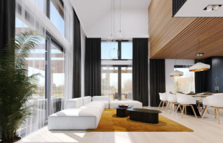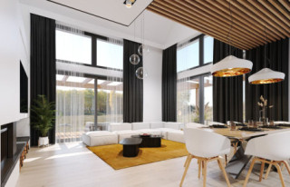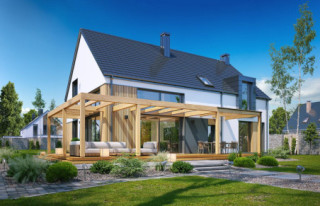 Projekt domu Mambo to kolejna propozycja z naszej serii „imprezowych” domów (projekt domu Makarena, projekt domu Bolero, projekt domu Lambada, projekt domu Party, projekt domu Party 2, projekt domu Biba, projekt domu Tango, projekt domu Salsa, projekt domu Rumba, projekt domu Fokstrot, projekt domu Samba). Projekt domu Mambo to propozycja praktycznego, funkcjonalnego domu jednorodzinnego, parterowego z poddaszem użytkowym, o nowoczesnej architekturze, w popularnej stylistyce domu-stodoły. Bryła budynku i zastosowane detale architektoniczne tworzą nastrój komfortowej wygodnej podmiejskiej willi. Ciekawie zaprojektowane narożne przeszklenia salonu z pustką i antresolą, przełamują monotonię i oczywistość rozwiązań typowych dla domu parterowego z poddaszem i wprowadzają efekt jak w budynku piętrowym. Przeszklenia salonu na dwóch ścianach mają wysokość 1,5 kondygnacji i równej wysokości nadproża, nawiązując tym samym do dwukondygnacyjnych salonów domów piętrowych. Takie rozwiązanie dodaje domowi elegancji i oryginalności, zarówno jego fasadzie, jak i wnętrzu. Prostokątny rzut budynku przykryto dwuspadowym symetrycznym dachem z wysoką ścianą kolankową poddasza, a sylwetkę urozmaicają: od frontu - wbudowany w bryłę parterowy garaż, kubiczne lukarny poddasza i od tyłu - dobudowana pergola przykrywająca taras. Fasada domu została podzielona kolorystycznie i materiałowo na poziome pasy. Mamy tutaj: biel tynkowanych ścian, fragmenty kontrastowe tynku w odcieniach szarości, fragmenty elewacji drewnianej i dach pokryty antracytową płaską dachówką. Wnętrze budynku zaskakuje poczuciem przestrzeni, niełatwym do uzyskania w 150-metrowym domu. Największym zaskoczeniem jest tu pokój dzienny, którego narożne podwyższone okna sprawiają wrażenie jakbyśmy znaleźli się w wysokim salonie domu piętrowego. Pokój dzienny jest bardzo reprezentacyjny i oryginalny. Gubimy tutaj typowy motyw skośnego dachu we wnętrzu domu z poddaszem. Na parterze prócz salonu zaprojektowano dodatkowy pokój z łazienką, oraz garaż z pomieszczeniem kotłowni. Na poddaszu przewidziano trzy pokoje z dwiema łazienkami, w tym apartament master z własną łazienką i garderobą. Wnętrze można dowolnie kształtować, ale bez problemu zmieści się tutaj 4- 6-osobowa rodzina. Budynek zaprojektowano jako energooszczędny, z dobrymi izolacjami i nowoczesnymi instalacjami. Dom ma prostą konstrukcję i zwartą bryłę, dzięki czemu będzie łatwy w budowie i niedrogi w późniejszej eksploatacji. Mambo to propozycja dla Inwestorów pragnących zbudować nowoczesny, ciekawy i oryginalny architektonicznie dom o sensownej skali. Budynek o wysokiej jakości, ale niekoniecznie wielki. Dom dla Inwestorów chcących połączyć tradycyjną funkcjonalność z ciekawymi designerskimi detalami. Zapraszamy do zapoznania się z całą serią "roztańczonych domów" MGProjekt